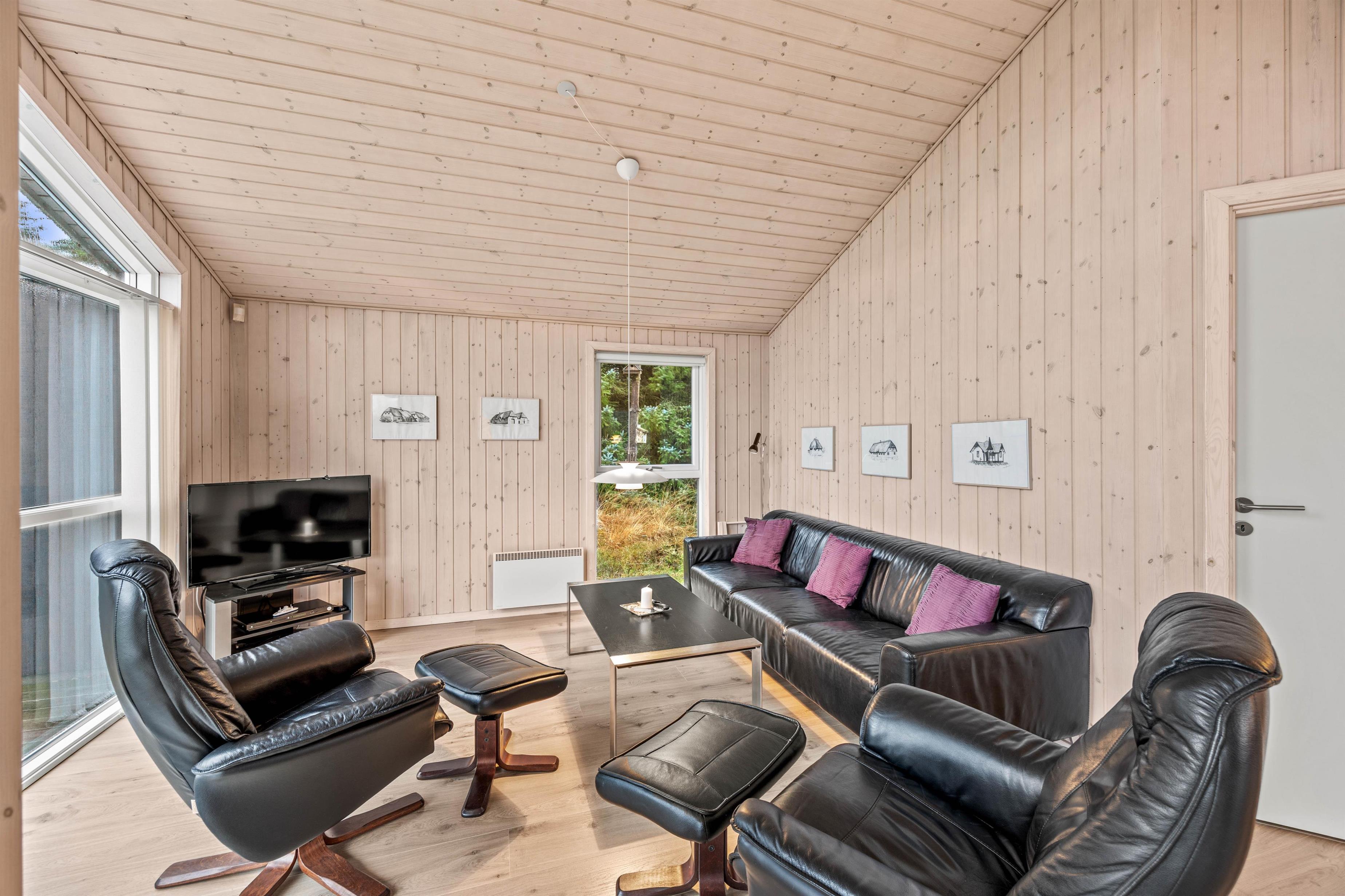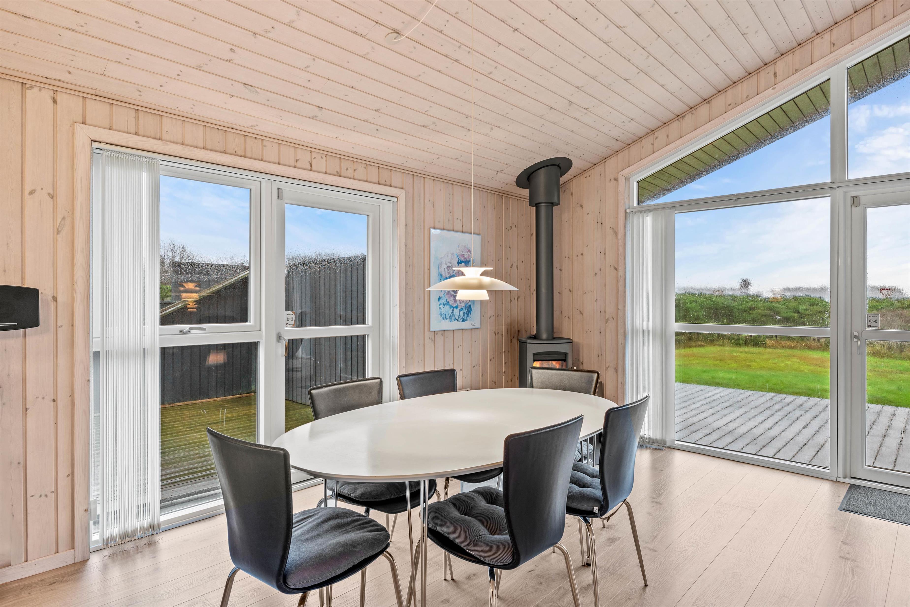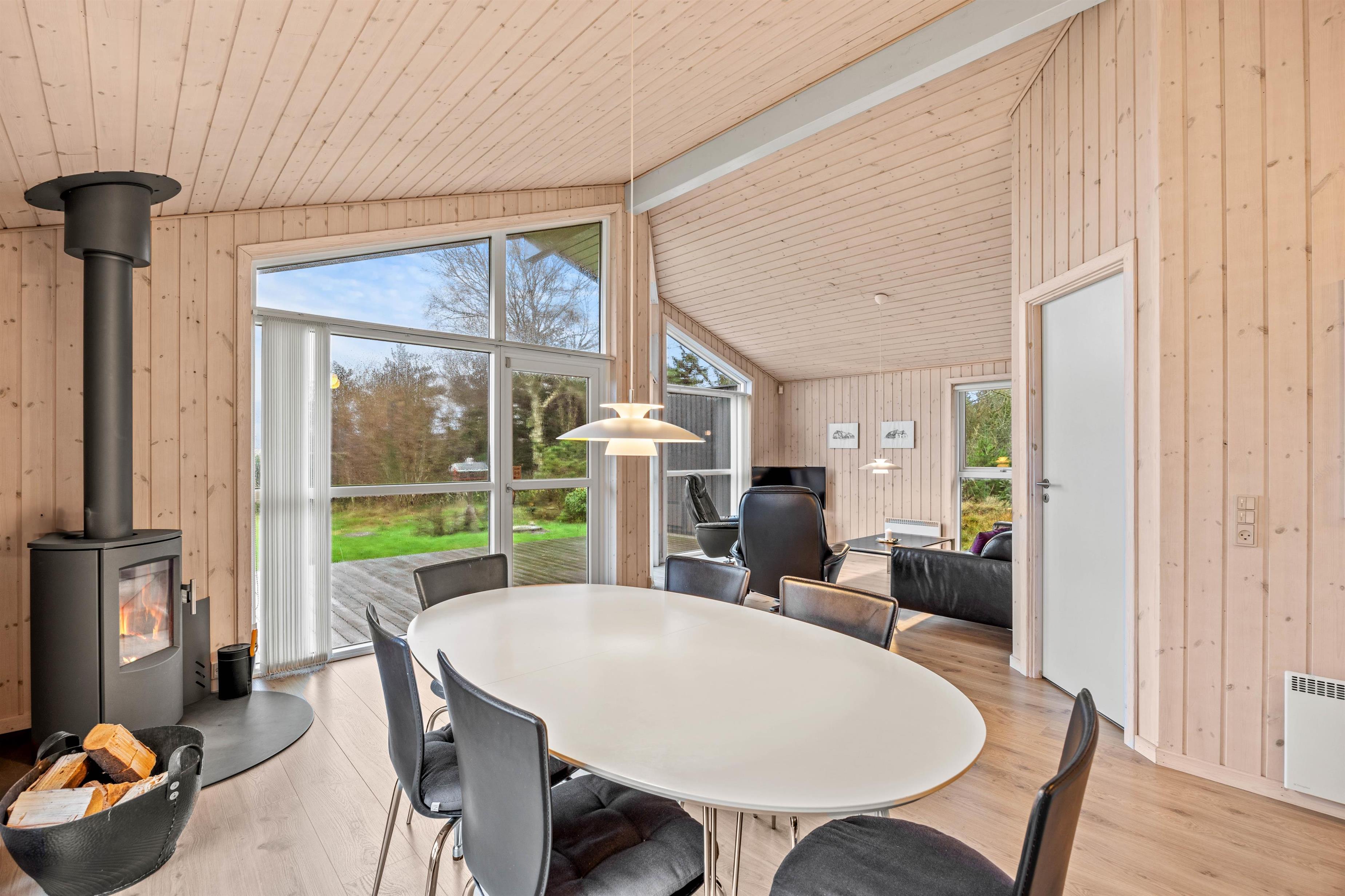 Feriehusets hjerterum er det rummelige alrum, der forener stue, køkken og spiseområde i ét – sommerhusets centrale mødested, hvor der er plads til jer alle. Her er en rar atmosfære og højt til loftet. Her kan I dyste i brætspil omkring spisebordet, holde hyggelige filmaftner eller tilberede jeres yndlingsretter i det åbne køkken. På de køligere dage kan I tænde op i brændeovnen, der spreder hygge.