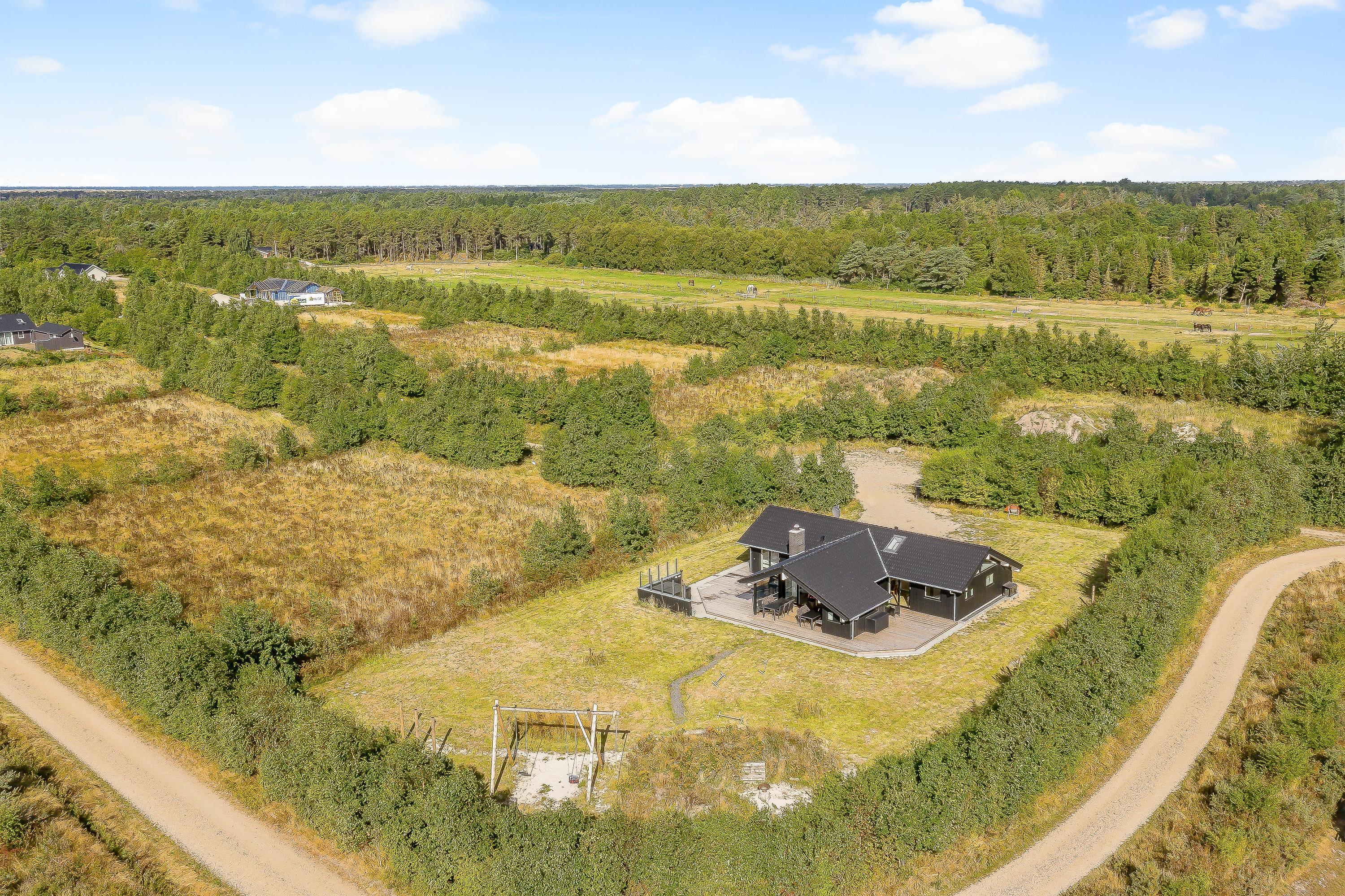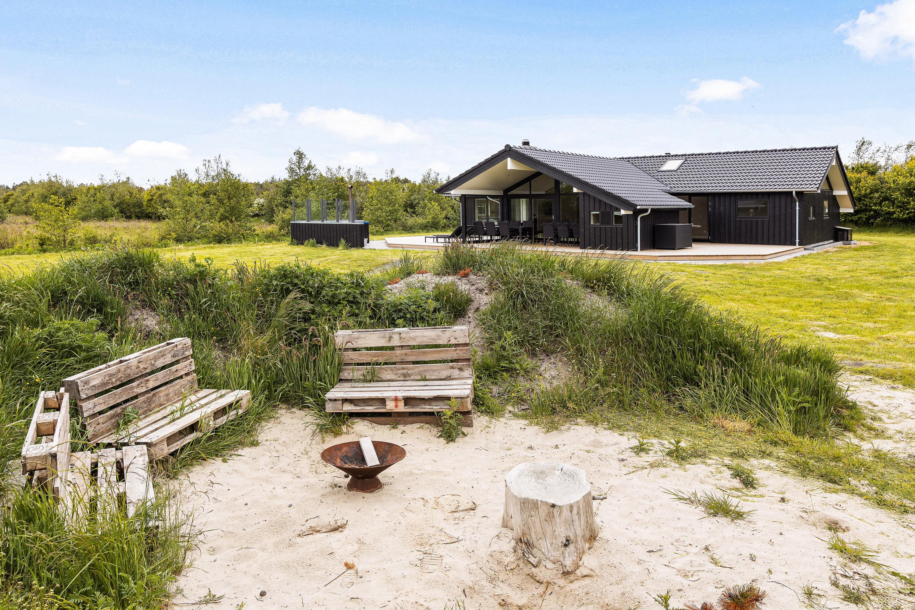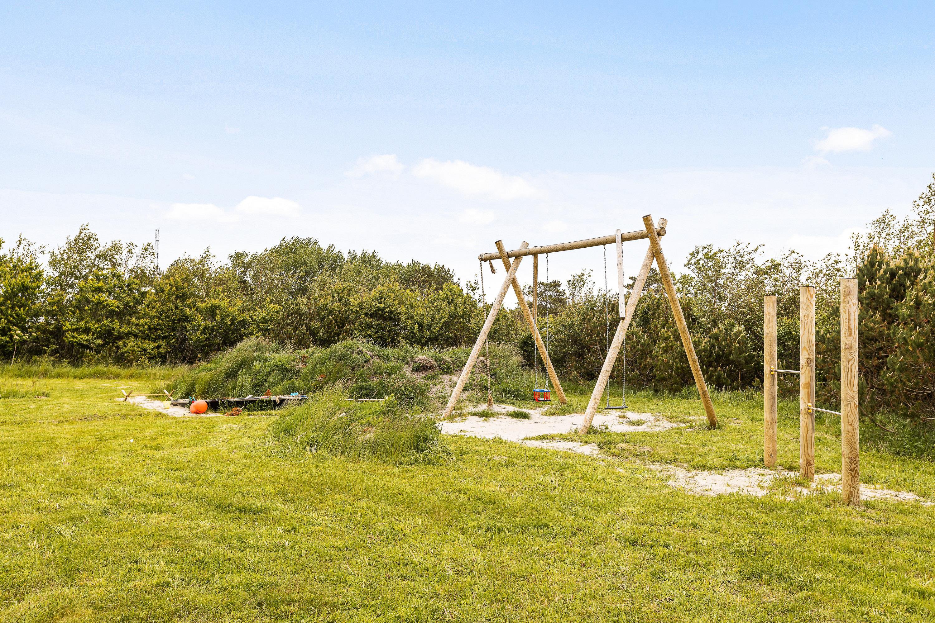 Det moderne feriehus er næsten komplet omgivet af terrasser. Den delvise overdækning betyder, at du altid kan finde en beskyttet plads på terrassemøblerne af høj kvalitet. Her kan du blandt andet læse en god bog på Hollywood-gyngen eller slappe af, mens børnene leger. Der er spændende legemuligheder for de små og masser af plads til at boltre sig på.
