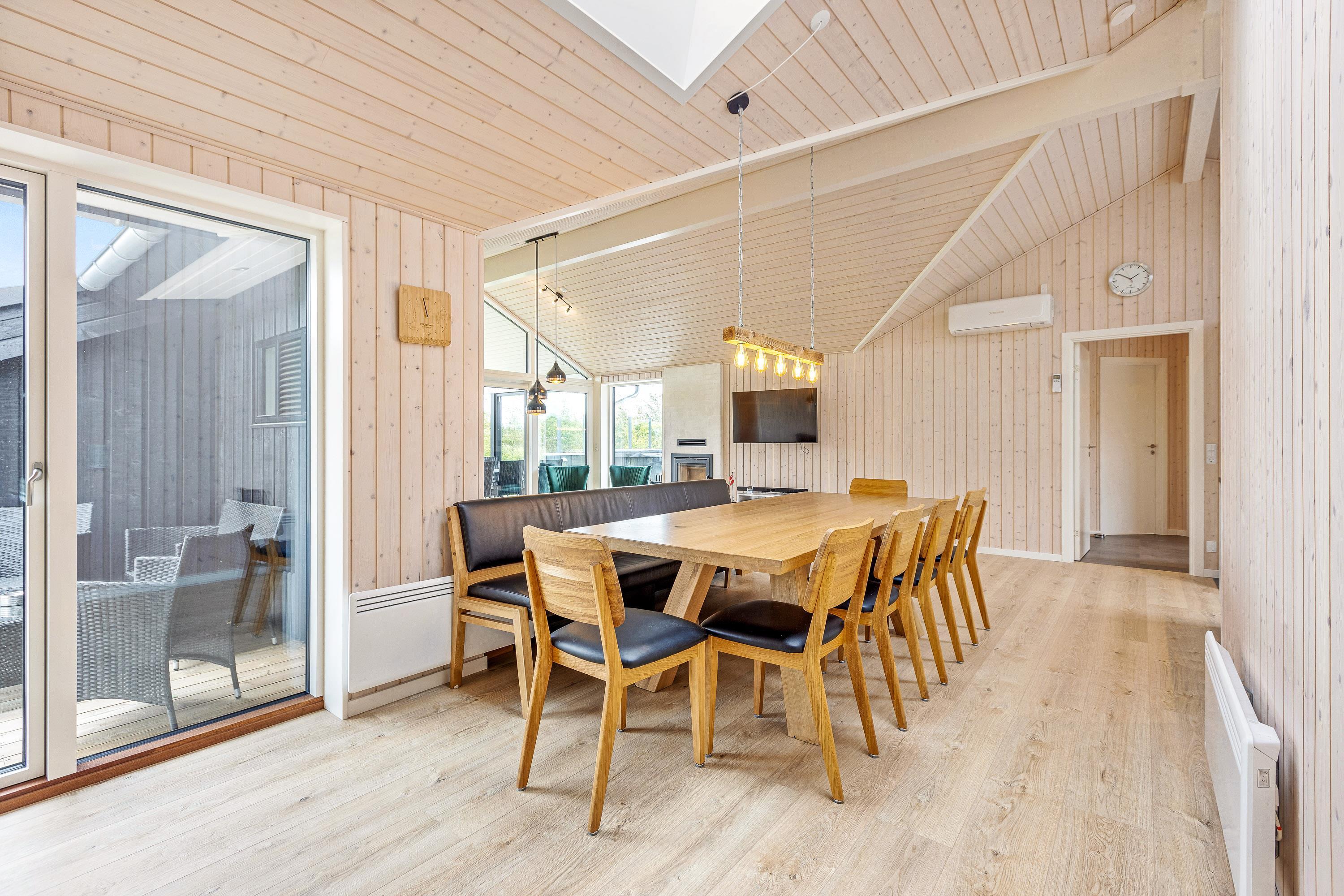 Den tilstødende spiseplads er velegnet til mange hyggelige timer med bræt- eller kortspil med hele familien, og køkkenet er udstyret med opvaskemaskine, mikrobølgeovn, køleskab og en 70l fryser - alt sammen i høj kvalitet - hvilket indbyder til fælles madlavning.