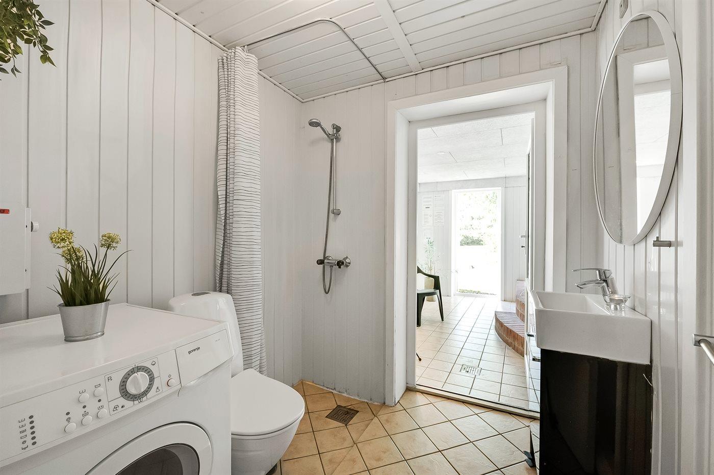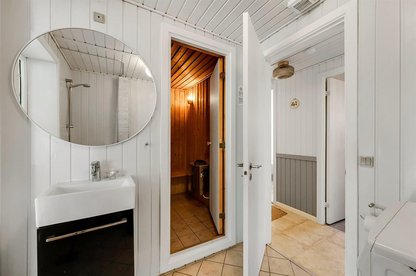 Der er 2 badeværelser med bruseniche og 2 toiletter I saunaen er der mulighed for afslapning.