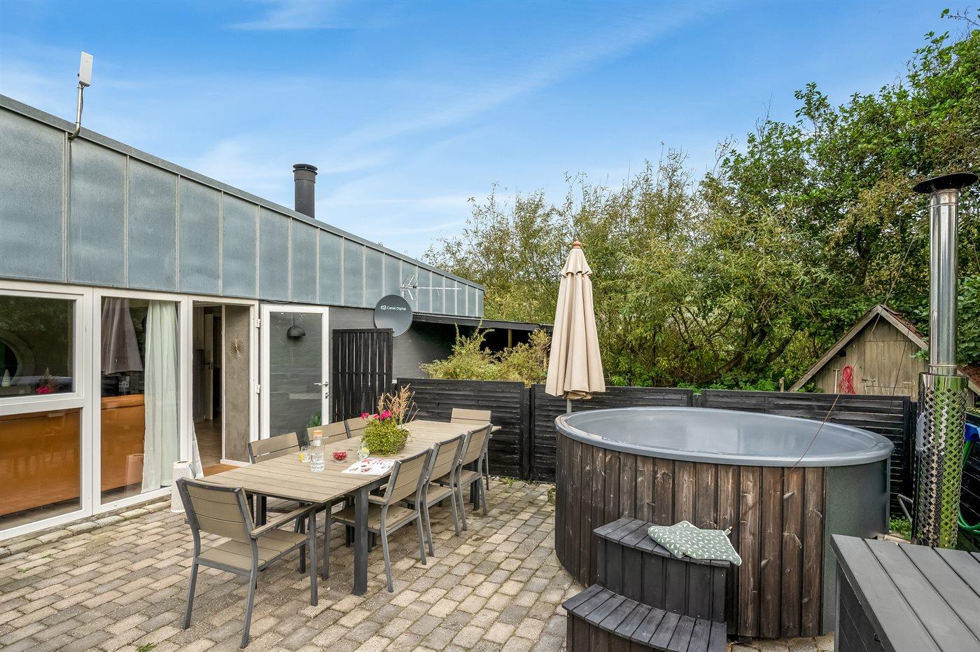 Rummeligt sommerhus på lukket vej med plads til 8 personer og op til 3 hunde. Huset fremstår lyst og venligt i sin indretning og rummer 2 badeværelser. Her er der lagt op til wellness i sauna og vildmarksbad og en dukkert i husets børnevenlige swimmingpool. Den store, ugenert beliggende have byder på masser af legemuligheder.