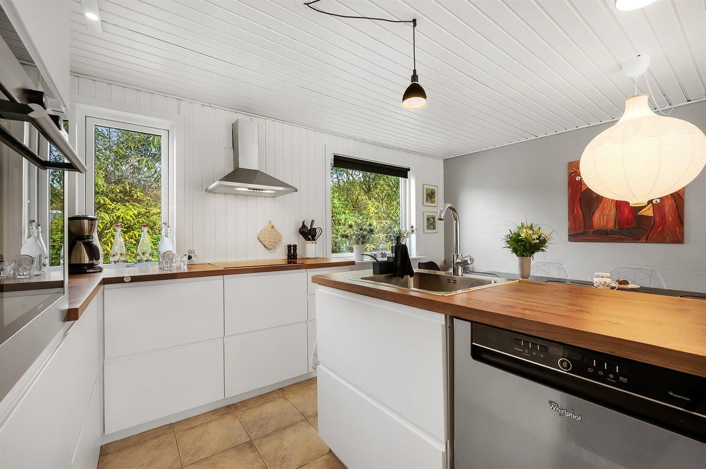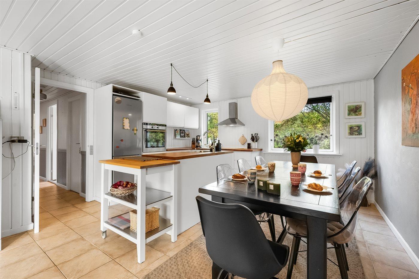 Køkkenet er udstyret med 1 køleskab. Der er 4 keramiske kogeplader, varmluftovn, mikrobølgeovn samt opvaskemaskine.