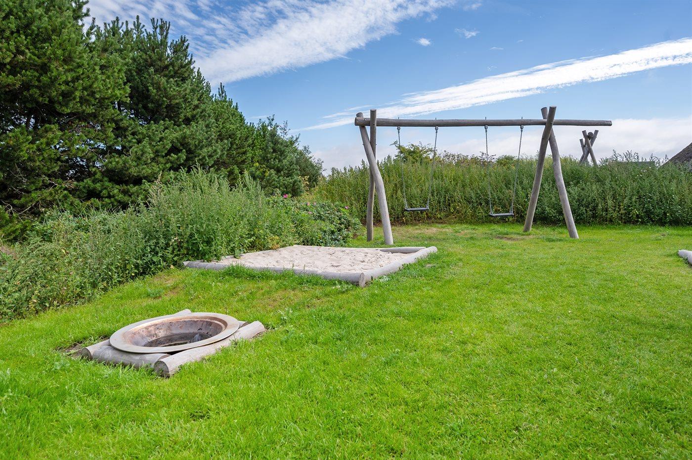 Ferieboligen er beliggende på en 3659 m² stor naturgrund. Der er 950 m til havet. Nærmeste forretning er beliggende i en afstand af 1400 m. Der er en golfbane i en afstand af 3000 m. Til ferieboligen hører 50 m² terrasseareal. Desuden er der 10 m² overdækket terrasse. Gynge. Sandkasse. Bålsted. Der er installeret stik til opladning af elbil. Med 11 kW ladeeffekt. Parkering ved ferieboligen.