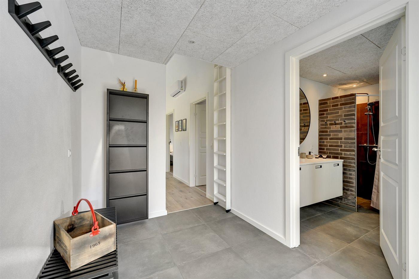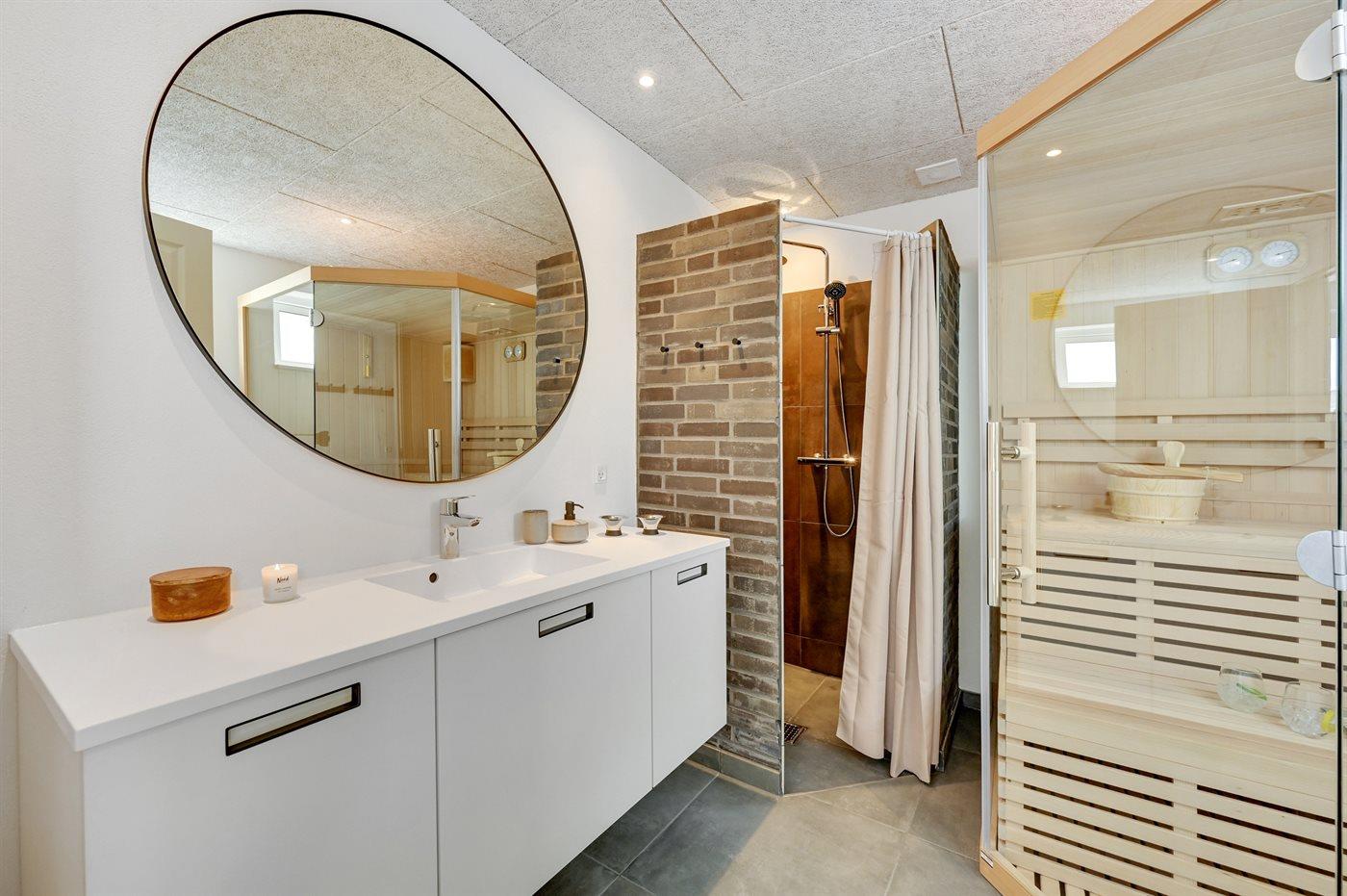 Der er 2 badeværelser med bruser og 2 toiletter. Der er gulvvarme på 2 badeværelser. I saunaen er der mulighed for afslapning.