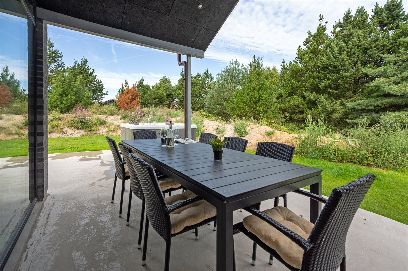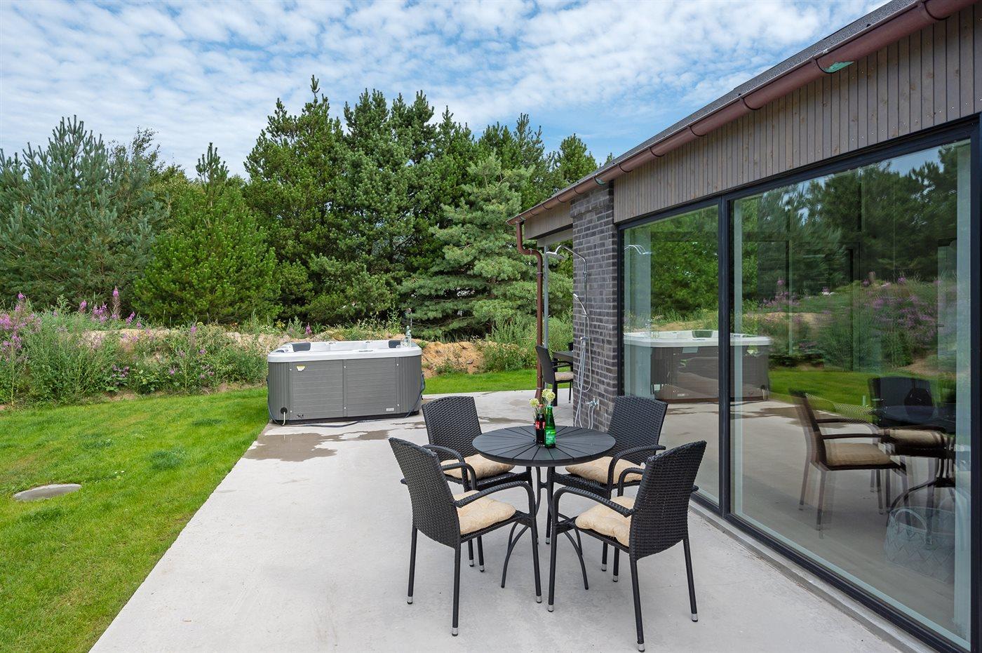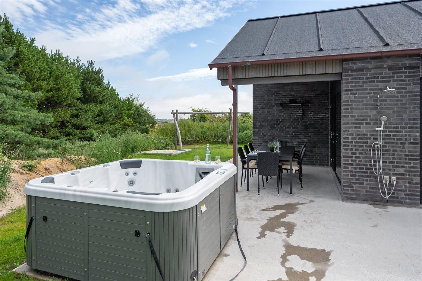Til huset hører et stort og dejligt, delvist overdækket terrasseareal med hyggekroge og ikke at forglemme en skøn 7- pers. udendørs spa med standvand, som kan benyttes hele året rundt.