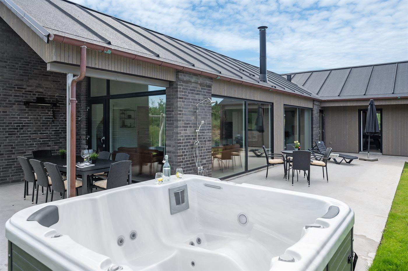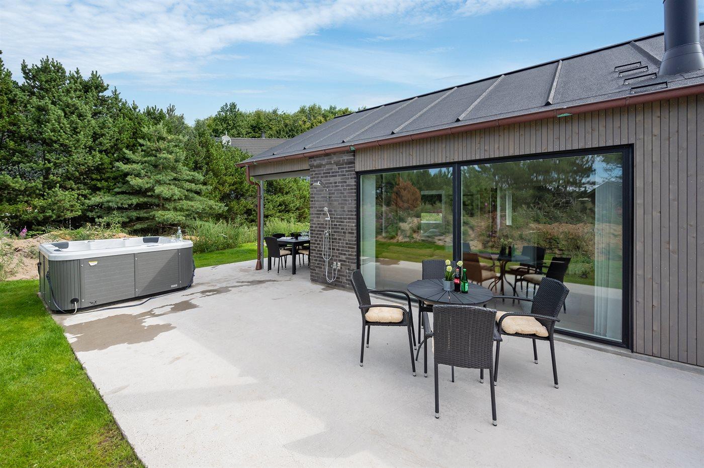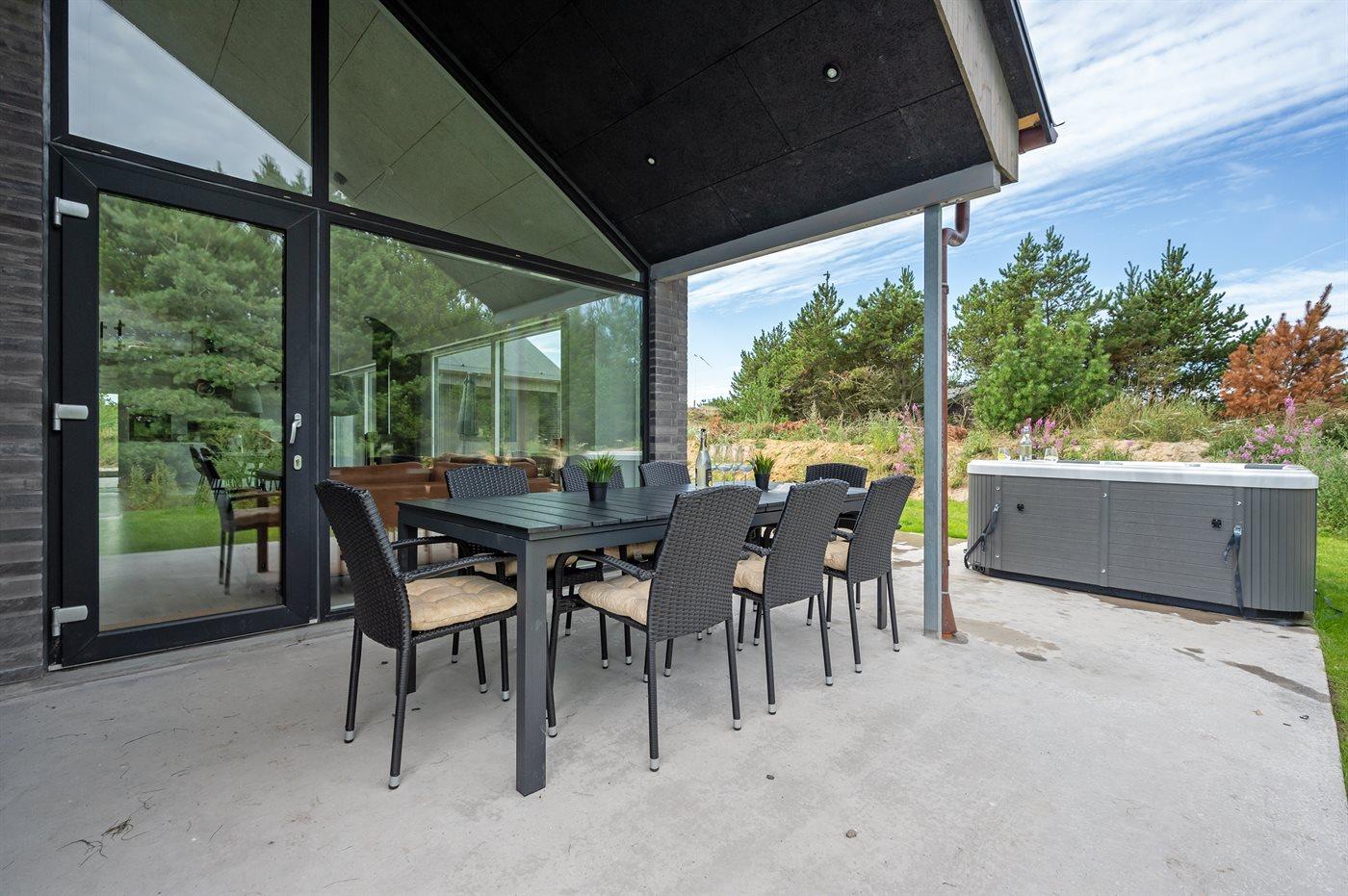 Til huset hører et stort og dejligt, delvist overdækket terrasseareal med hyggekroge og ikke at forglemme en skøn 7- pers. udendørs spa med standvand, som kan benyttes hele året rundt.
