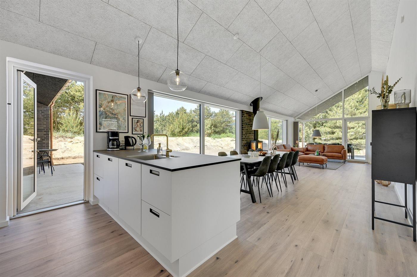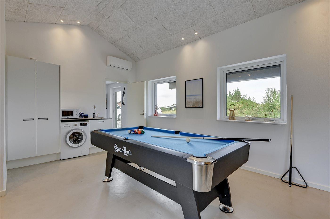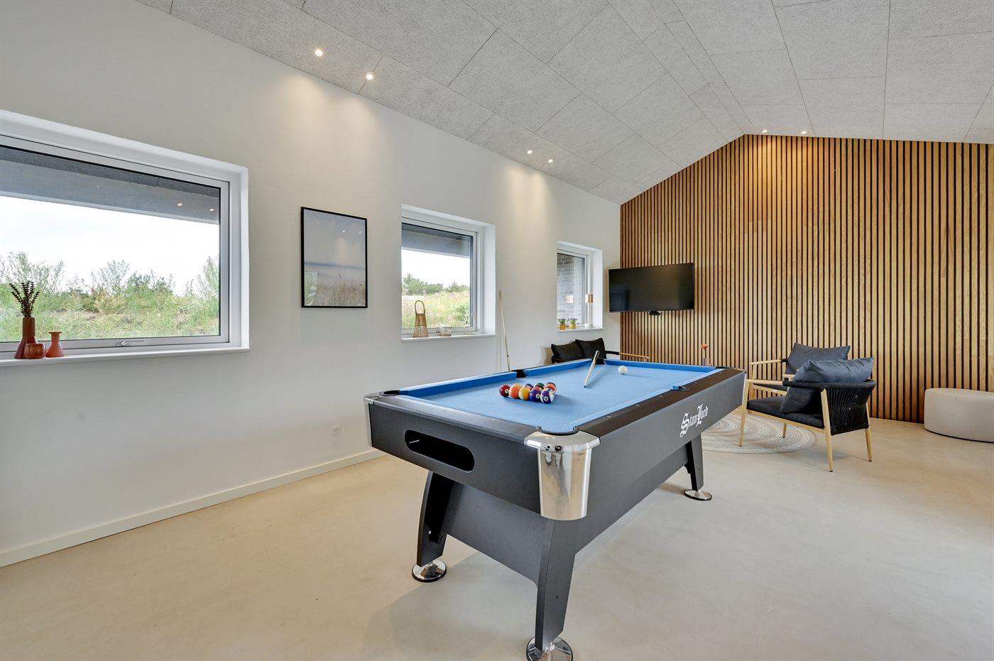 Det rummelige sommerhus er holdt i lyse farver og bl.a. indrettet med et stort aktivitetsrum med billardbord og loungemøbler.