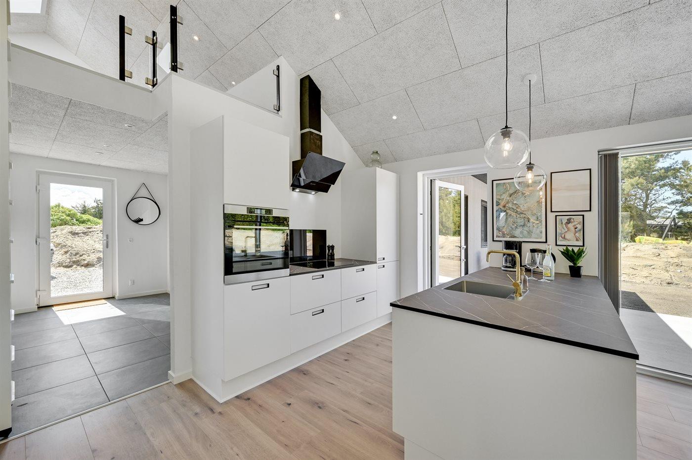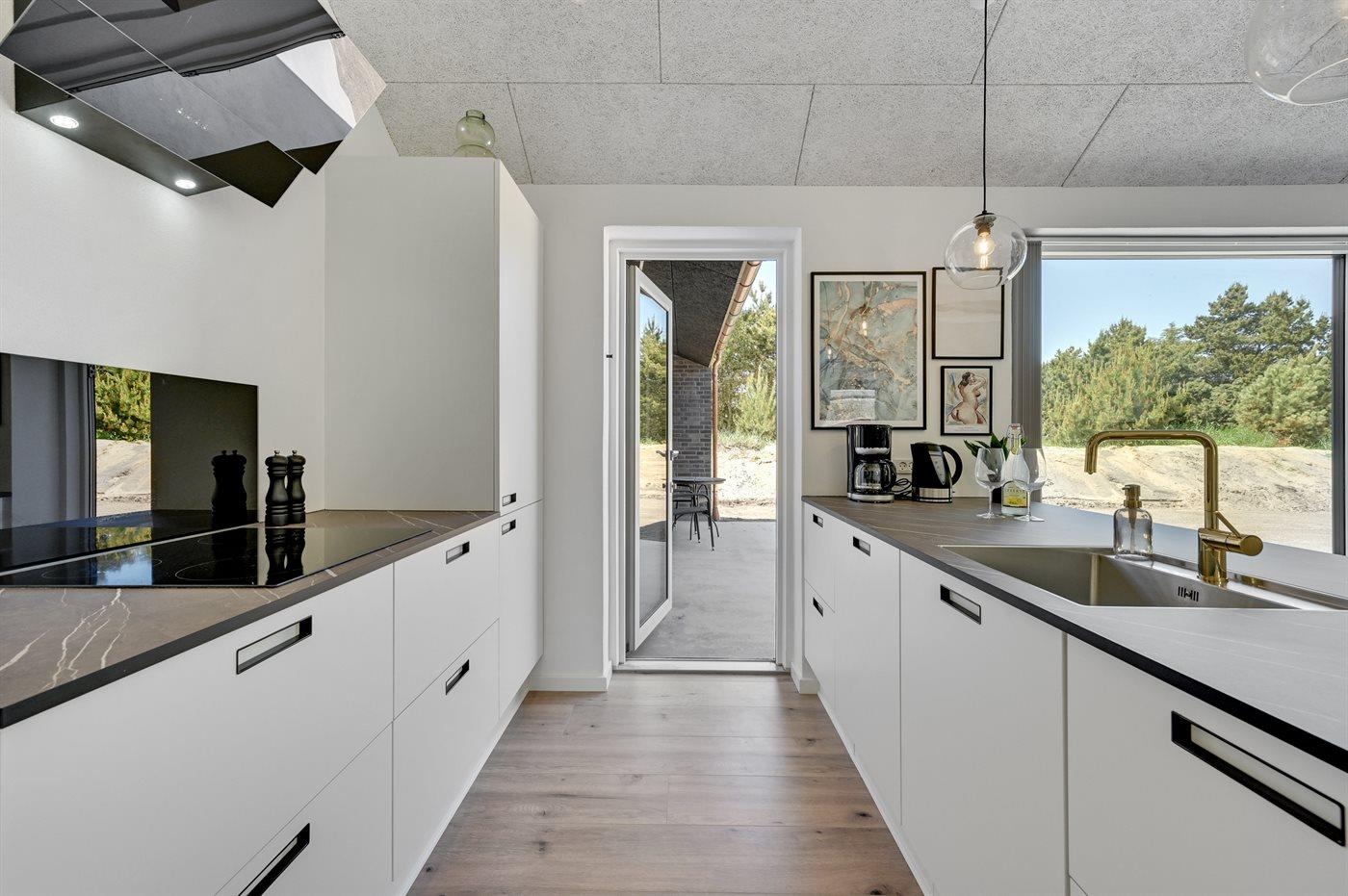 Køkkenet er udstyret med 1 køleskab. Der er 4 induktionskogeplader, varmluftovn, mikrobølgeovn samt opvaskemaskine.