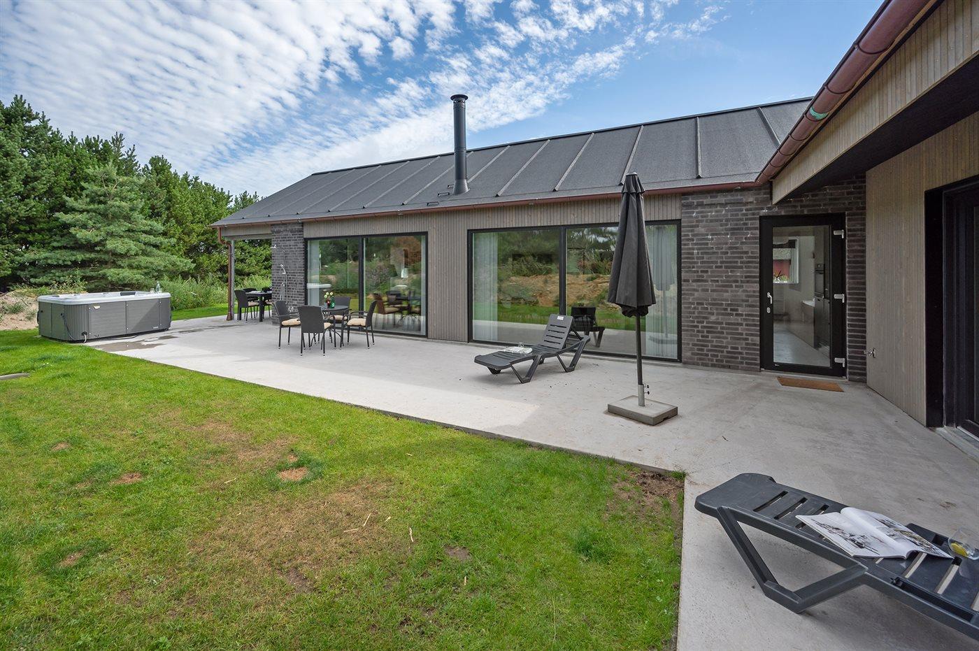 Nybygget sommerhus i Søndervig med stor terrasse, udendørs spa og aktivitetsrum tæt på stranden.