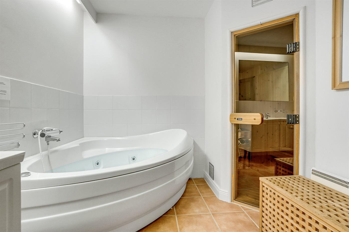 Huset har et separat toilet med håndvask, så der er god mulighed for at nyde wellness i det store badeværelse ved siden af. Badeværelset har spabad, en lille sauna, bruseniche samt gulvvarme. Desuden er der både vaskemaskine og tørretumbler placeret i skabe i badeværelset.