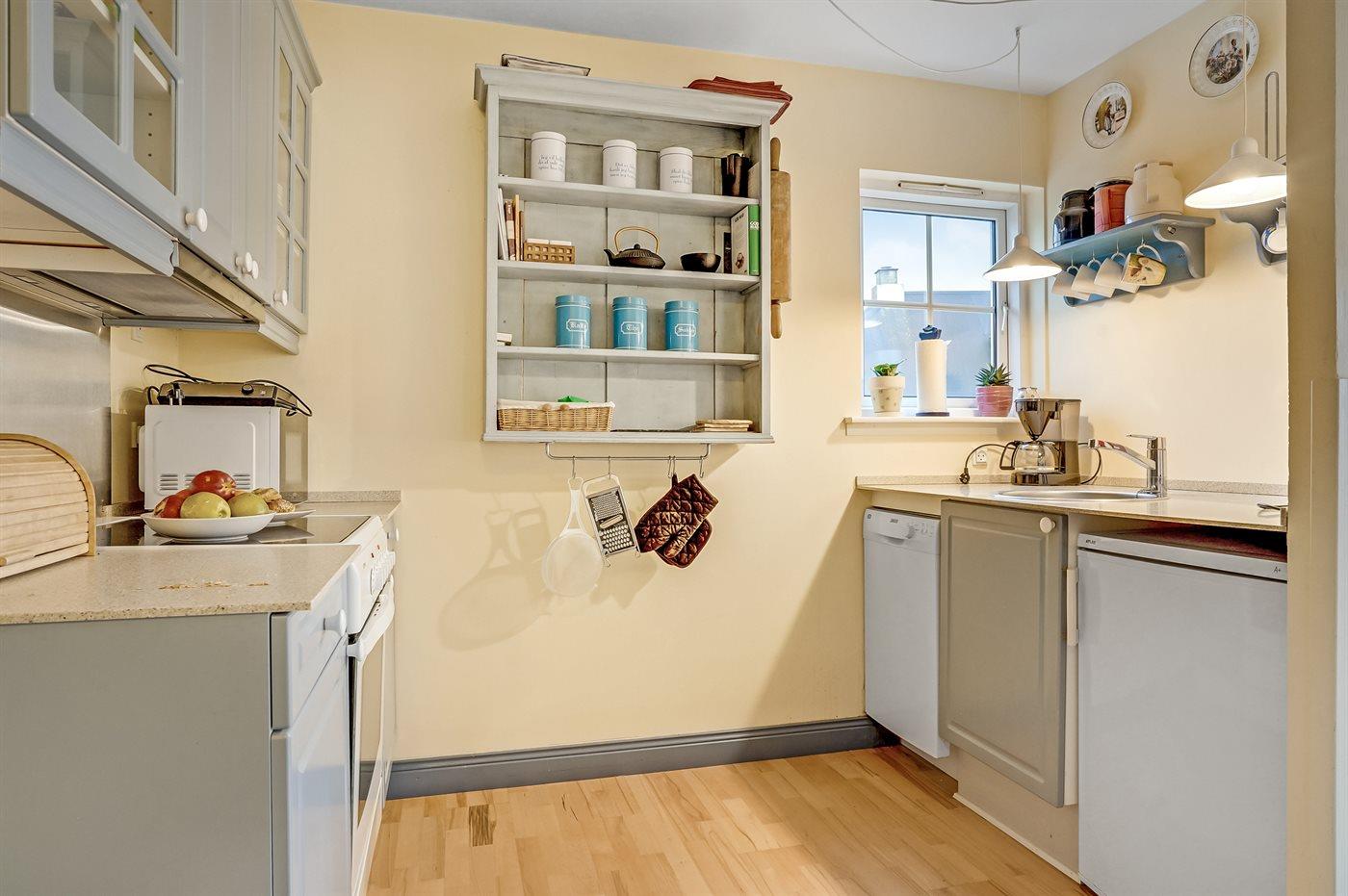 Køkkenet er veludstyret med diverse service, kaffemaskine, elkedel samt et stort køle-fryseskab, et induktionskomfur med ovn, mikrobølgeovn og opvaskemaskine.