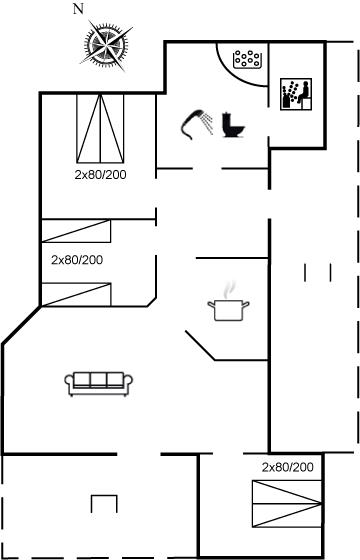 Der er i alt 3 soveværelser. Sovepladserne fordeler sig på: 4 sovepladser i dobbeltsenge. 2 sovepladser i enkeltsenge.