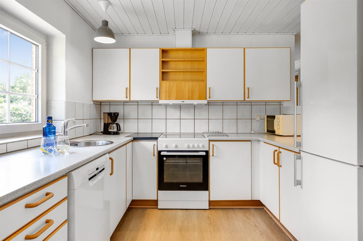 Køkkenet er udstyret med 1 køleskab. Der er 4 keramiske kogeplader, varmluftovn, mikrobølgeovn samt opvaskemaskine.