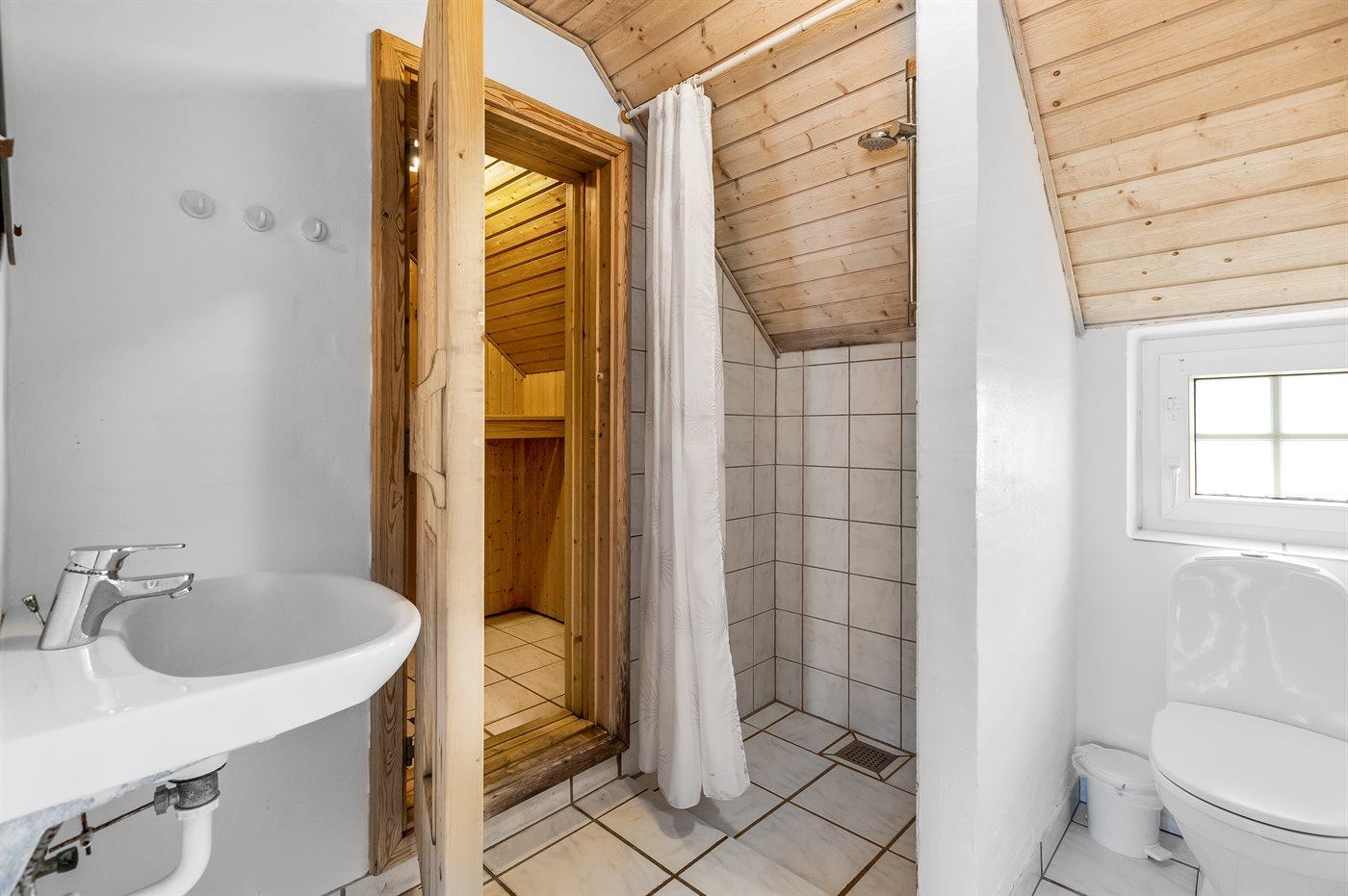 Der er 3 badeværelser med bruseniche og 3 toiletter. Der er gulvvarme på 3 badeværelser. I saunaen er der mulighed for afslapning.