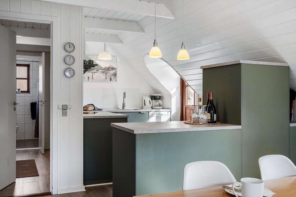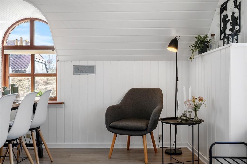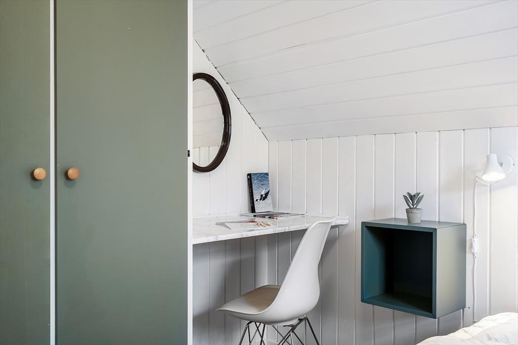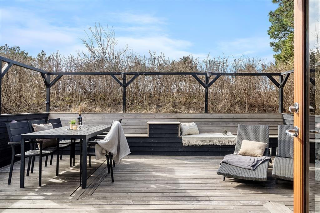 I sommerhuset er der varmepumpe med køleeffekt – men I kan også åbne havedøren op på vid gab, når det er sommerligt i vejret. Det giver jer også mulighed for frit at bevæge jer mellem stuen og terrassen, der med delvis afskærmning, en indbygget bænk og gode havemøbler fungerer som en skøn oase på solrige dage.
