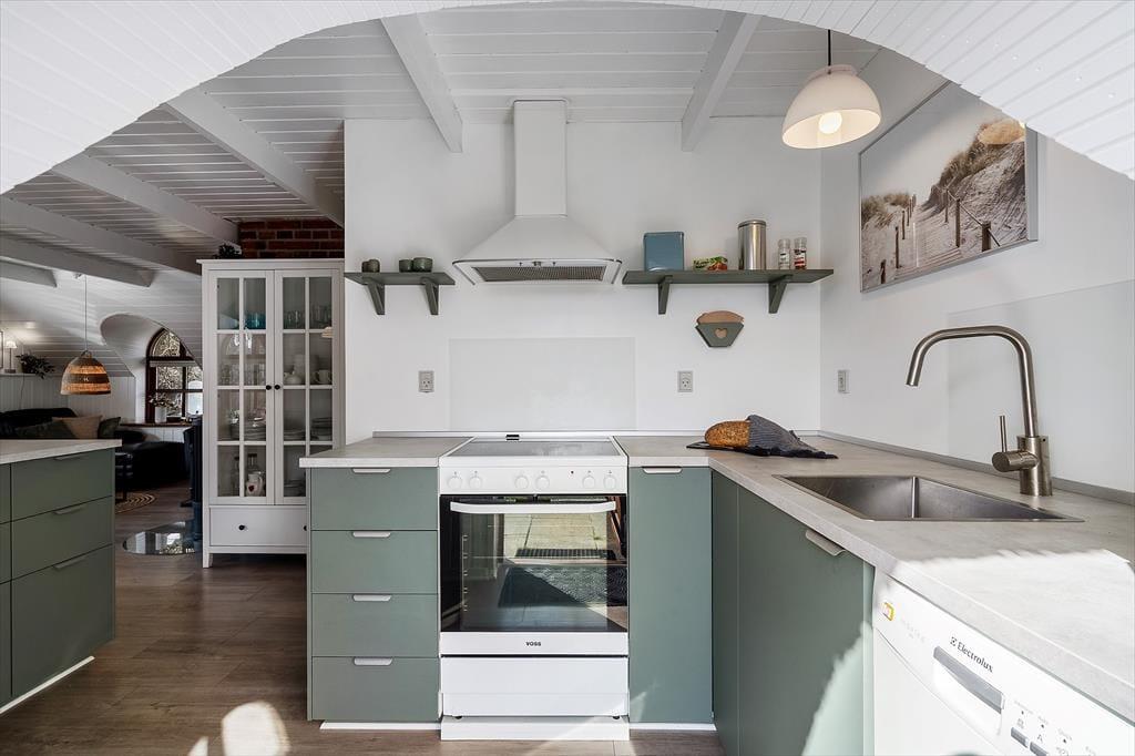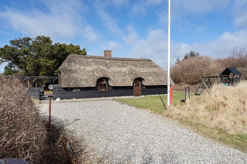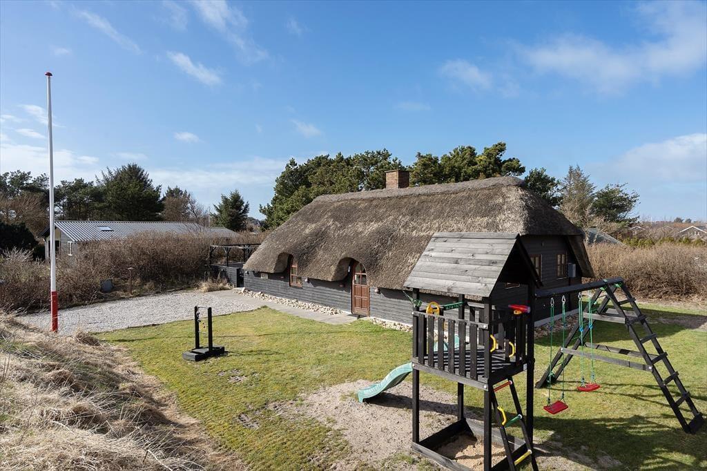 Det stråtækte sommerhus har stået her i Søndervig siden 1978, og i 2021 blev det opgraderet med nyt køkken og mange andre forbedringer, så I får en hyggelig og velfungerende ramme om ferielivet. Netop køkkenet ligger i åben forbindelse med stuen, så madlavningen kan nemt indgå i det sociale samvær. Midt i stuen står en hygge- og varmespredende brændeovn, og et fladskærms-tv med Chromecast hænger på væggen nær sofaafsnittet. Fra en fordelingsgang har I adgang til et praktisk brusebadeværelse og tre gode soveværelser, der alle er udstyret med garderobeskabe.
