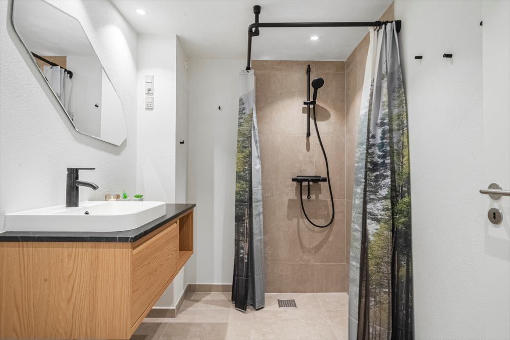 Vi oplever ofte, at netop denne fleksibilitet er noget, familier sætter pris på – særligt efter en dag fyldt med strandture, aktiviteter og oplevelser i byen. Køkkenet er integreret i opholdsarealet og giver mulighed for at være sammen, mens madlavningen står på. Soveværelset er roligt og behageligt, og her kan du trække dig tilbage og lade op til endnu en dag med udsigt til frihed og feriestunder. Det hele fremstår nemt og indbydende, så du kan fokusere på det vigtigste: at nyde ferien.