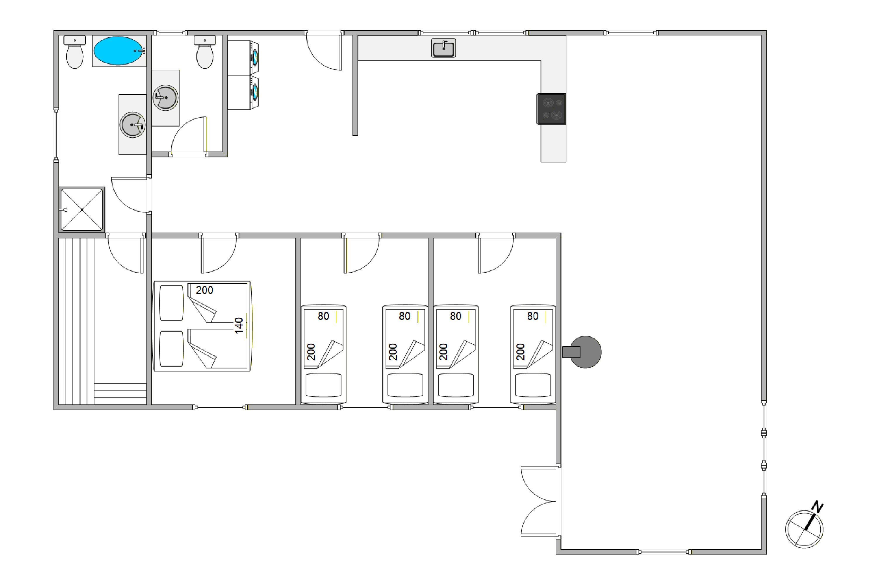 Huset har 3 soveværelser: ét med dobbeltseng og to med hver 2 enkeltsenge, så alle kan sove komfortabelt. Derudover er der 1 badeværelse og 1 gæstetoilet – begge med gulvvarme. Badeværelset har desuden spabad og sauna, som giver mulighed for total afslapning og en næsten ægte wellnessoplevelse.