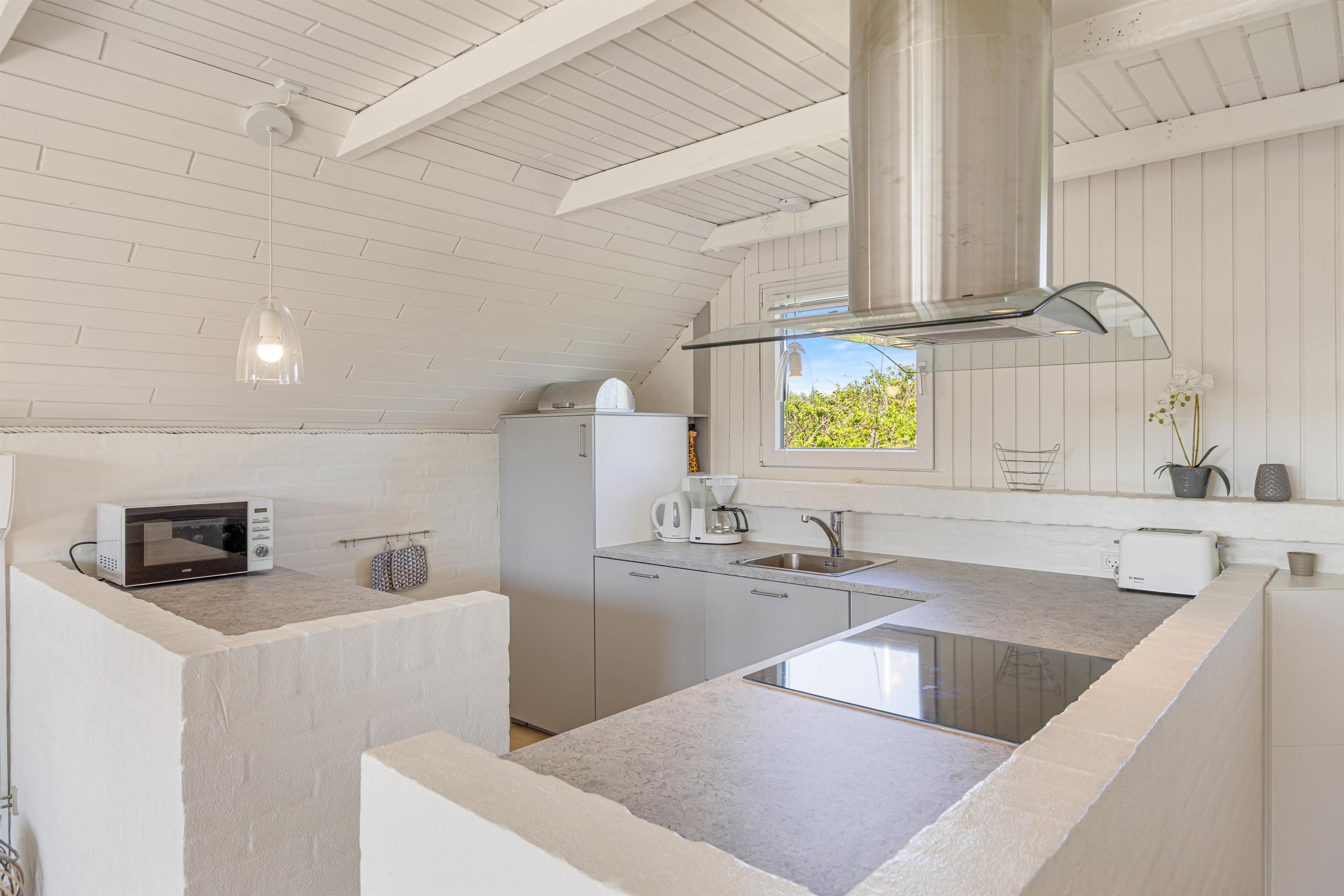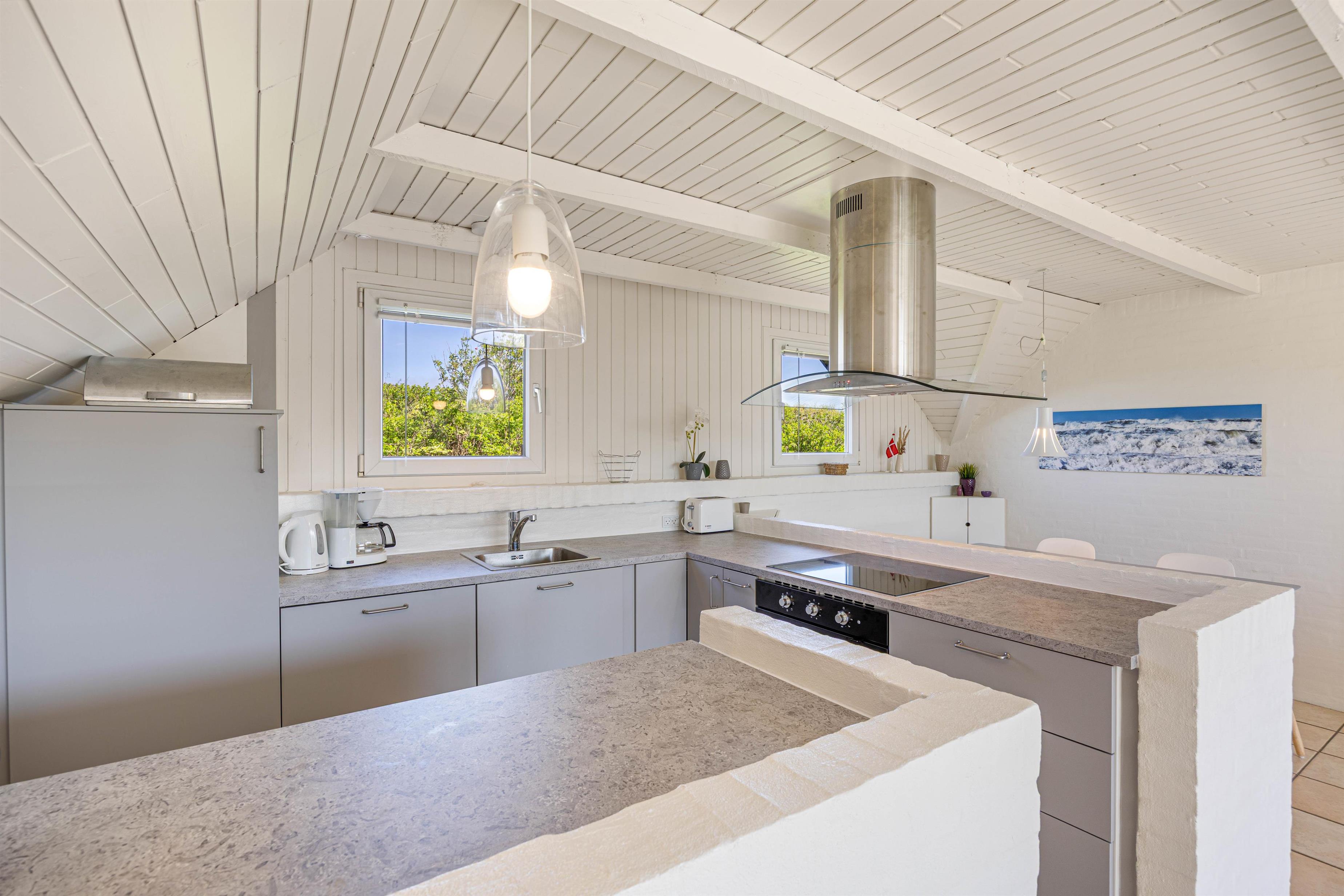 Husets badeværelse har et skønt, naturligt lysindfald gennem ovenlysvinduet. Opholdsrummet ligger i åben forbindelse med det nyrenoverede køkken, som blev moderniseret i 2025. Her kan feriekokken finde alt, hvad der skal bruges for at trylle lækre feriemåltider frem – og der er også god plads til de små hjælpere.