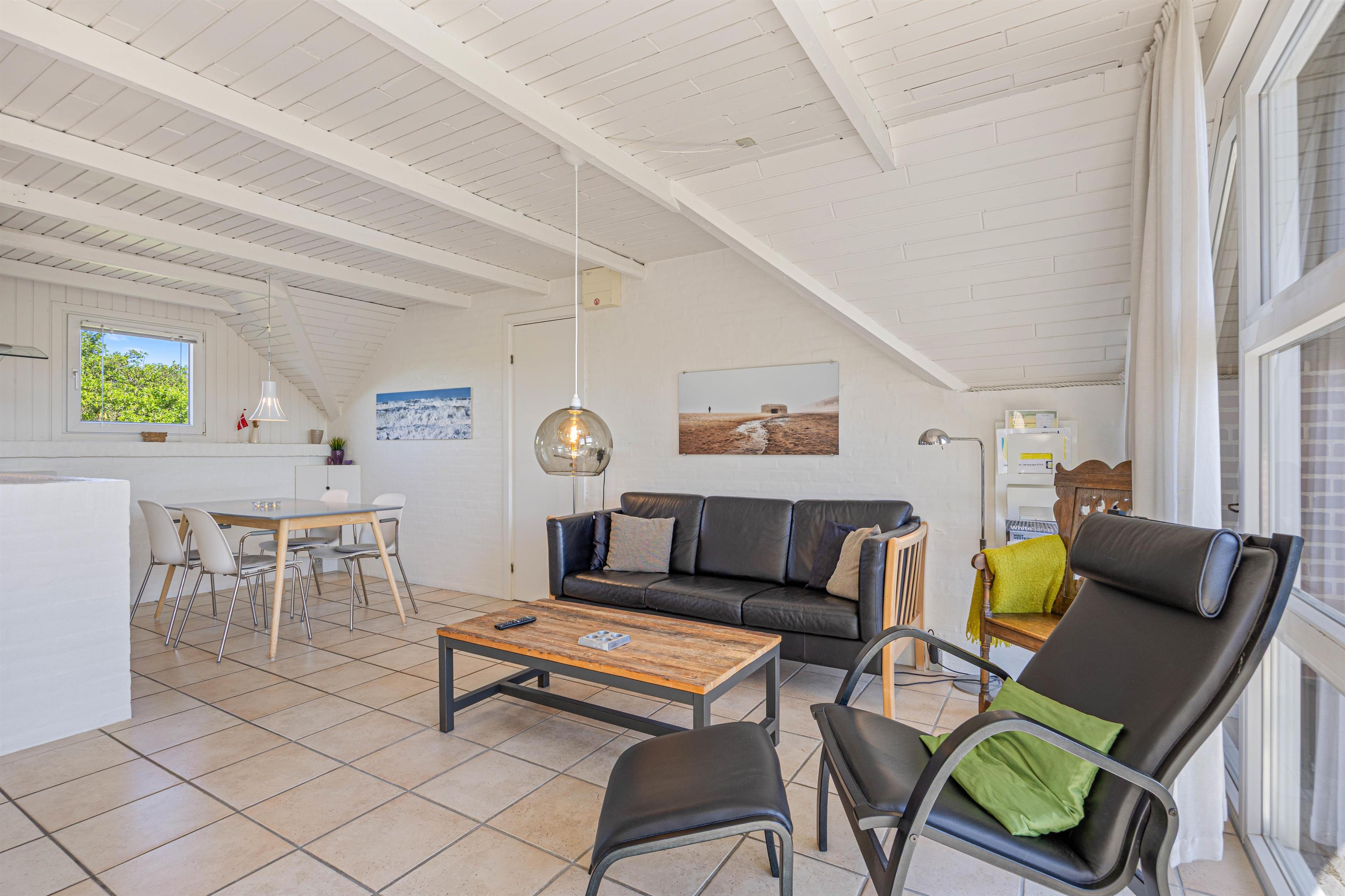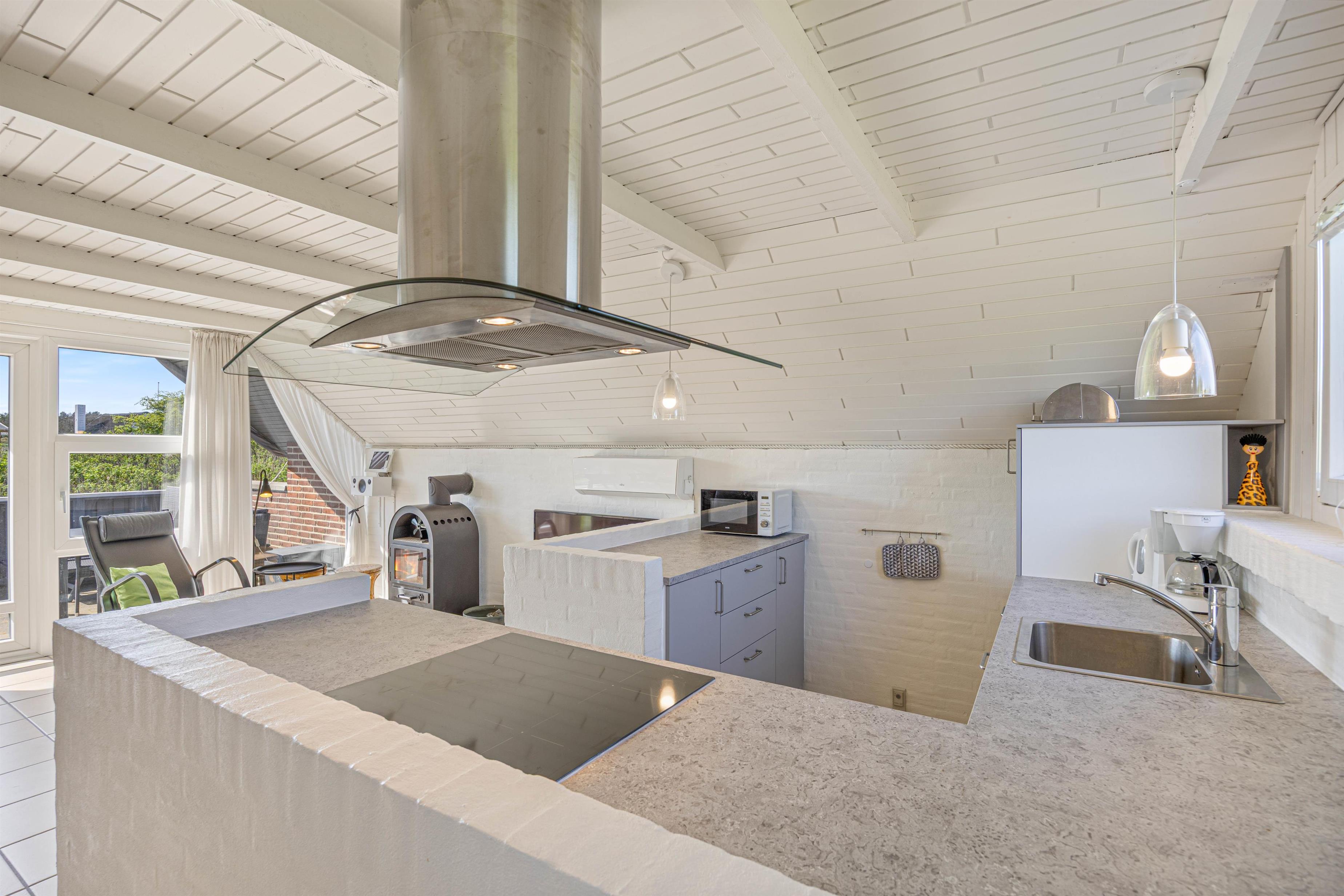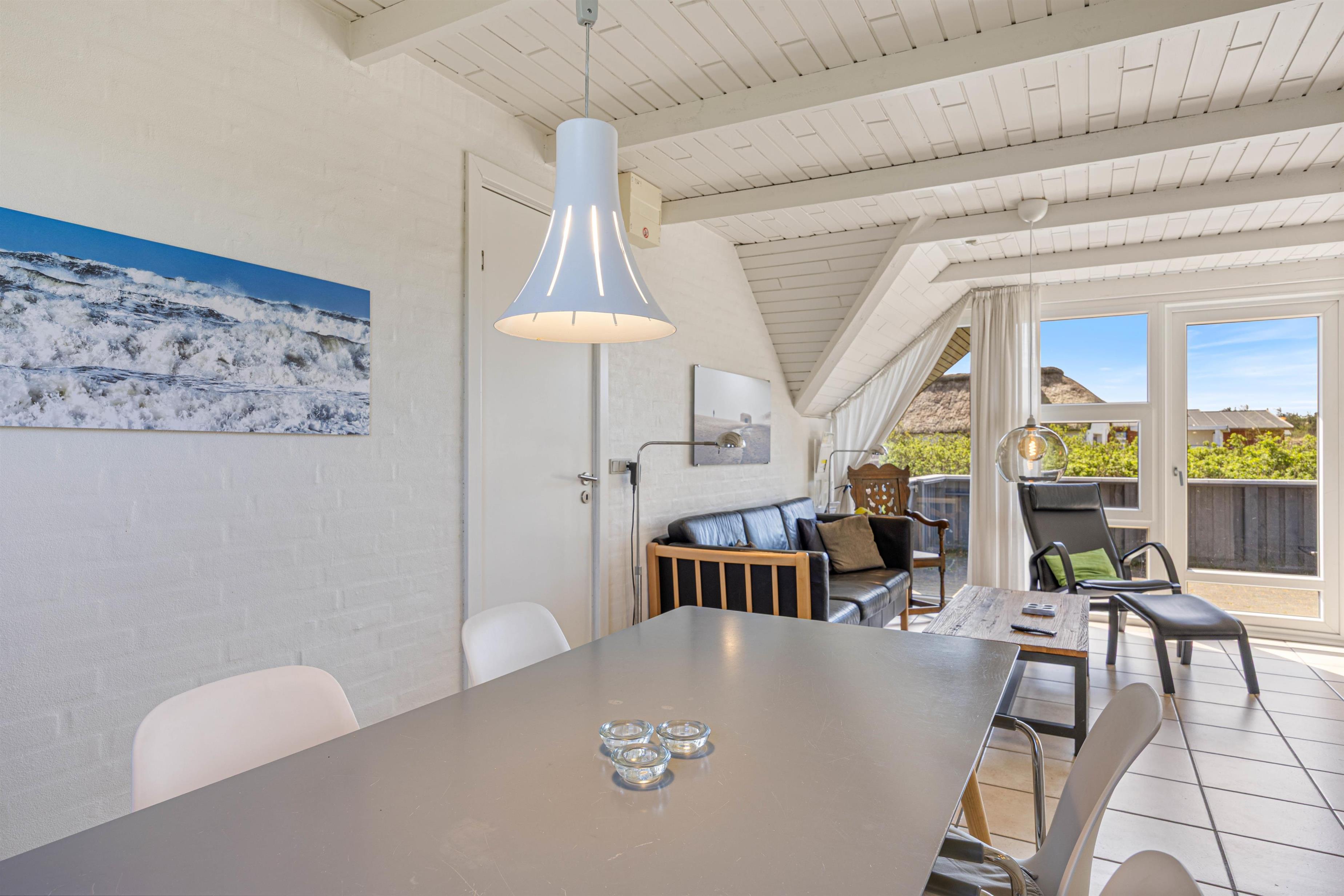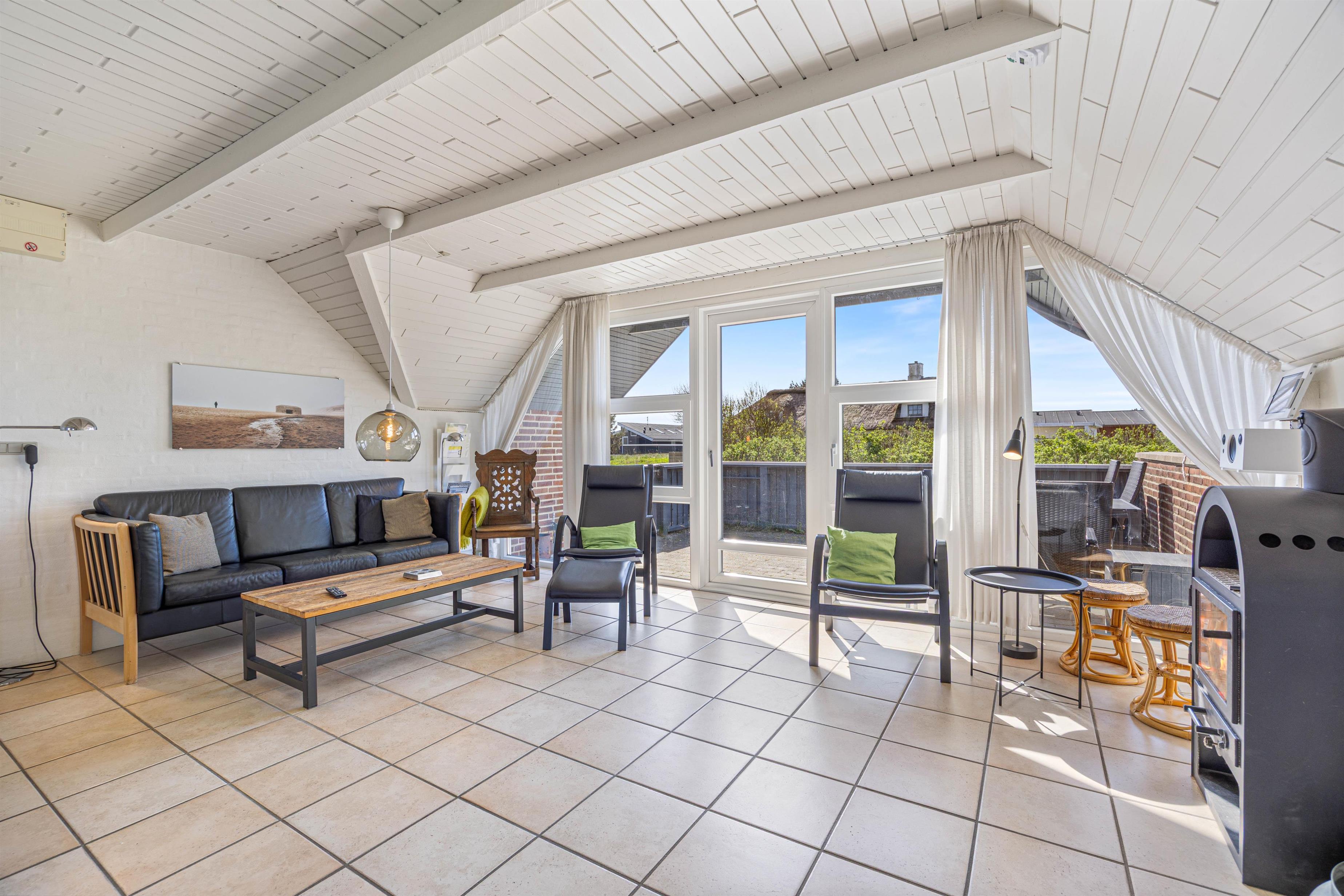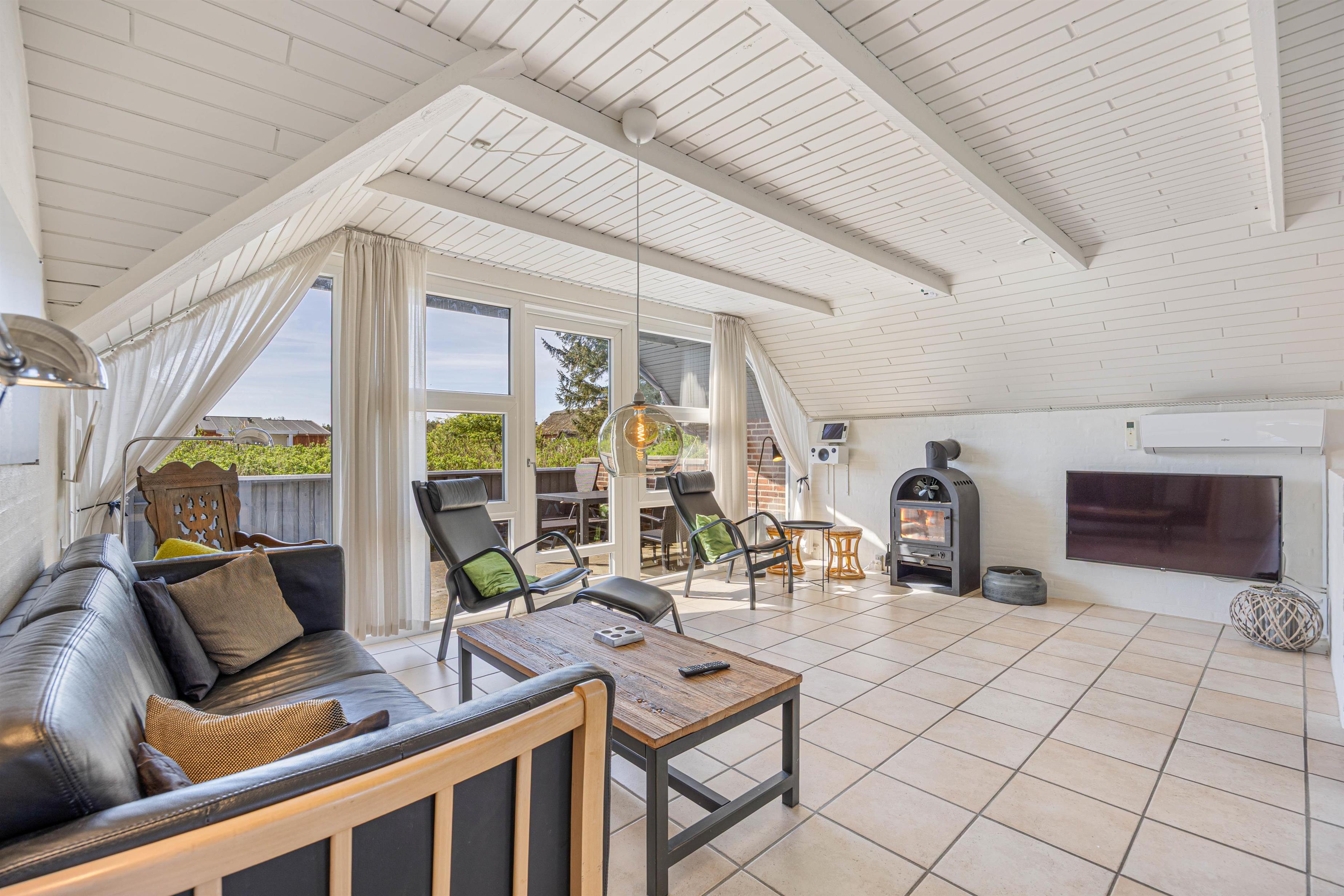 Den centralt placerede brændeovn kan ses fra alle hjørner af opholdsstuen og skaber den hyggelige sommerhusstemning, man forbinder med afslappede feriedage. Et fladskærms-tv med Chromecast giver jer mulighed for at streame lige det, I har lyst til – når I har lyst til det.