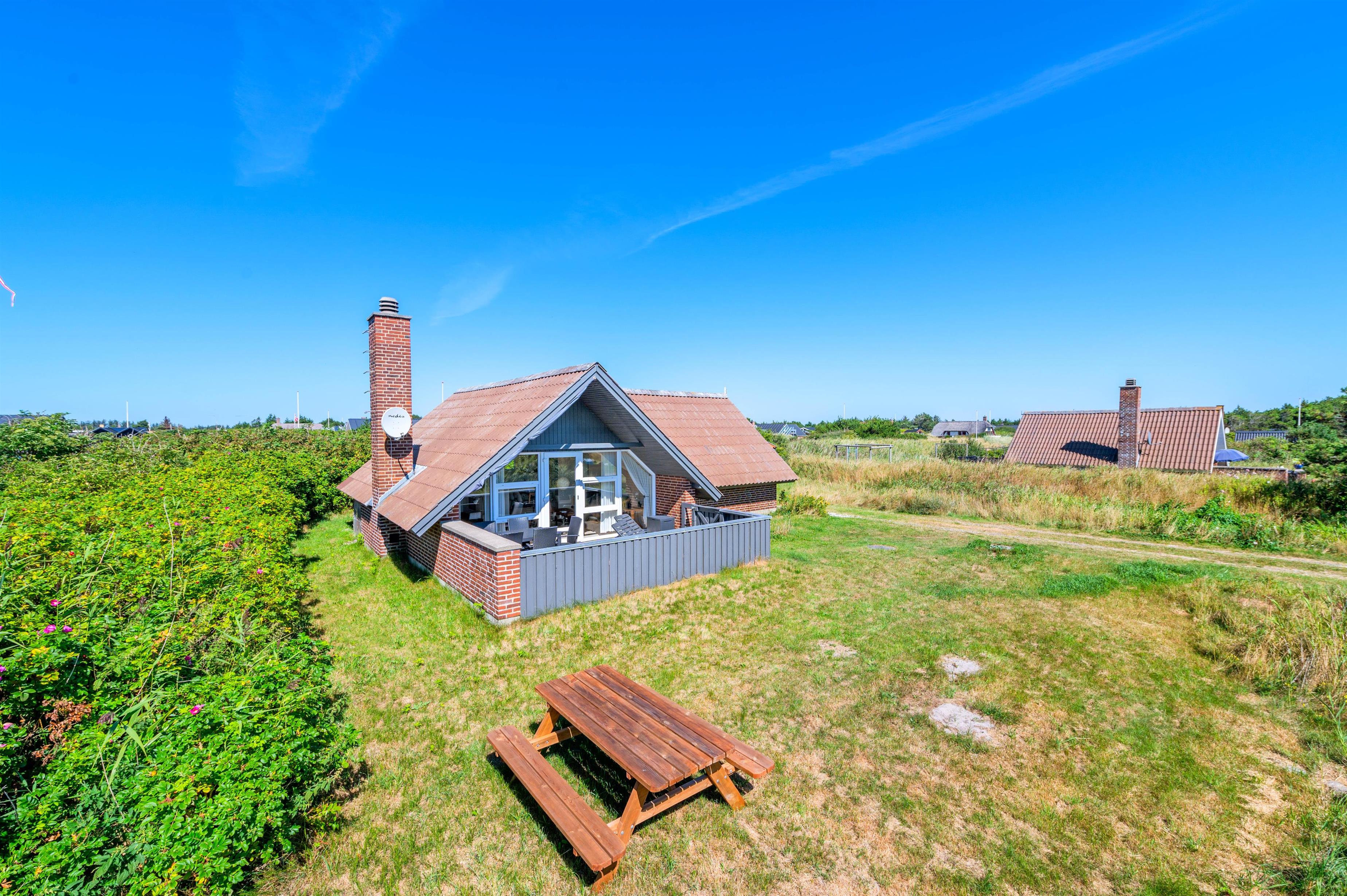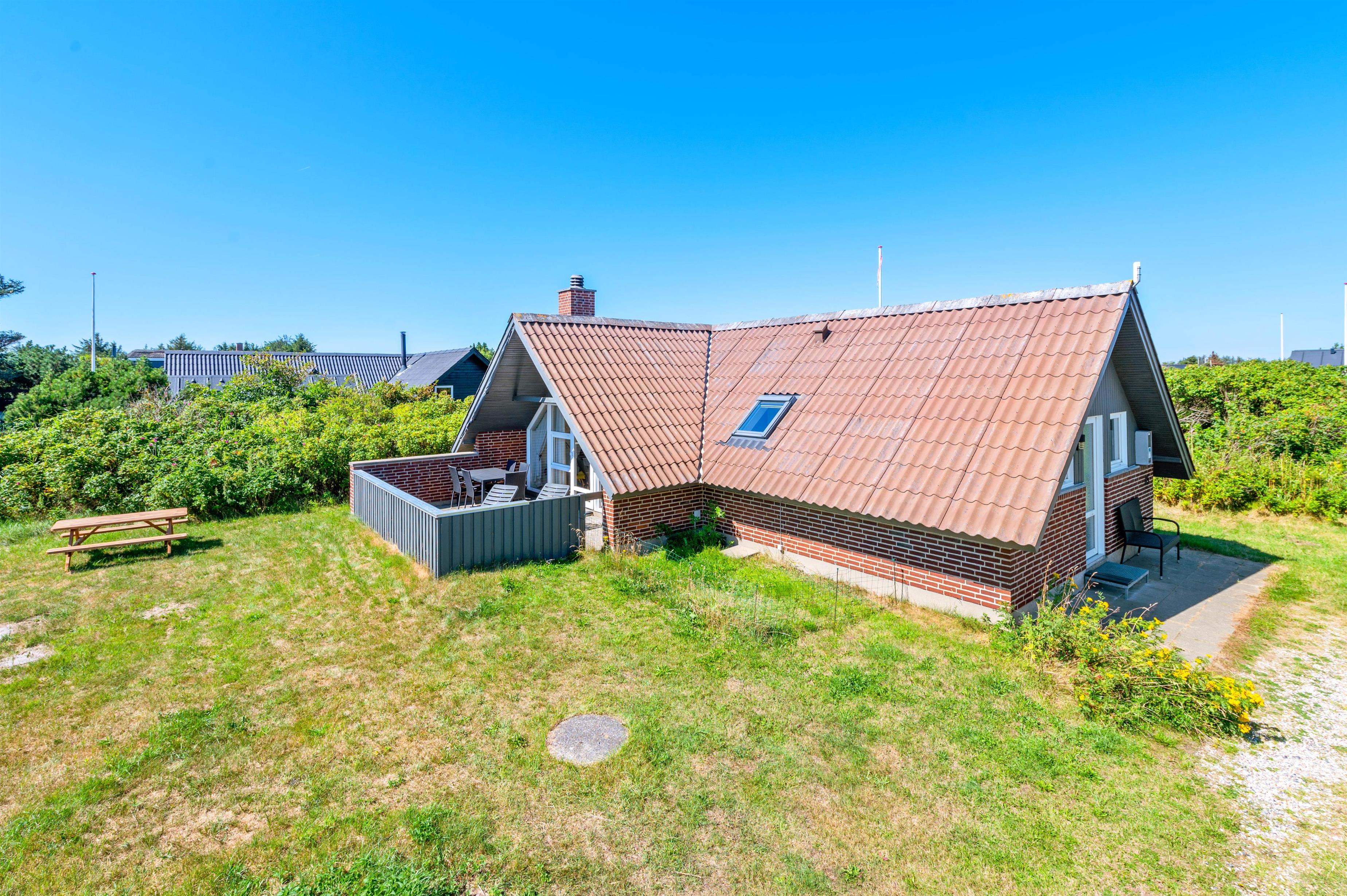 Dette hyggelige sommerhus på 75 kvadratmeter ligger på en stor, naturskøn grund i Søndervig. Her er der plads til 4 personer og 2 hunde. Sommerhuset ligger roligt og ugeneret, omgivet af store hybenbuske, som giver masser af læ og privatliv. Der er gulvvarme i hele huset, så klinkegulvet føles behageligt, nemt og praktisk.