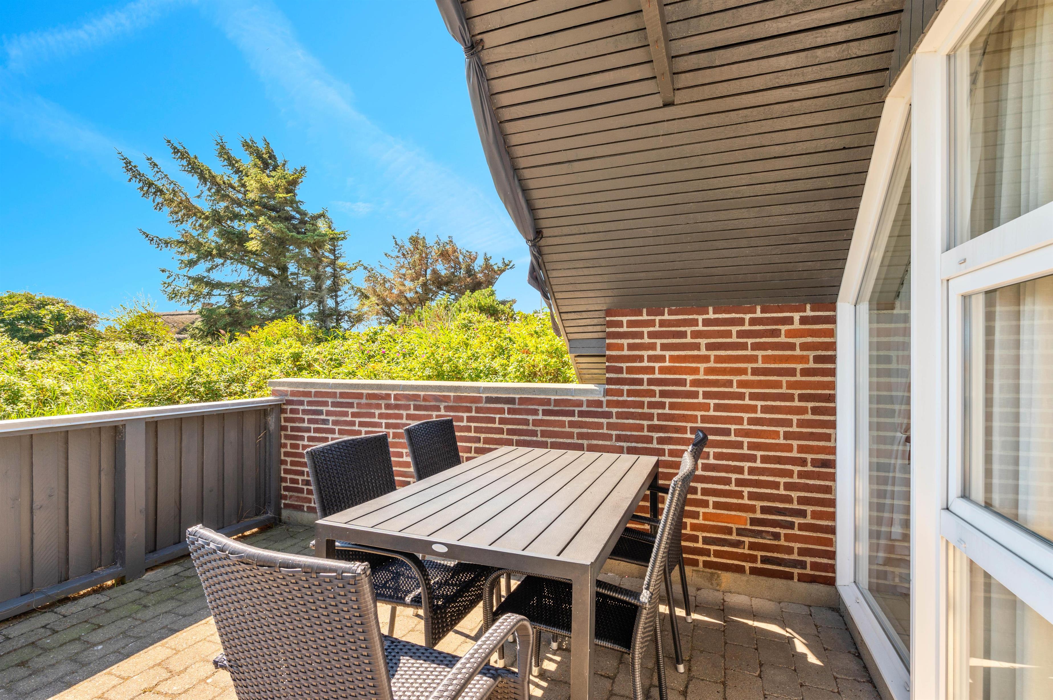 Fra det lyse opholdsrum har I direkte adgang til en af husets terrasser, som er både lukket og afskærmet. Her kan hundene løbe frit omkring, uden at I behøver at frygte, at de stikker af. Der er endda lavet en lille åbning i hegnet, så hundene kan følge med i, hvad der sker ude i den vestjyske natur.
