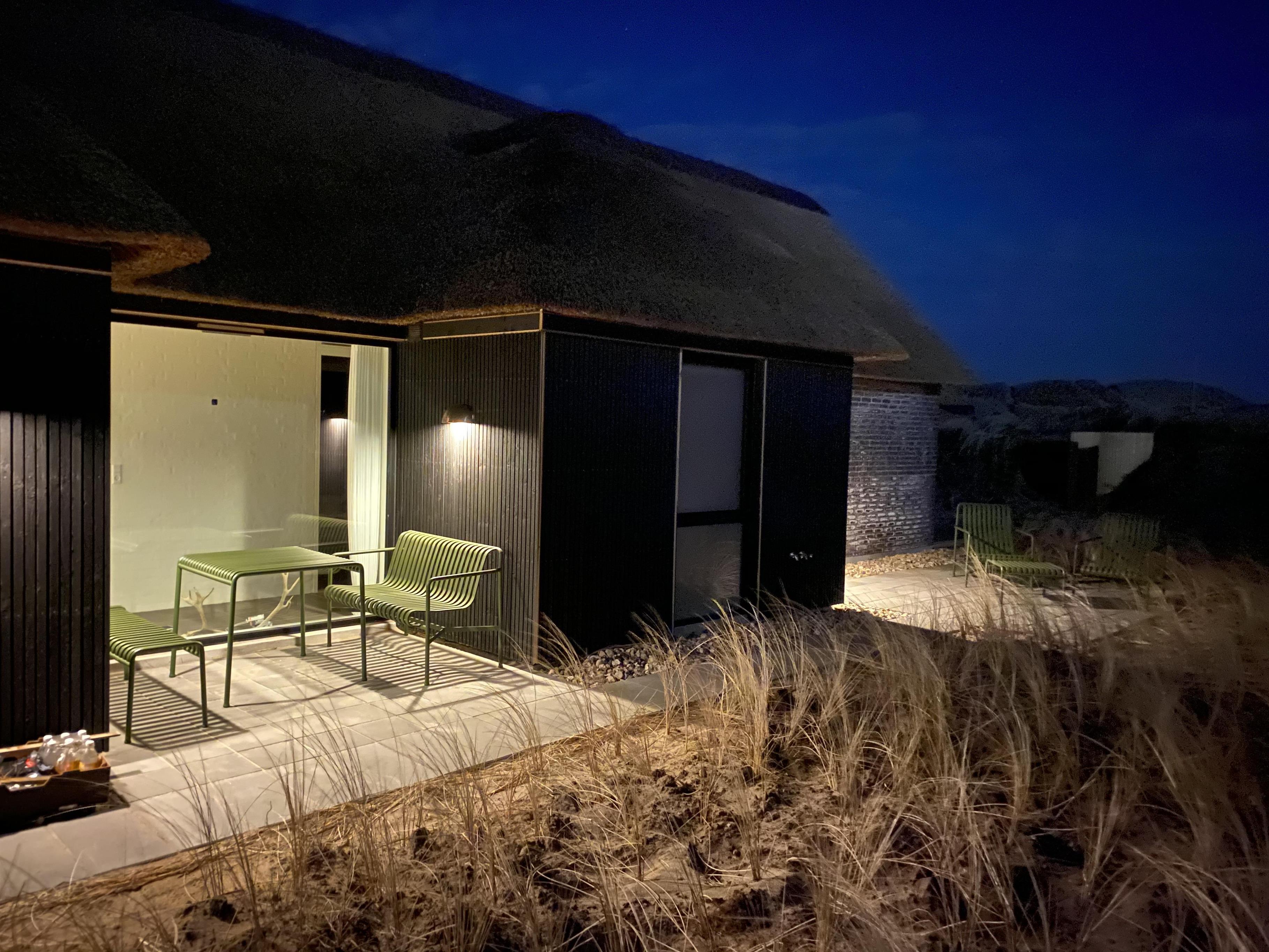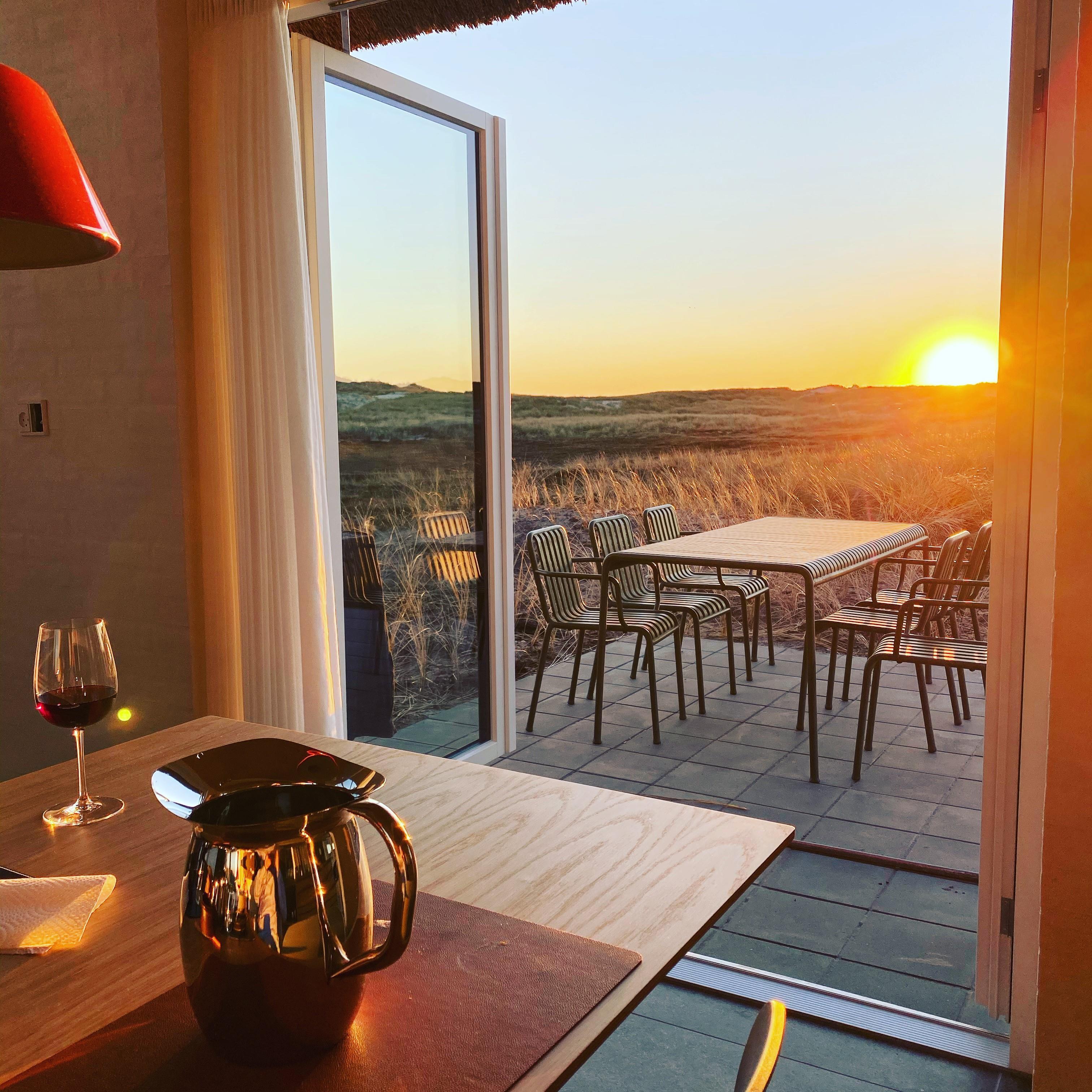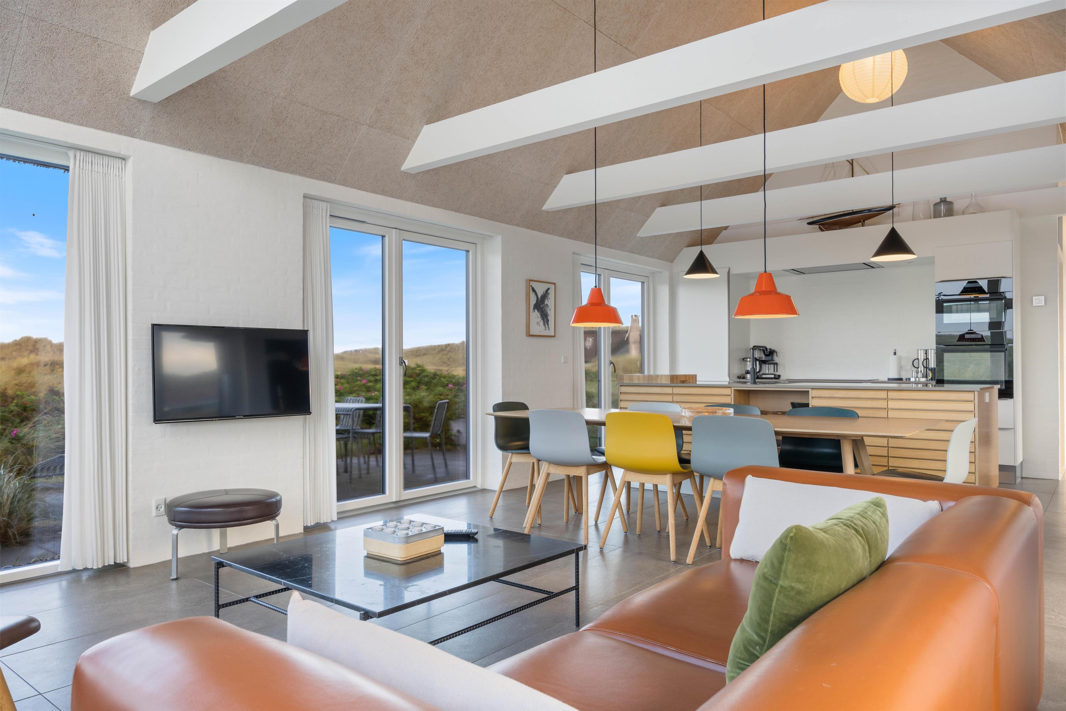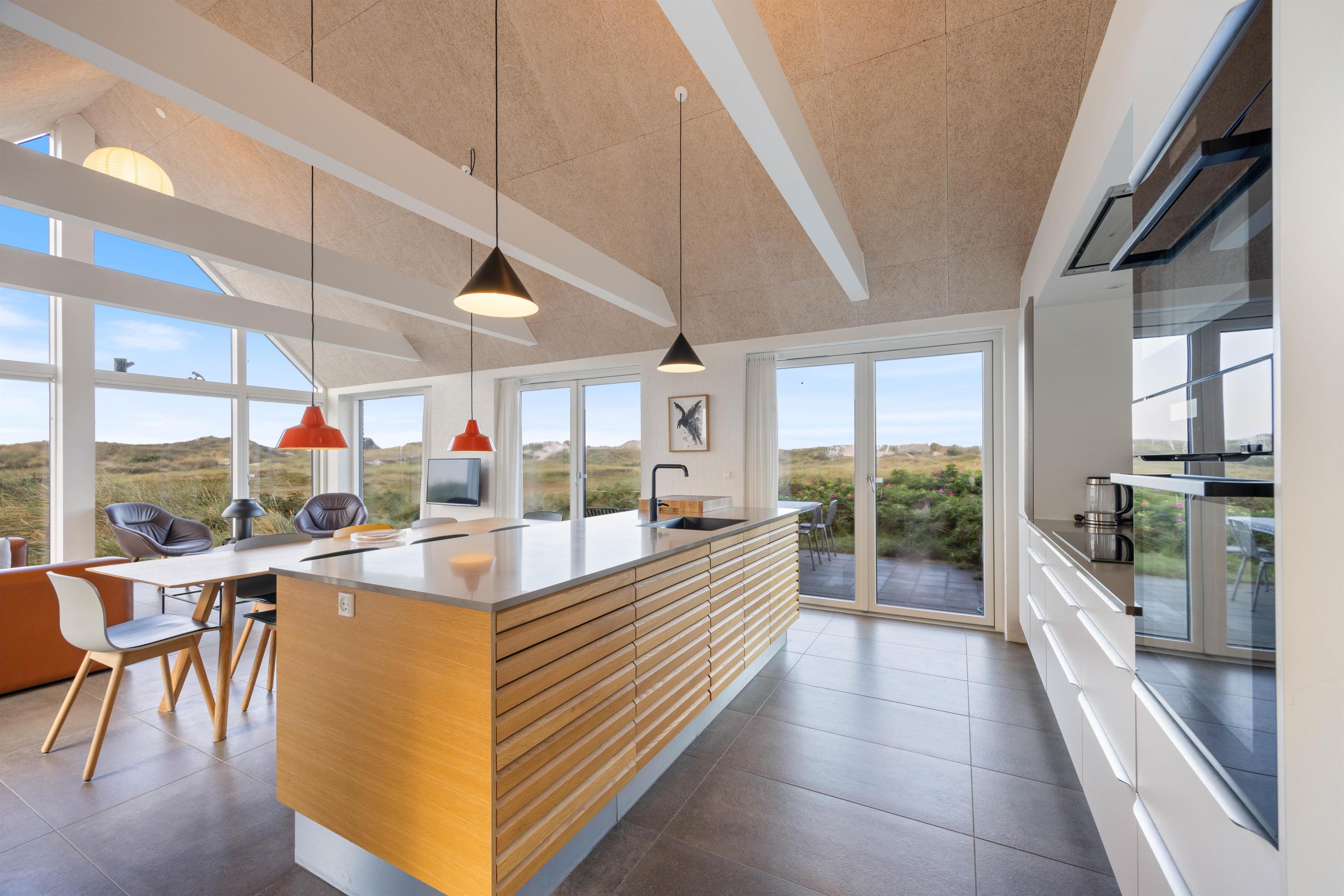 Det lyse opholdsrum er udstyret med gulvvarme, en pejs og byder på en fantastisk udsigt ud over klitterne. Der er sågar mulighed for at nyde en smuk solnedgang. I det åbne køkkenalrum er der rig mulighed for at tilbringe kvalitetstid sammen. I det åbne køkken, har I mulighed for at hjælpe hinanden med madlavningen. Imens opvaskemaskinen klarer opvasken for jer, kan I sætte jer godt til rette i stuen med en god film. Her er der en chromecast, så I kan streame netop de film og serier, som I ønsker at se via. jeres egne streamingtjenester.