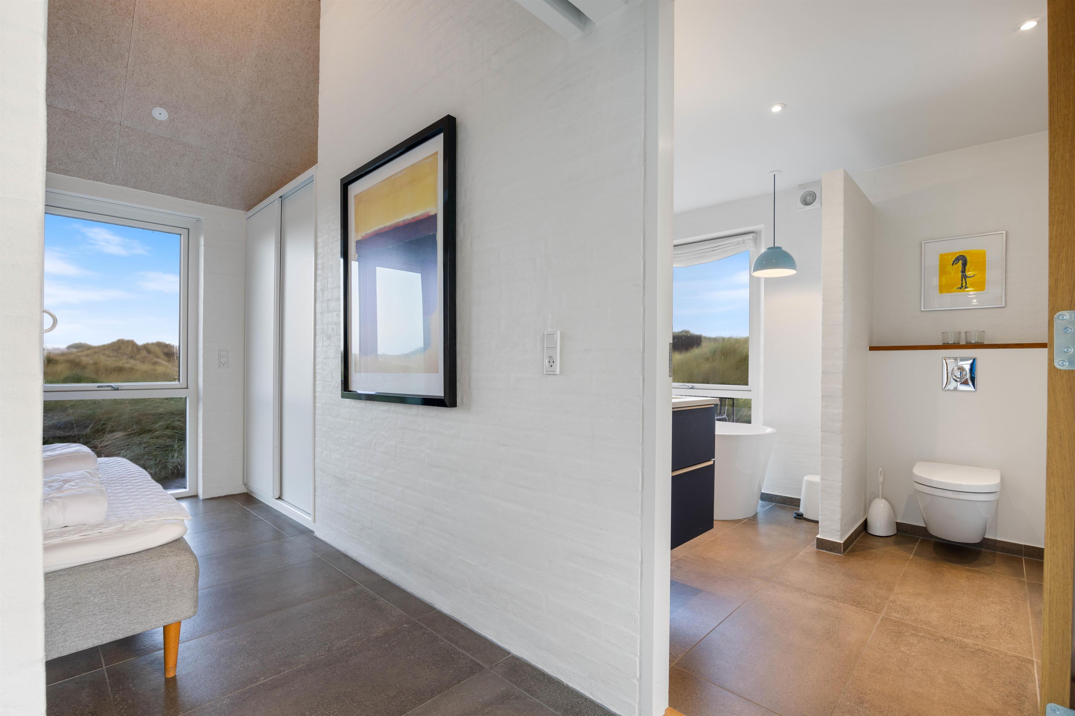 Der er 3 rummelige soveværelser med gulvvarme og dobbeltsenge, så I kan lade batterierne op efter en lang dag på stranden. Derudover er der 2 badeværelser med gulvvarme, hvoraf det store badeværelse både har en dobbeltbruser og et badekar. I kan blive ordentlige gennemvarme i saunaen, imens I nyder den smukke panoramaudsigt over klitlandskabet. I det andet badeværelse finder I praktiske bekvemmeligheder som vaskemaskine og tørretumbler.
