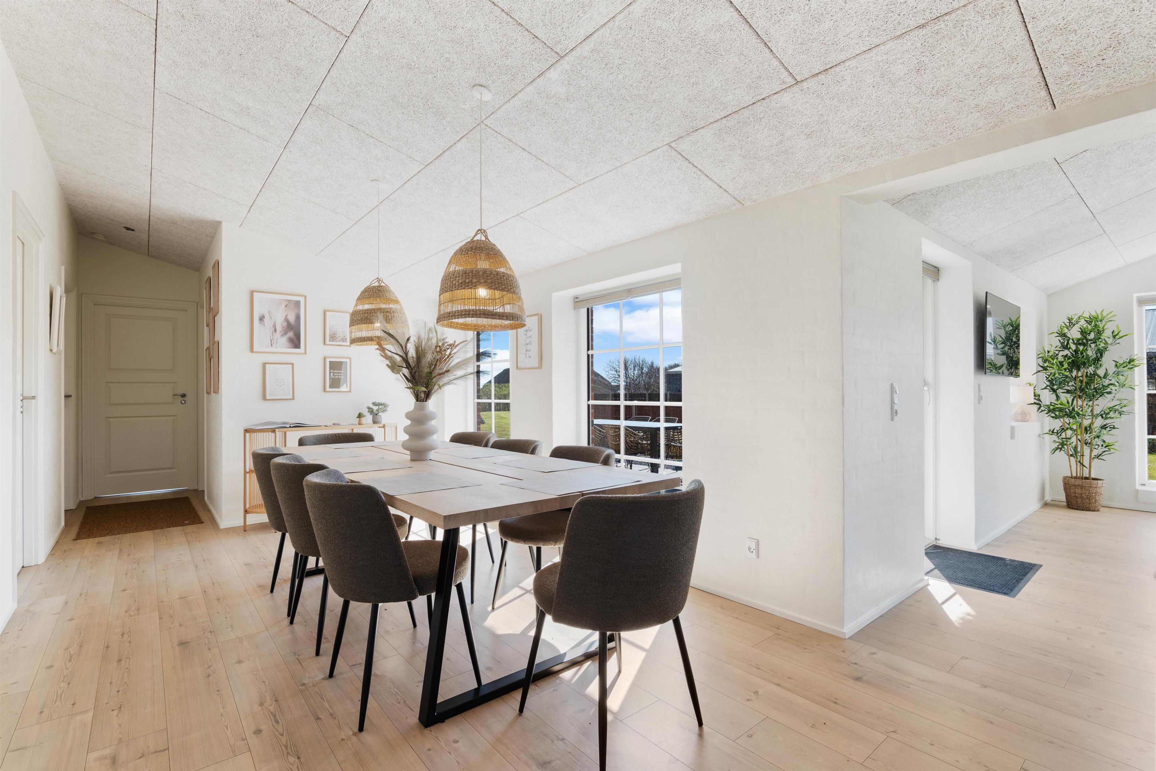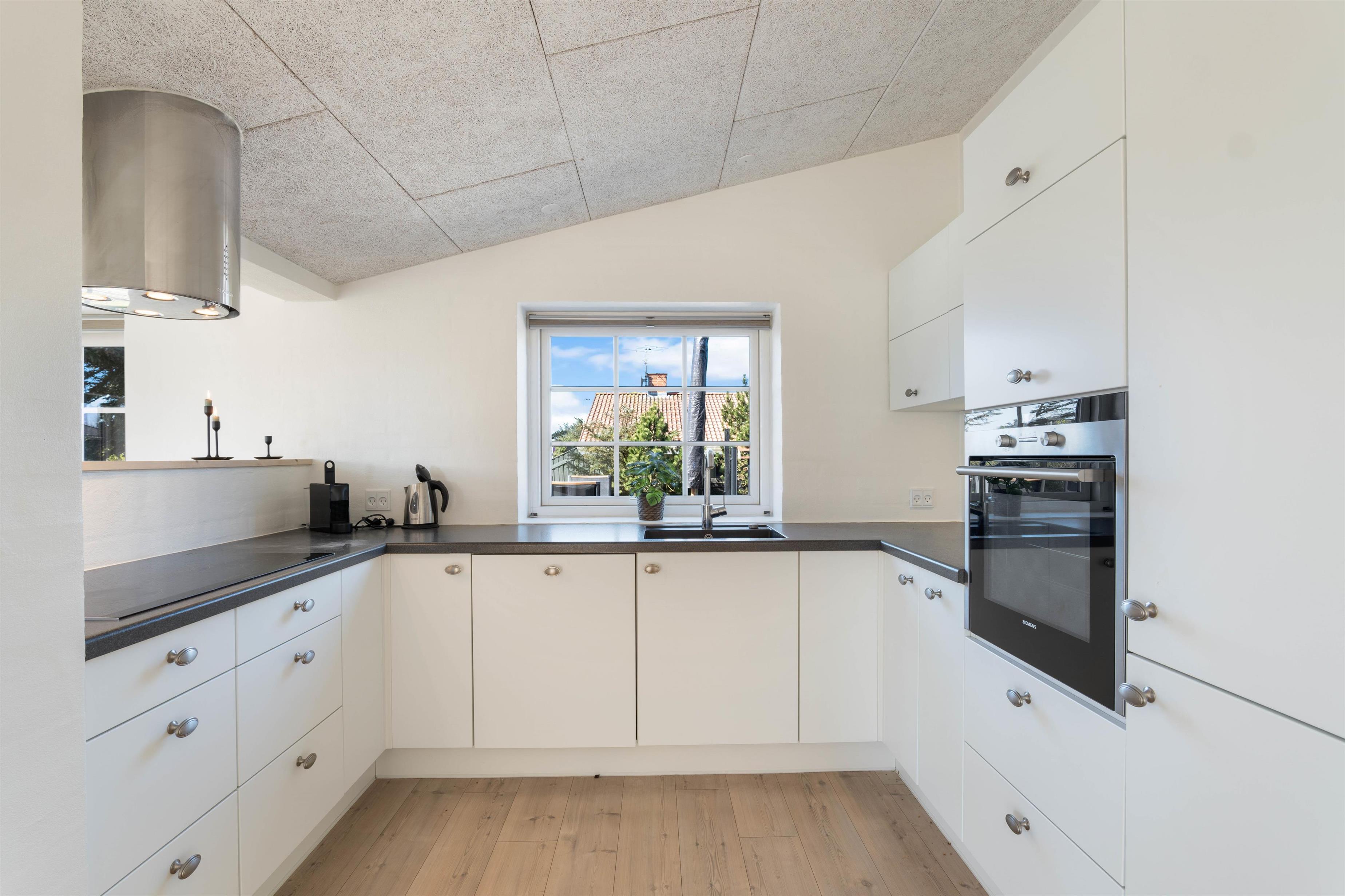 Det moderne sommerhus er også bygget på den måde, at der et stort køkkenalrum hvor I kan nyde masser af kvalitetstid med hinanden, men også trække stikket og bare slappe af. Her er højt til loftet, og med masser af lækkert lys fra de store vinduespartier, er der der her et lækkert indemiljø.