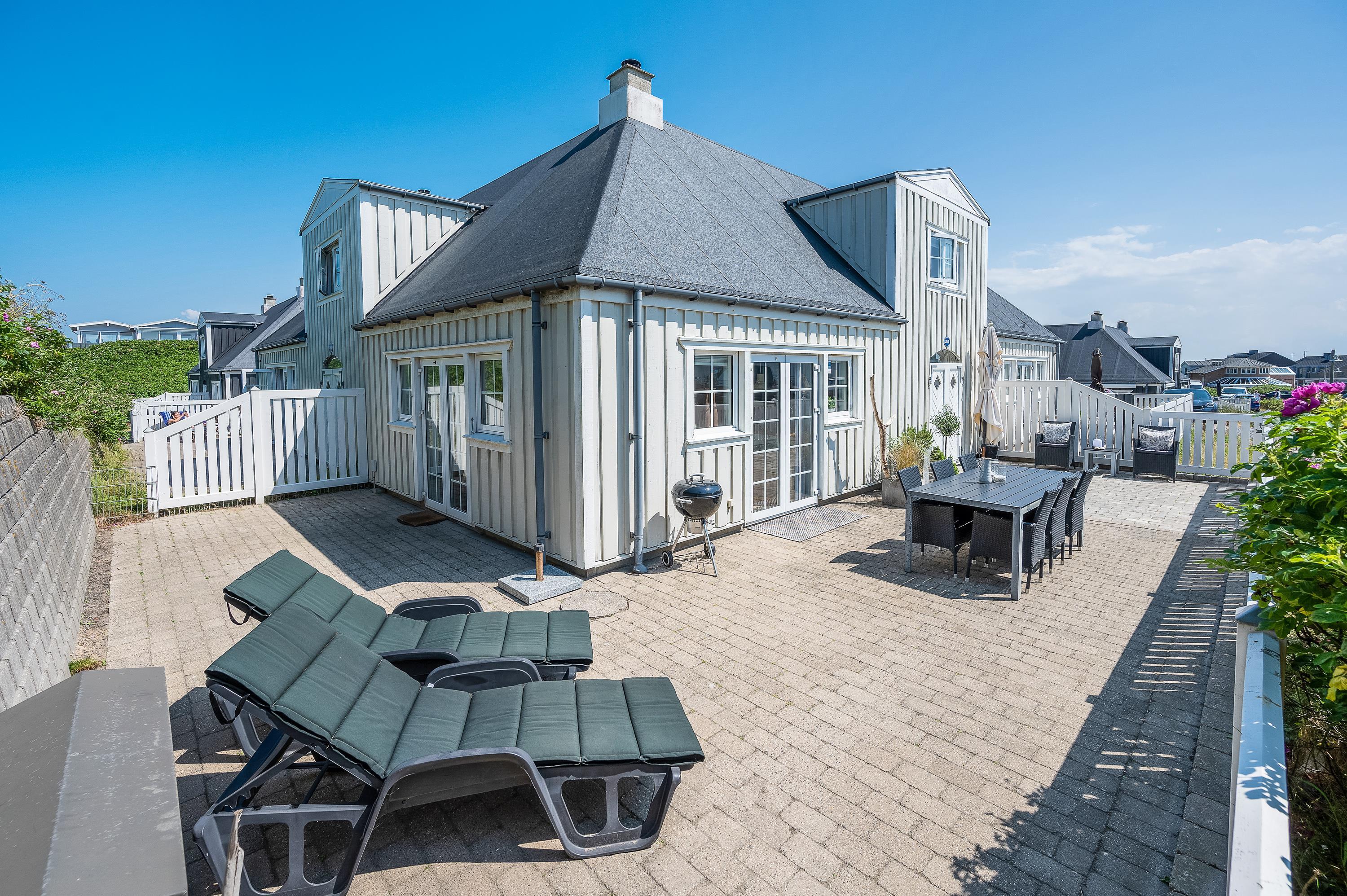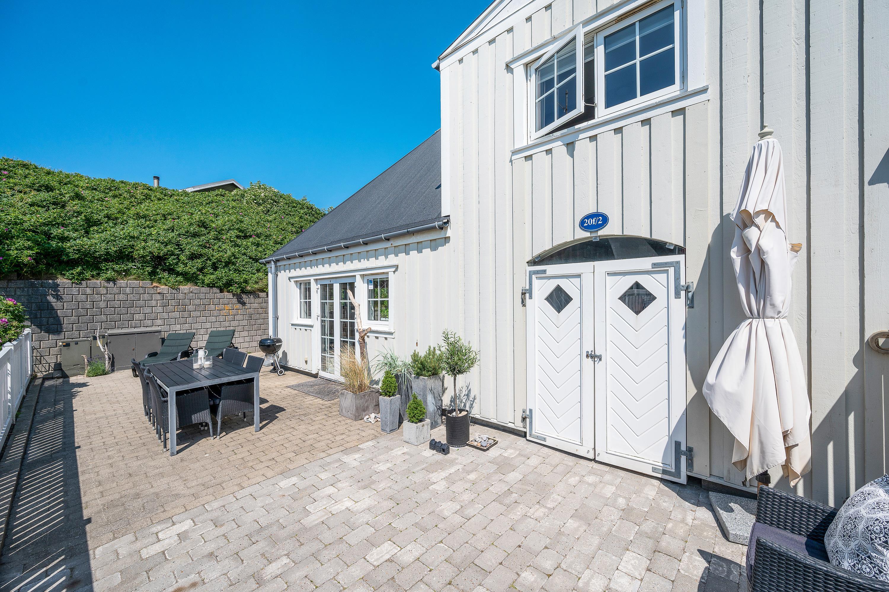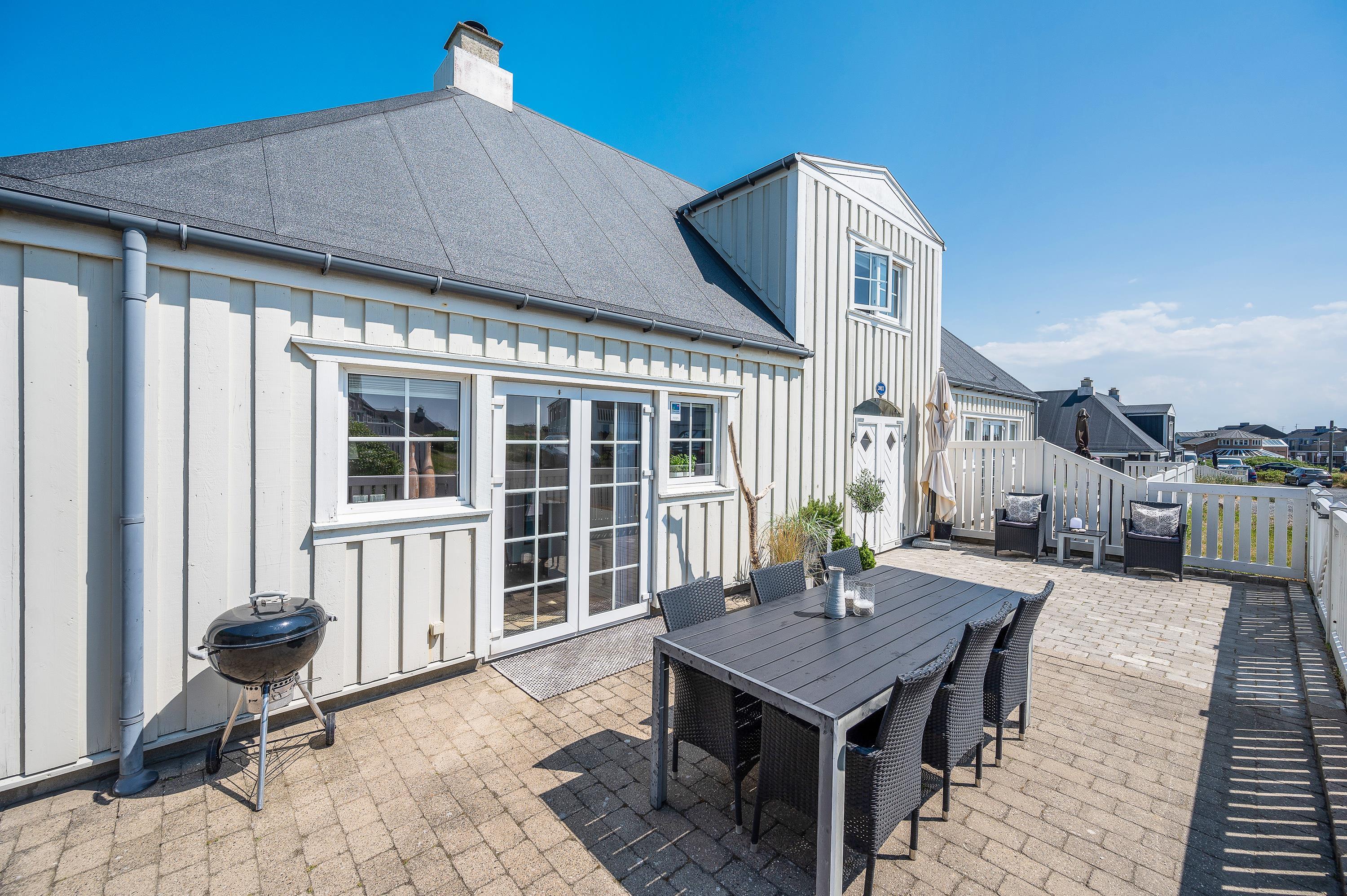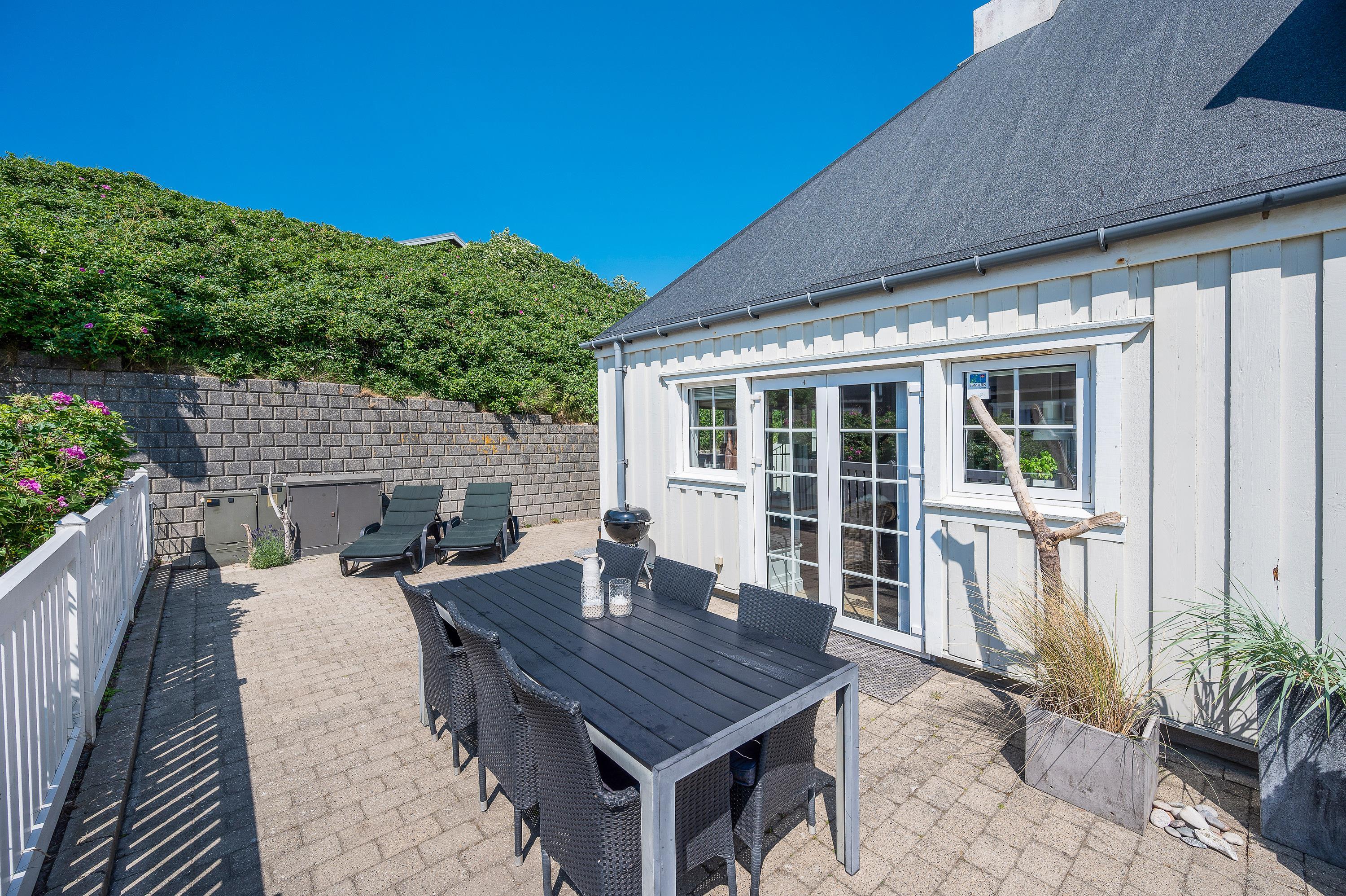 På den afskærmede og lukkede terrasse er der gjort klar til, at I kan nyde de varme solskinsdage i liggestolene eller havemøblerne, og om aftenen kan der tændes op i ferielejlighedens grill, hvis I skal have en ekstra hyggelig feriemiddag.