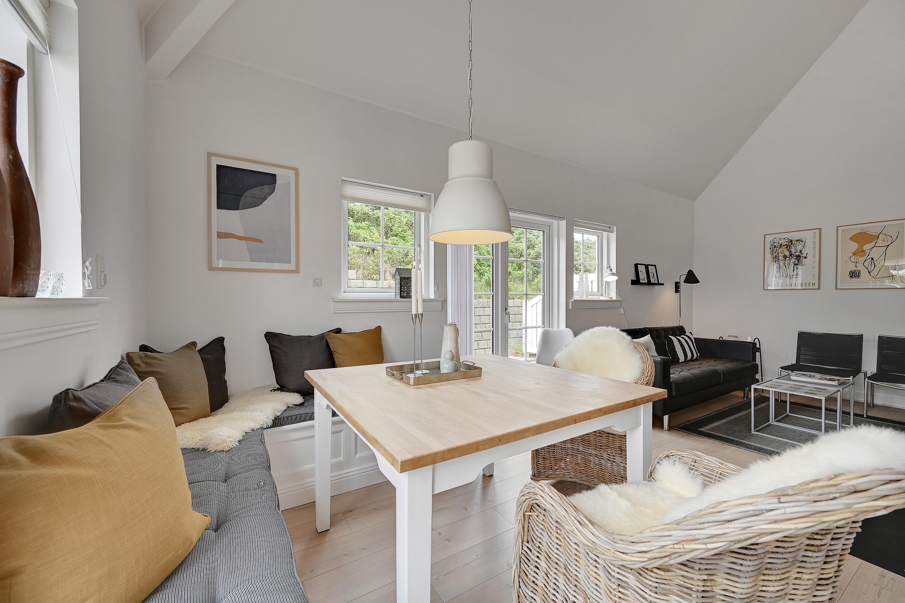 Indvendigt får I en lys og hyggelig ferielejlighed og en fredfyldt atmosfære, som gør, at I med det samme vil falde godt til. Skal I værne lidt ekstra om jer selv og hinanden, kan I tænde for saunaen eller starte spabadet og bruge en aften i ro og fred i varmen. De praktiske opgaver bliver også minimeret, da der både er en opvaskemaskine, vaskemaskine og tørretumbler til rådighed. Heller ingen grund til at bekymre sig om kolde fødder om morgenen, da der er gulvvarme i badeværelset.