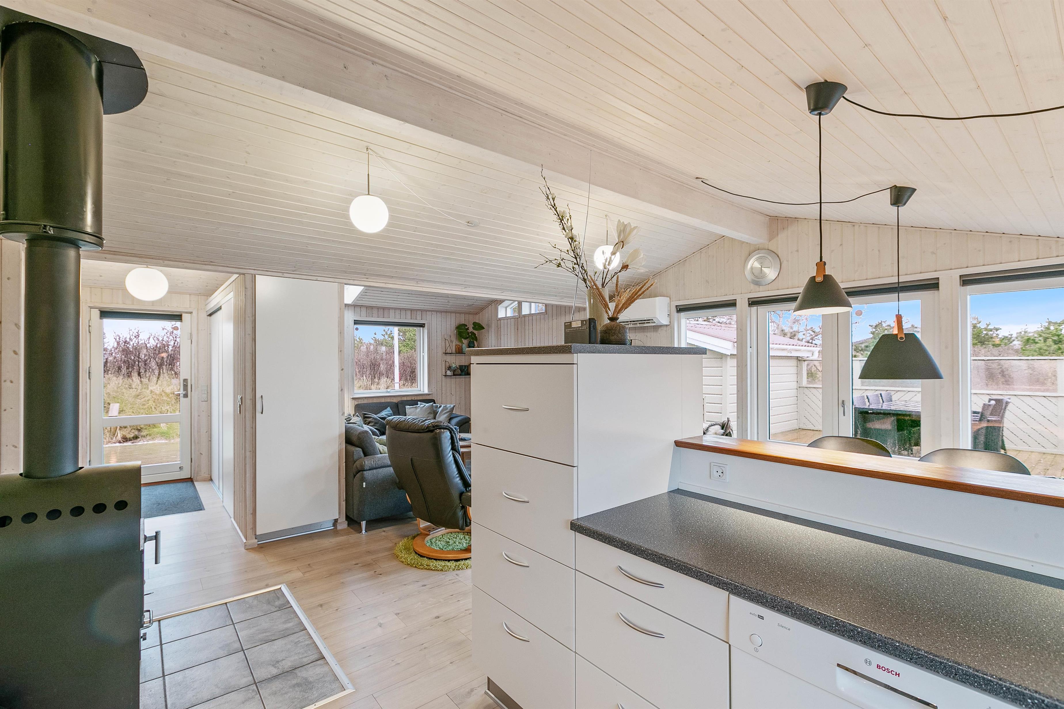 Det dejligt store køkken, som står i åben forbindelse med stue og spisestue indbyder til fælles madlavning og masser af gode ferieminder. Det er også her hvor I finder sommerhusets brændeovn, der altid er garant for at sprede en masse varme og hygge. Hvis I ønsker en mere økonomisk opvarmning af huset, er der også en Luft-til-luft varmepumpe til rådighed, der sikrer et behageligt indeklima hele året rundt.
