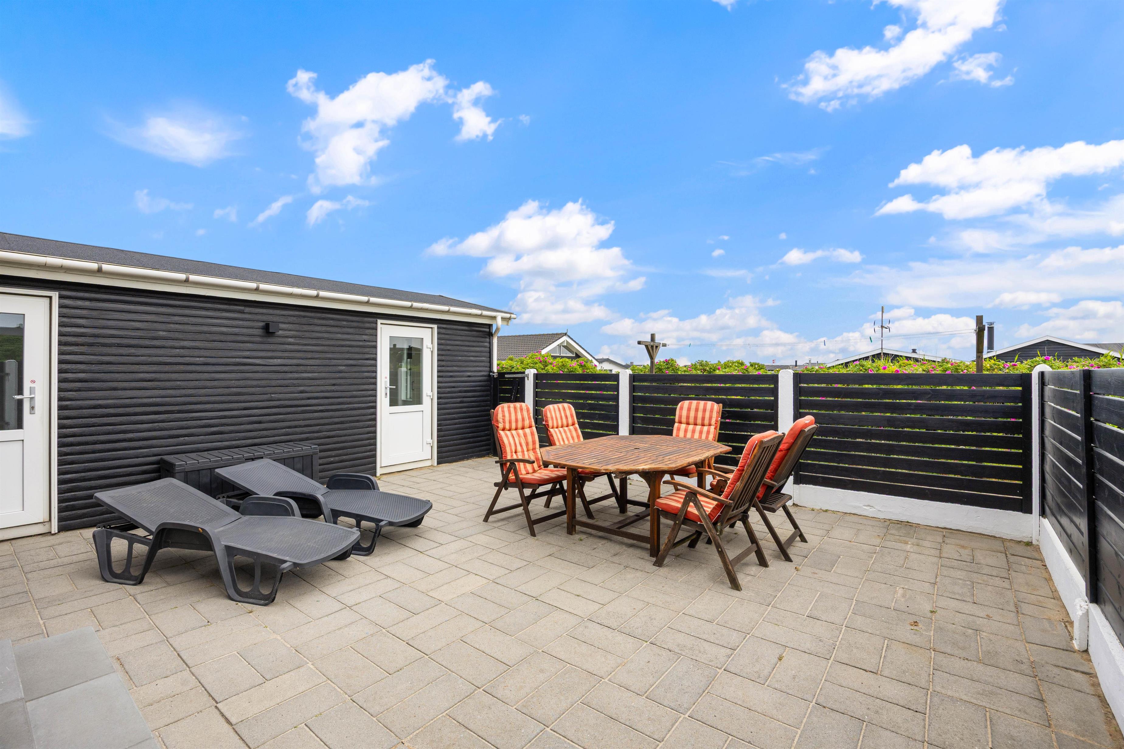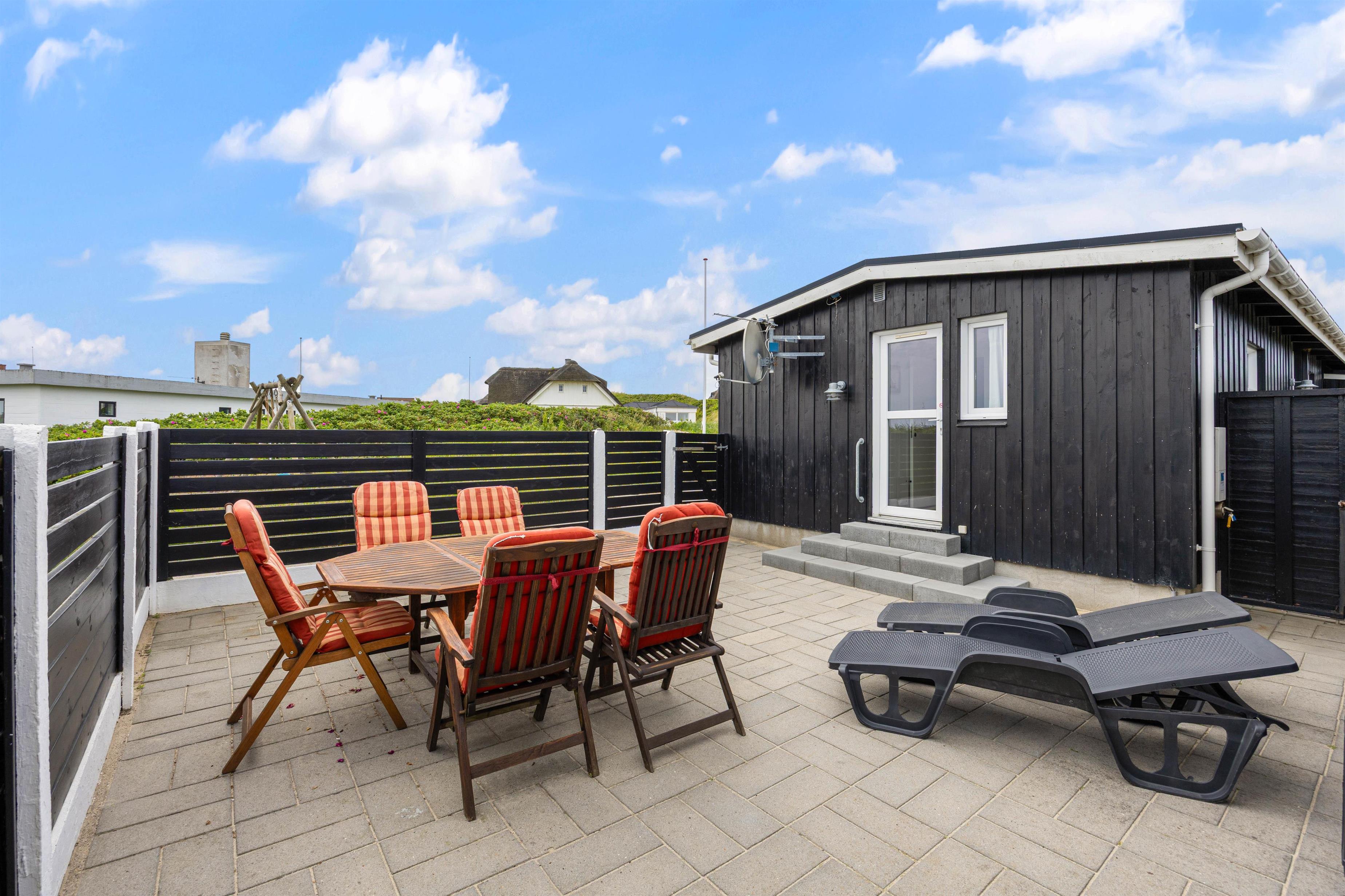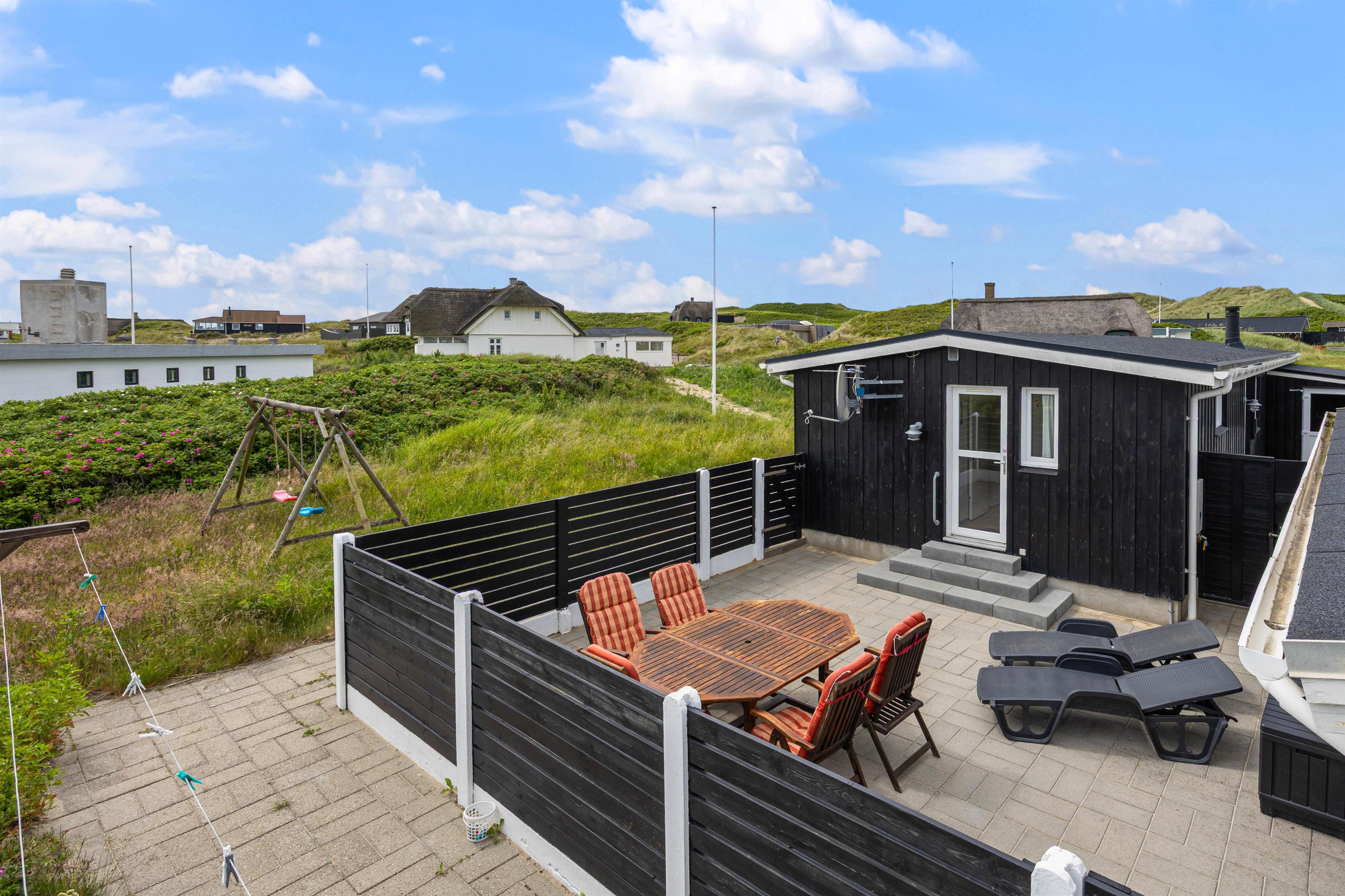 Huset har flere skønne terrasser næsten hele vejen rundt. Både en åben terrasse, hvor I kan nyde de naturskønne omgivelser, og en lukket terrasse, hvor I til hver en tid kan finde læ og slappe af i solen helt ugeneret. Til de yngste feriegæster er der et gyngestativ.