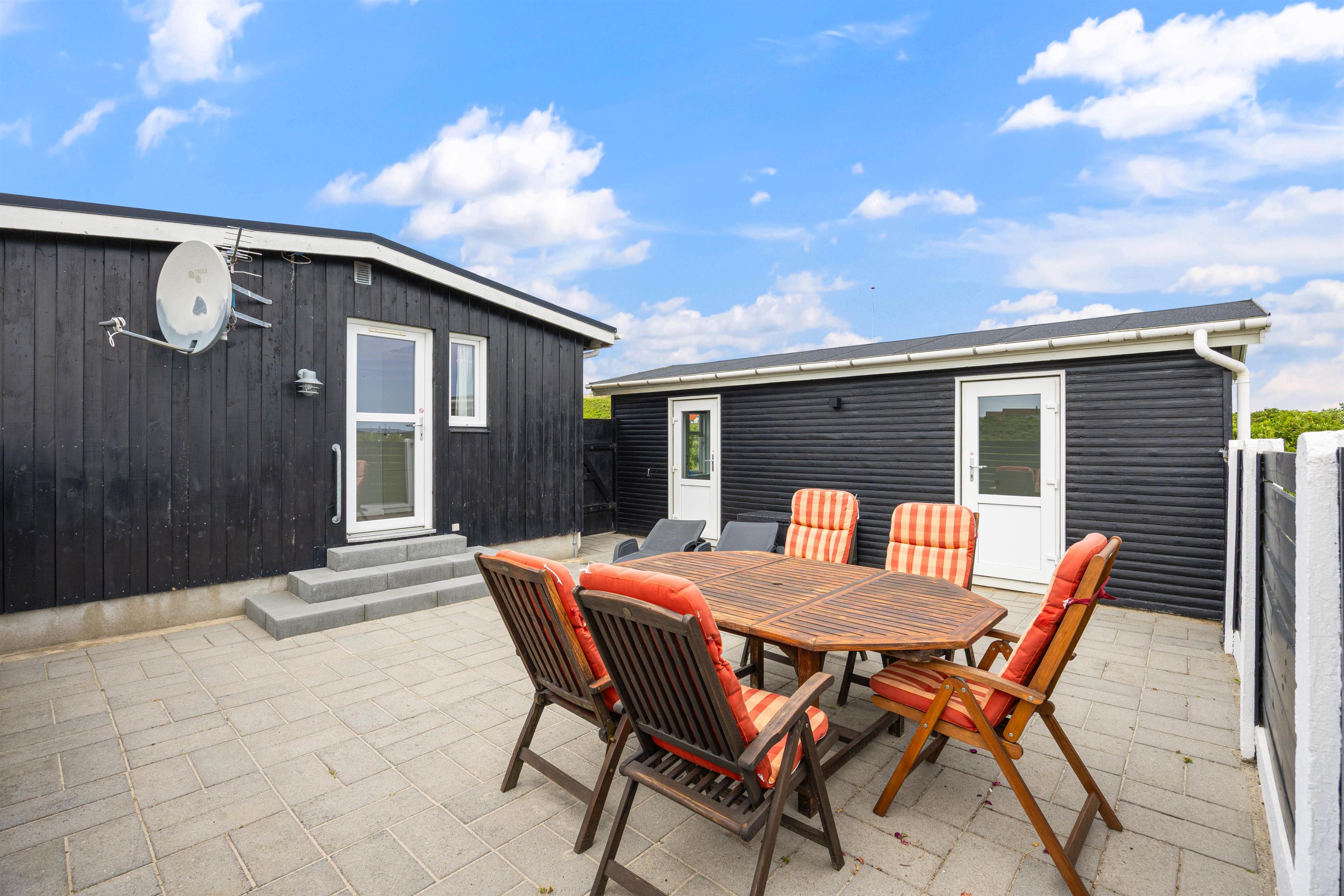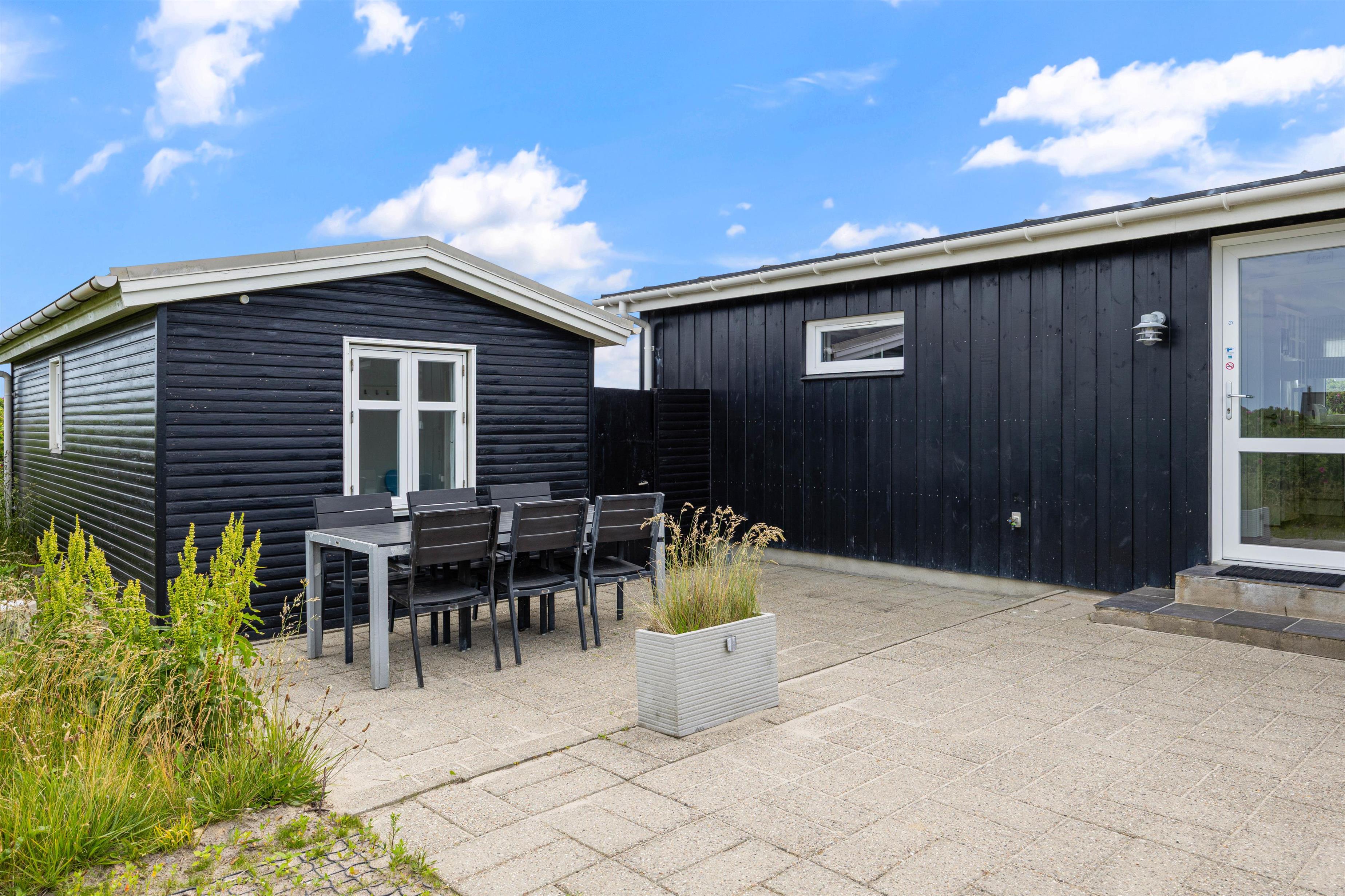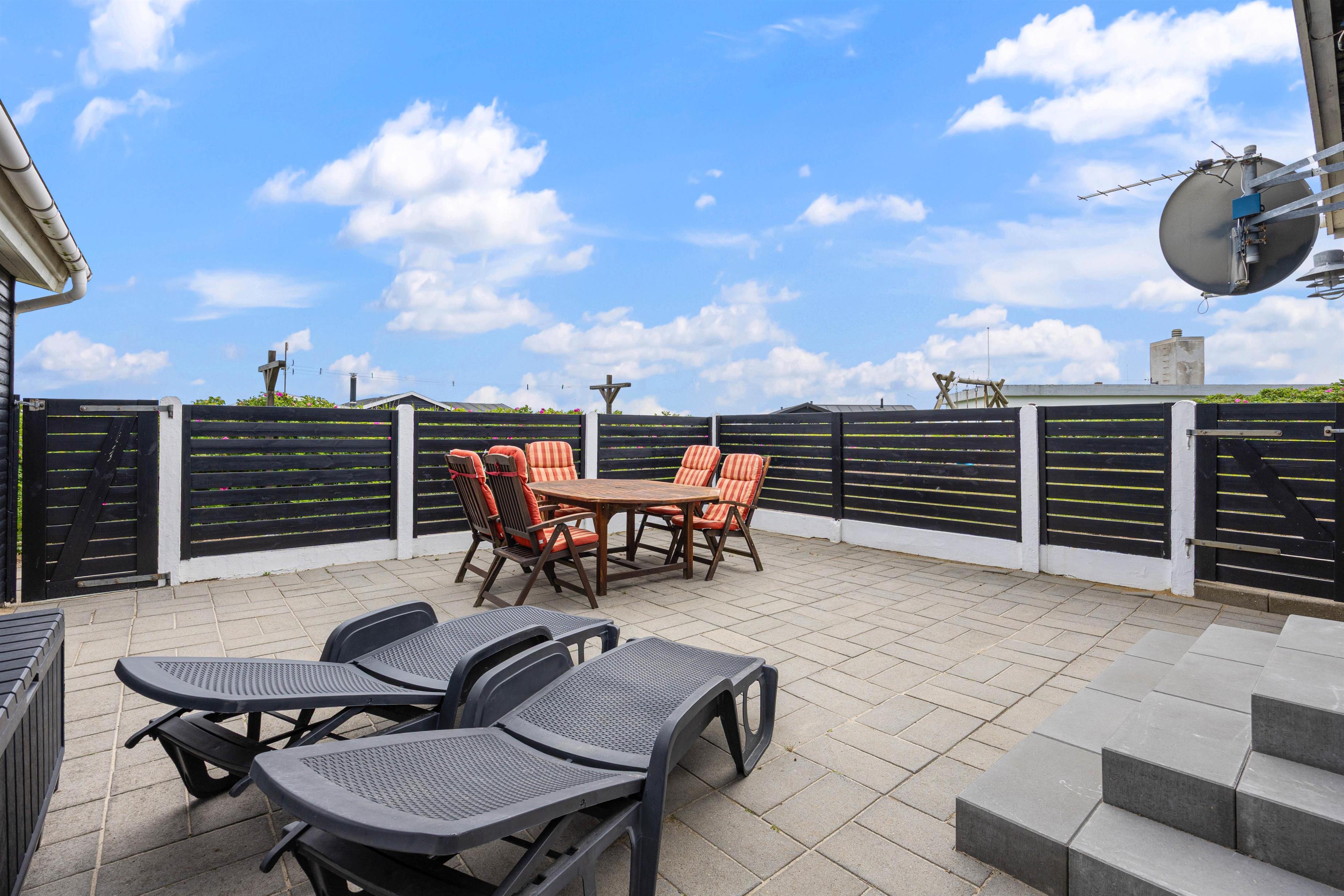Huset har flere skønne terrasser næsten hele vejen rundt. Både en åben terrasse, hvor I kan nyde de naturskønne omgivelser, og en lukket terrasse, hvor I til hver en tid kan finde læ og slappe af i solen helt ugeneret. Til de yngste feriegæster er der et gyngestativ.