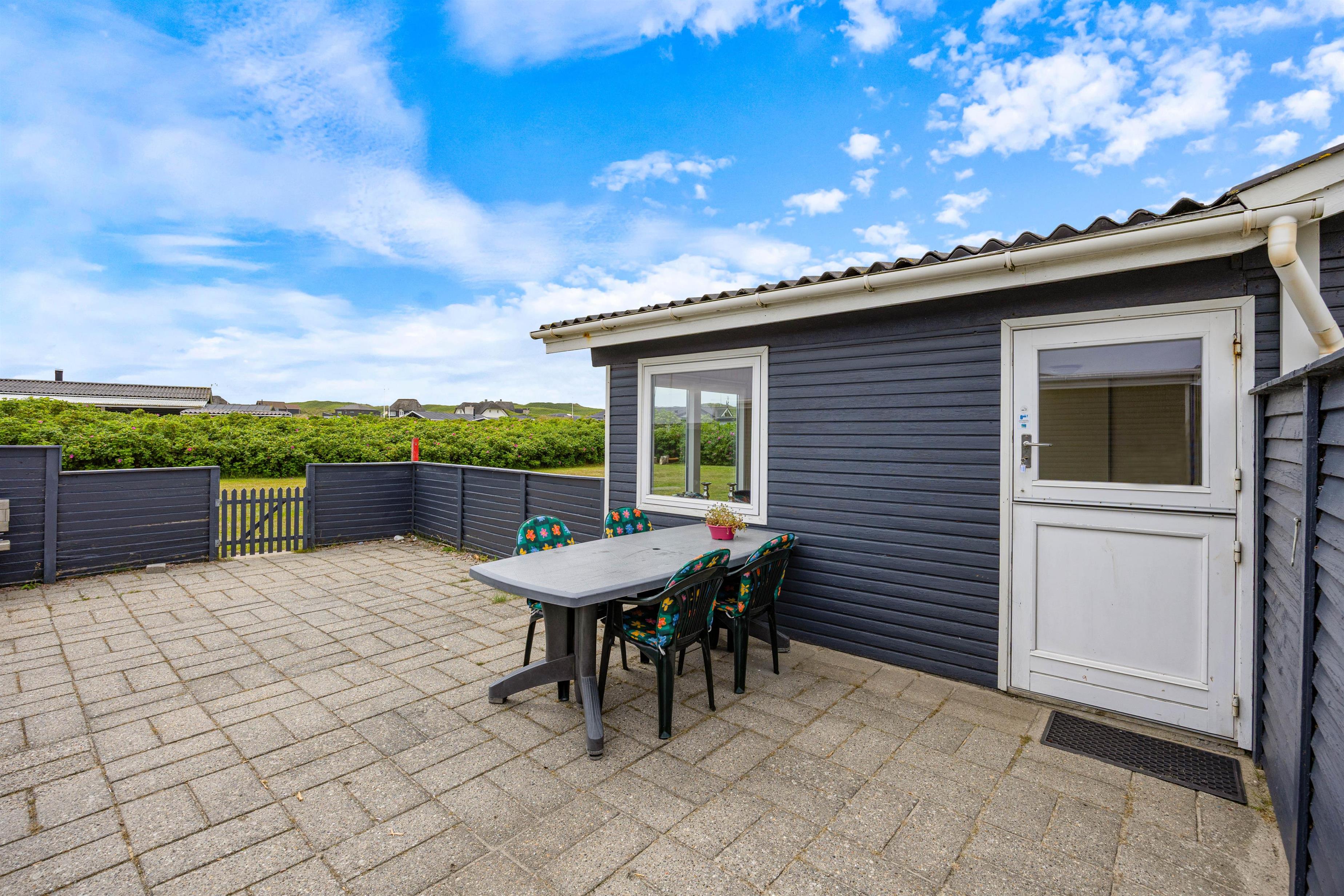 Et af husets highlights er den hyggelige udestue, hvor I har udsyn til den grønne have og resten af det livlige ferieområde i Søndervig - et oplagt sted at drikke eftermiddagskaffen eller tage et spil kort, når vejret ikke er helt med jer.