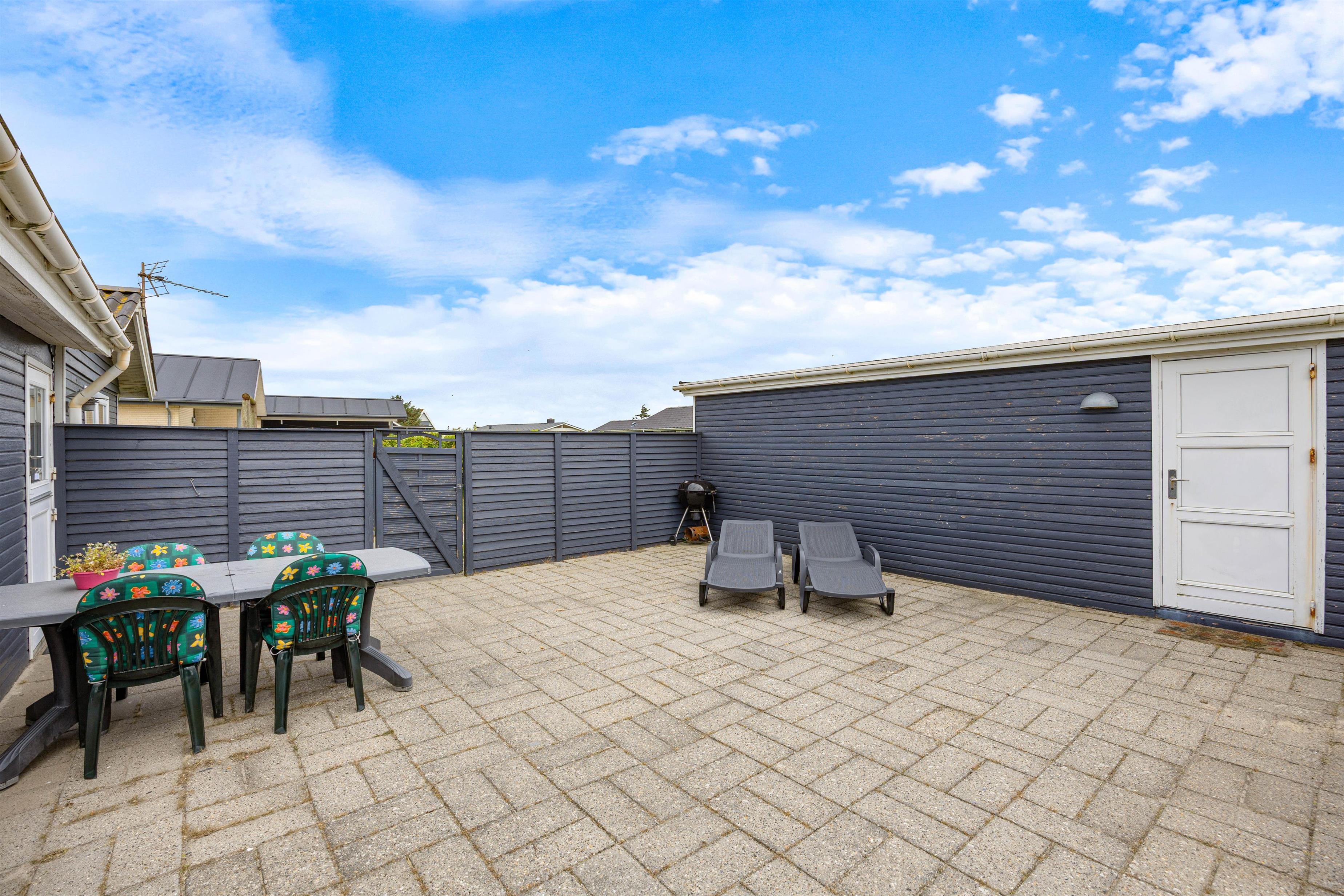 På de varme solskinsdage kan I rykke ud på den fine, lukkede terrasse, hvor I roligt kan lade børnene og hunden løbe rundt, mens I læner jer tilbage i liggestolene eller er i gang med at forberede aftenens middag på grillen. Rundt om huset går også en stor græsplæne, hvor der kan leges og spilles bold dagen lang.