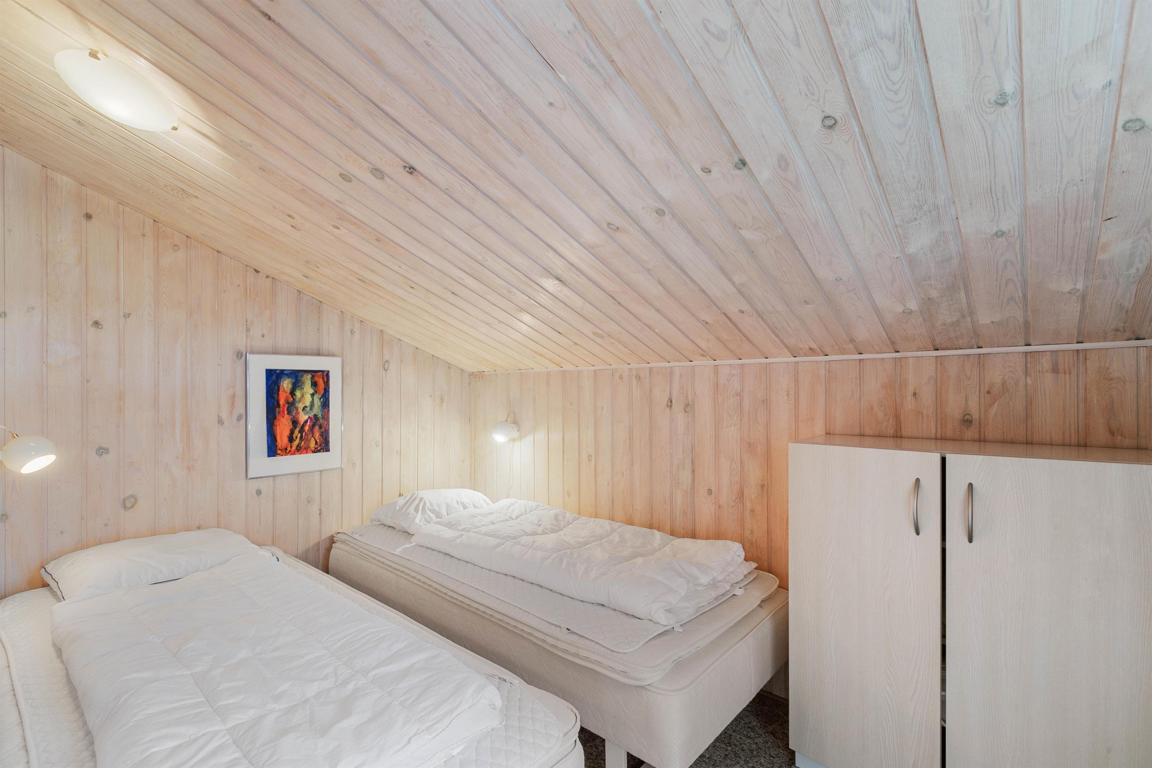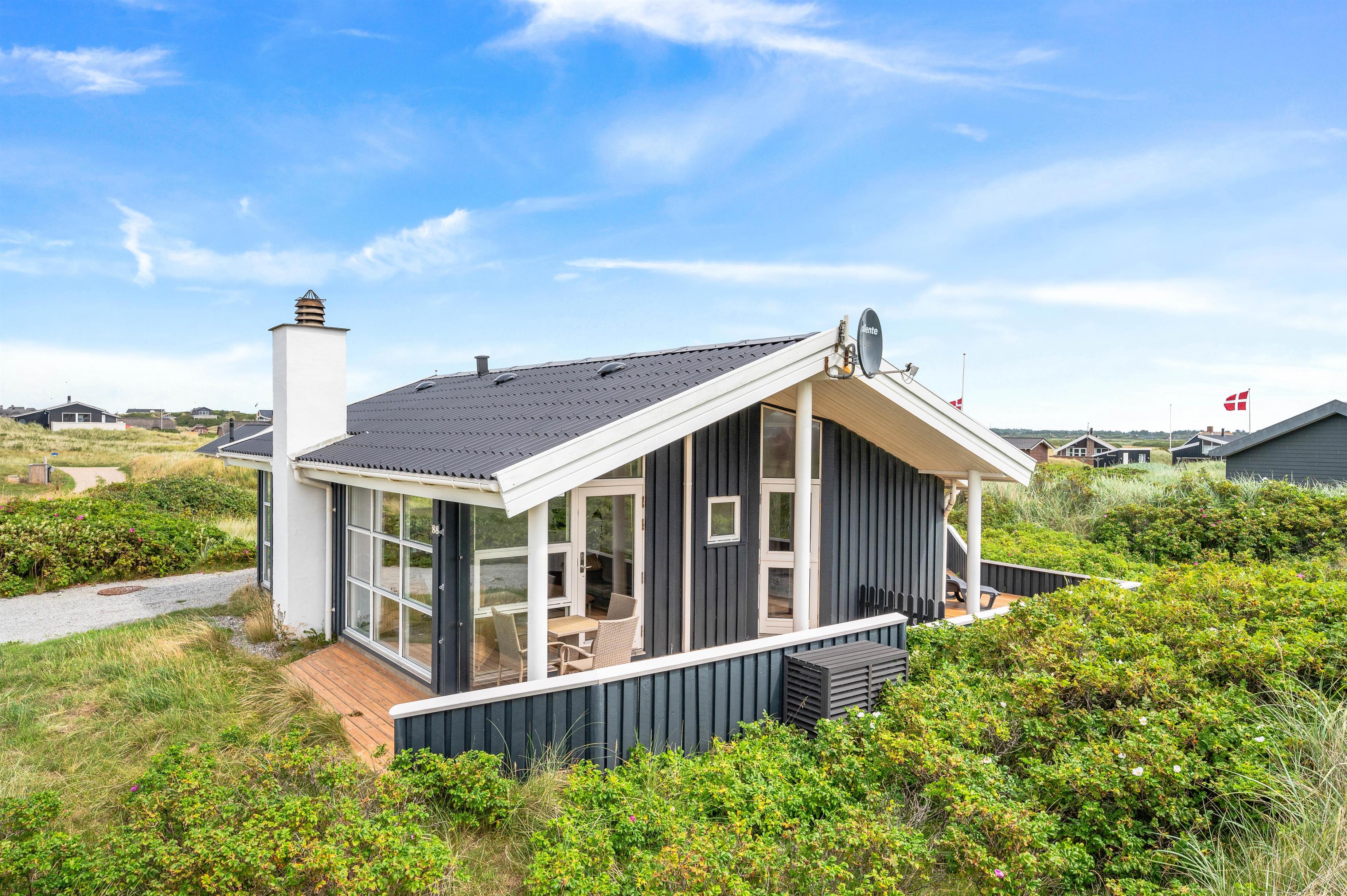 Feriehuset på Sand Holms Vej 88 er hyggeligt og venligt indrettet, og det ligger på en skøn naturgrund med kun få minutters gang til Vesterhavet. Somerhuset fordeler sig på 60 m2 og rummer fin plads til 4 personer, trods den mindre størrelse. Sommerhuset på Sand Holms Vej 88 fordeler sig på 2 soveværelser, hvoraf det ene har dobbeltseng og det andet 2 enkeltsenge. Derudover har huset et godt velindrettet badeværelse med vaskemaskine og gulvvarme. Opholdsstuen og køkkenet er i direkte forbindelse så alle kan følge med i madlavning og ferieplanlægningen. Her i stuen finder I også husets brændeovn, hvor I rigtigt kan slappe af foran de knitrende flammer med benene oppe.