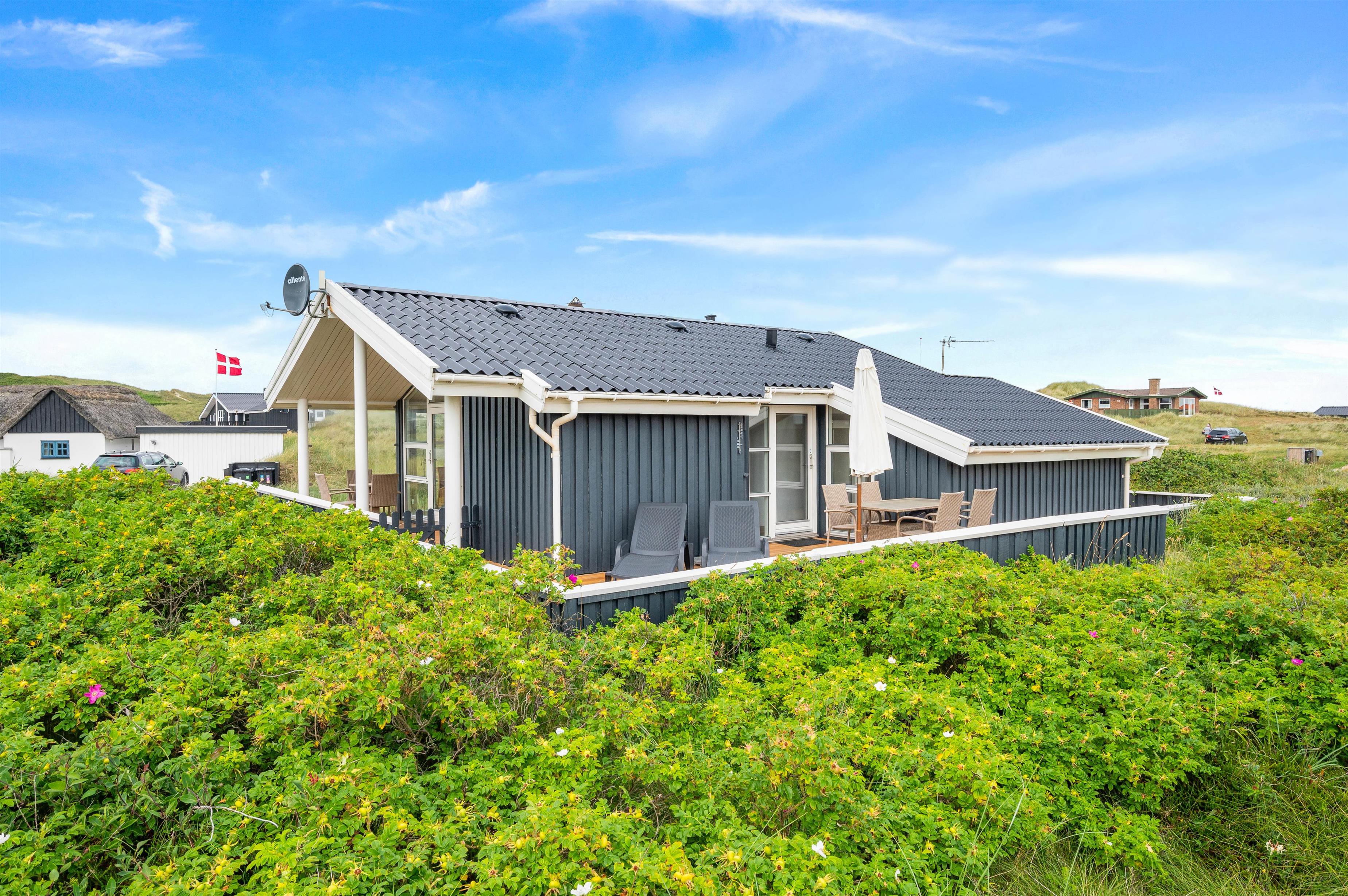 Somerhuset er omgivet af en delvist lukket træterasse, som går næsten hele vejen rundt om huset, hvilket er perfekt hvis I rejser med hund eller små børn. Her er god mulighed for at nyde solens stråler mens I kigger ud i rosenbuskene og sommerhusområdet. Der er både havemøbler og solsenge til fri afbenyttelse. Der er selvfølgelig også en grill til rådighed, så I kan grille et dejligt måltid mad her på terrassen.