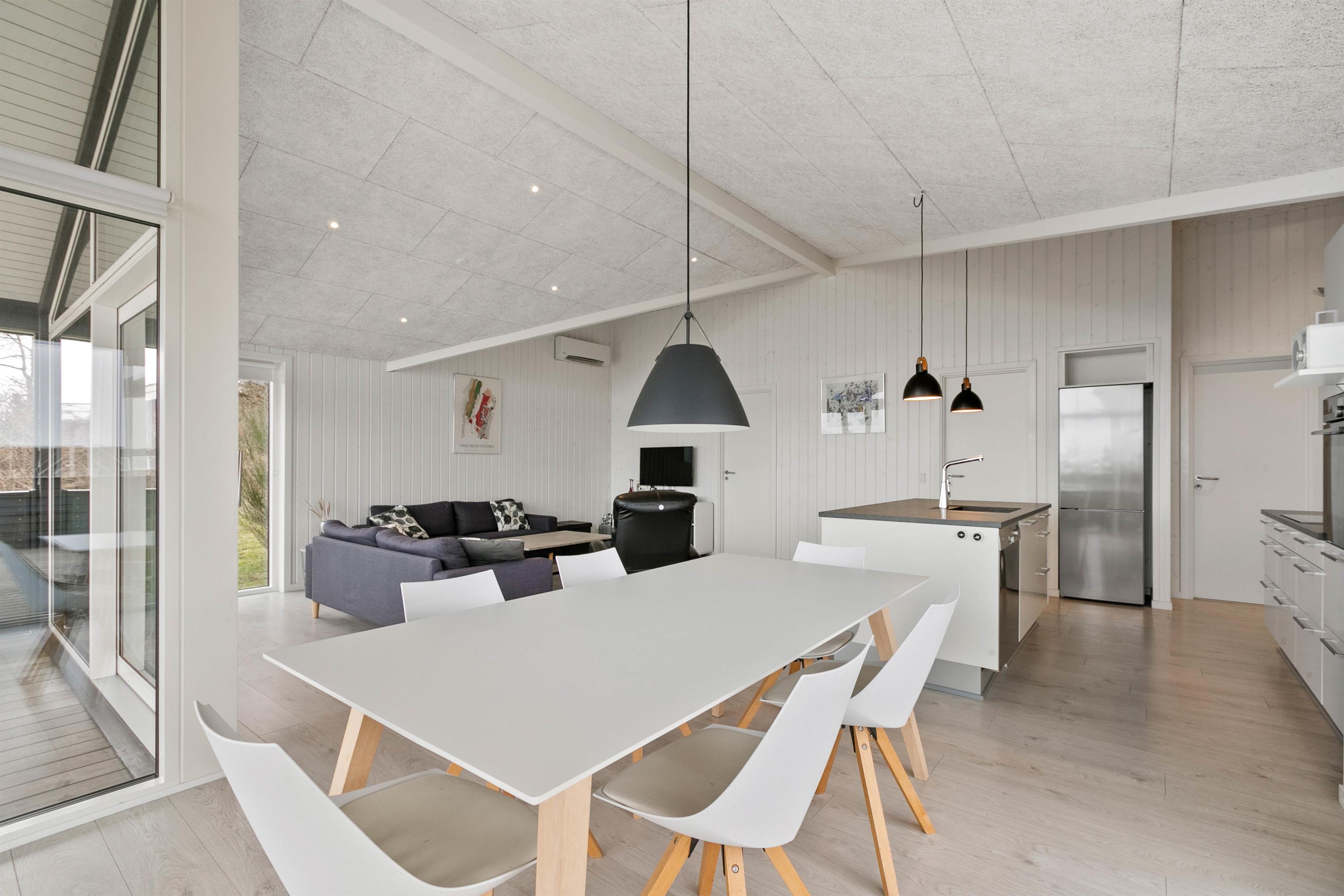I det velindrettede ferierum er stue, køkken og spiseafdeling slået sammen til ét stort fællesrum, hvor rammerne er sat for en masse nye ferieminder med hele familien. Huset er rummeligt hele vejen igennem, den smagfulde indretning skaber en god ferieatmosfære og de store vinduer lukker solens lys indenfor. Det skønne troldtekts loft der går helt til kip, er også en fantastisk detalje ved dette hus, da det også skaber en god rummelig rumfornemmelse, hvor I virkelig kan slappe af.