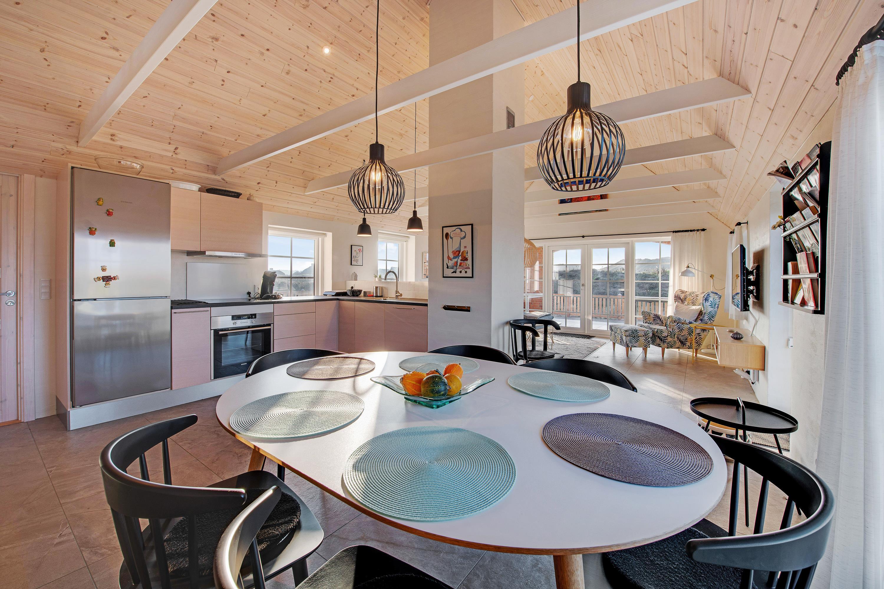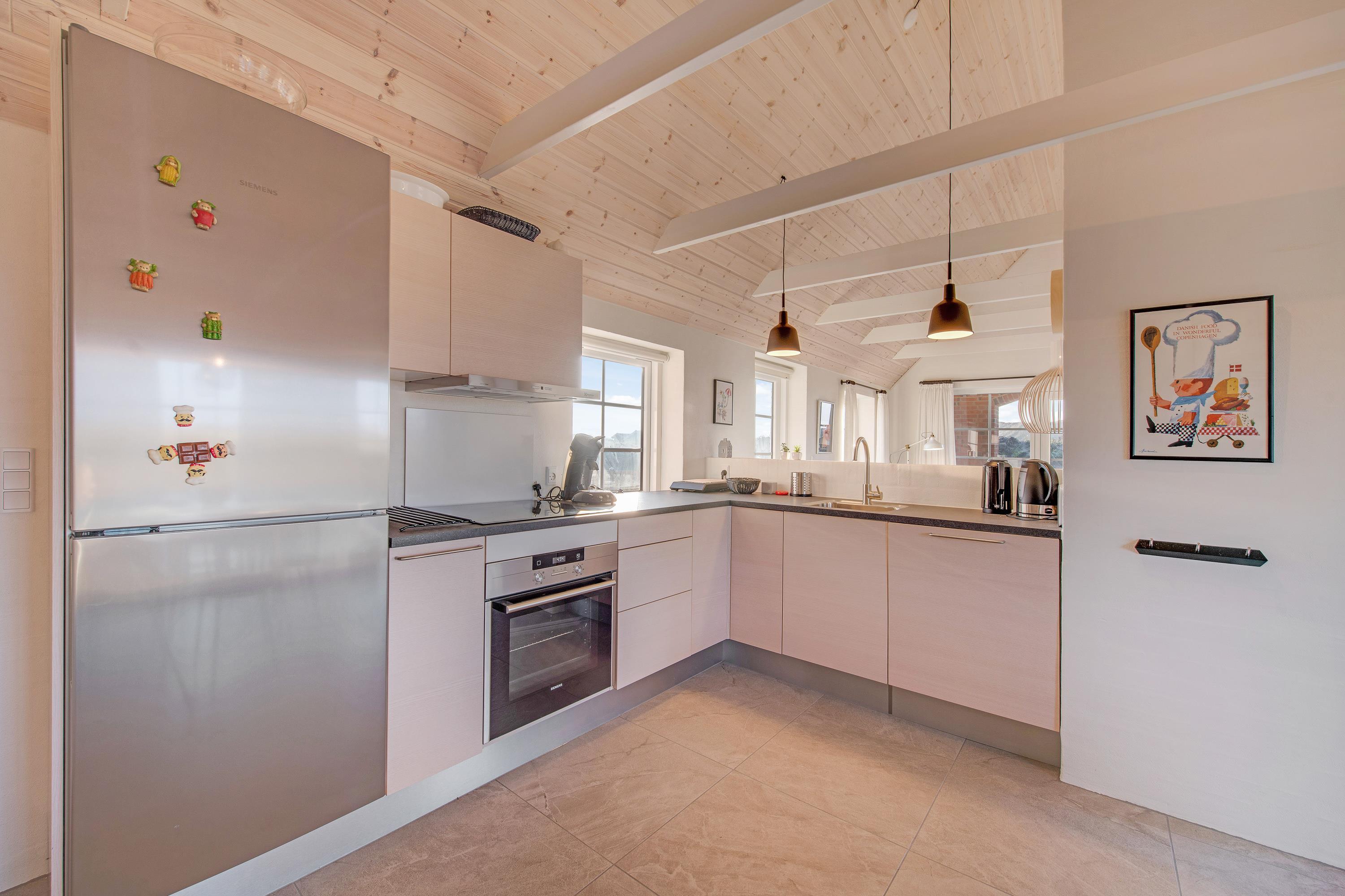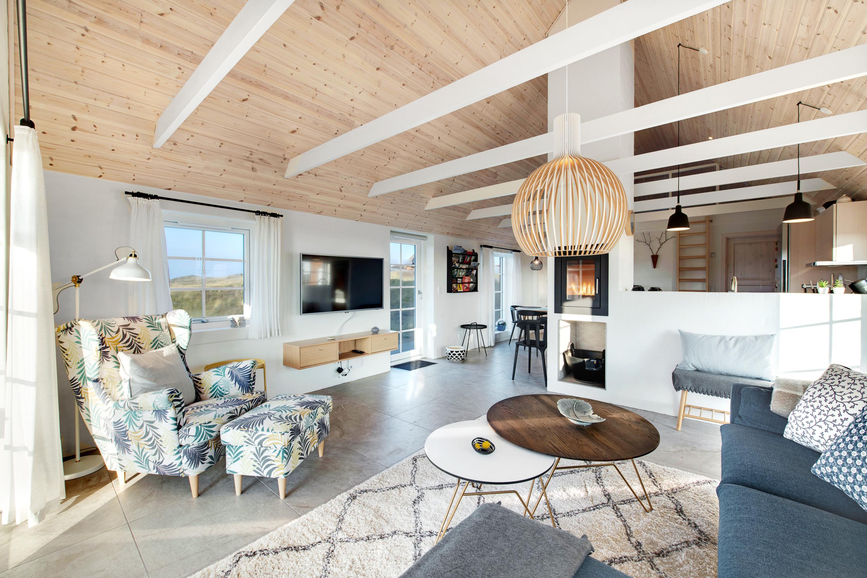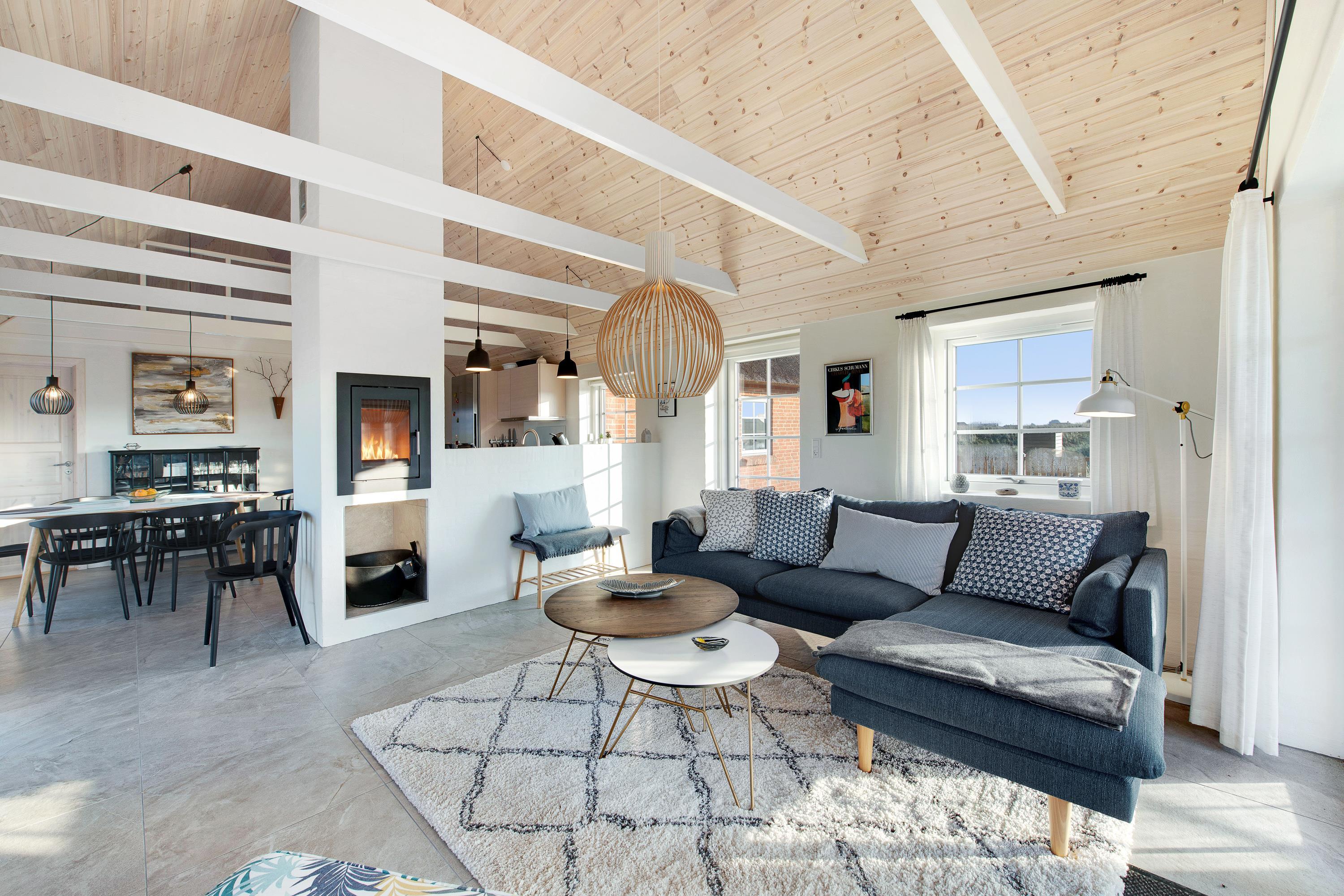 Den første kop morgenkaffe nydes på terrassen med ryggen op af husmuren, der er godt i gang med at optage solens varme. Udsigten er fantastisk – lyngens rødbrune toner blander sig med det lysegrønne spil fra marehalmen, om sommeren synger lærken over sin rede i klitterne og altid har I lyden af bølgerne, som kalder til en morgentur på stranden. Her er det smukt hele året rundt. Indenfor indbyder den stilfulde indretning til mange hyggelige timer med fællesskab og hygge i stuen med brændeovnen eller med fælles madlavning i det åbne moderne køkken med opvaskemaskine.