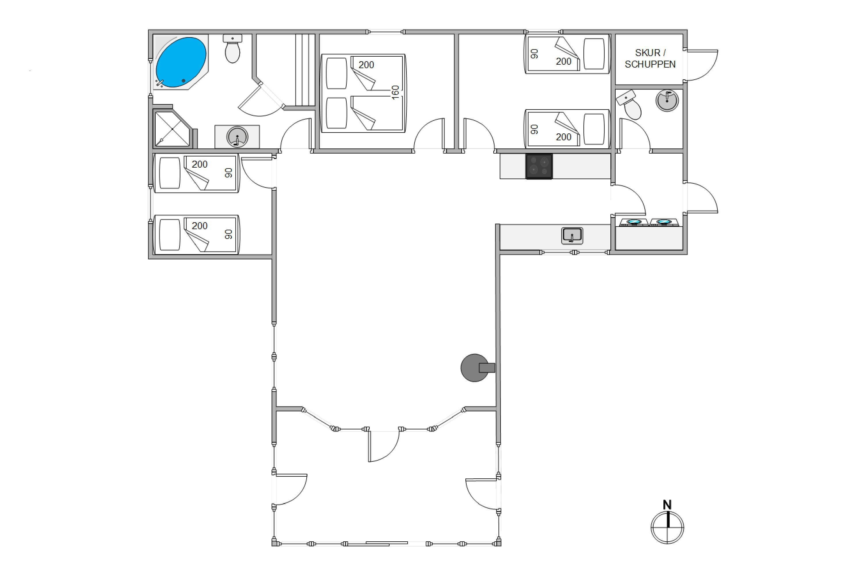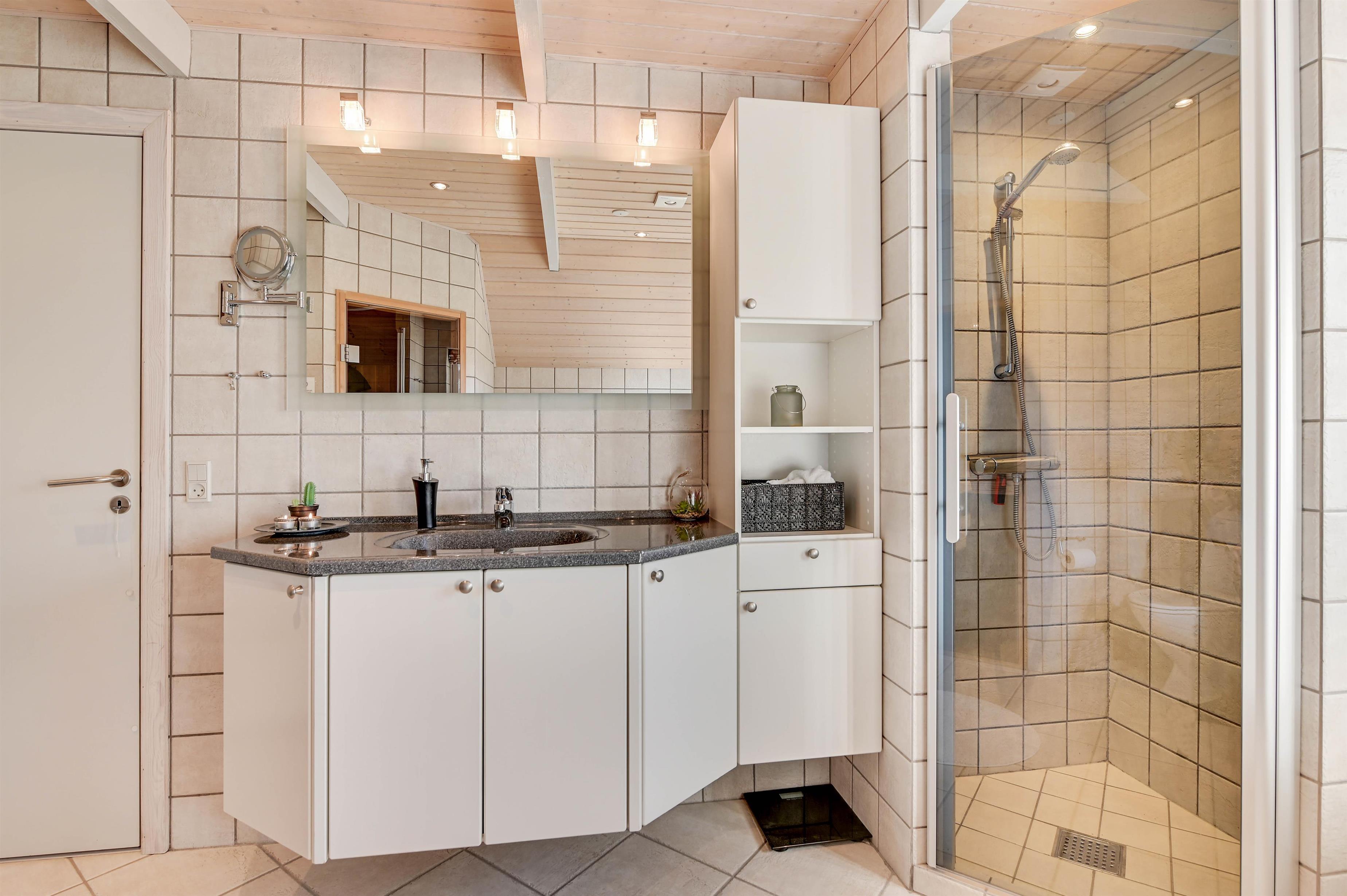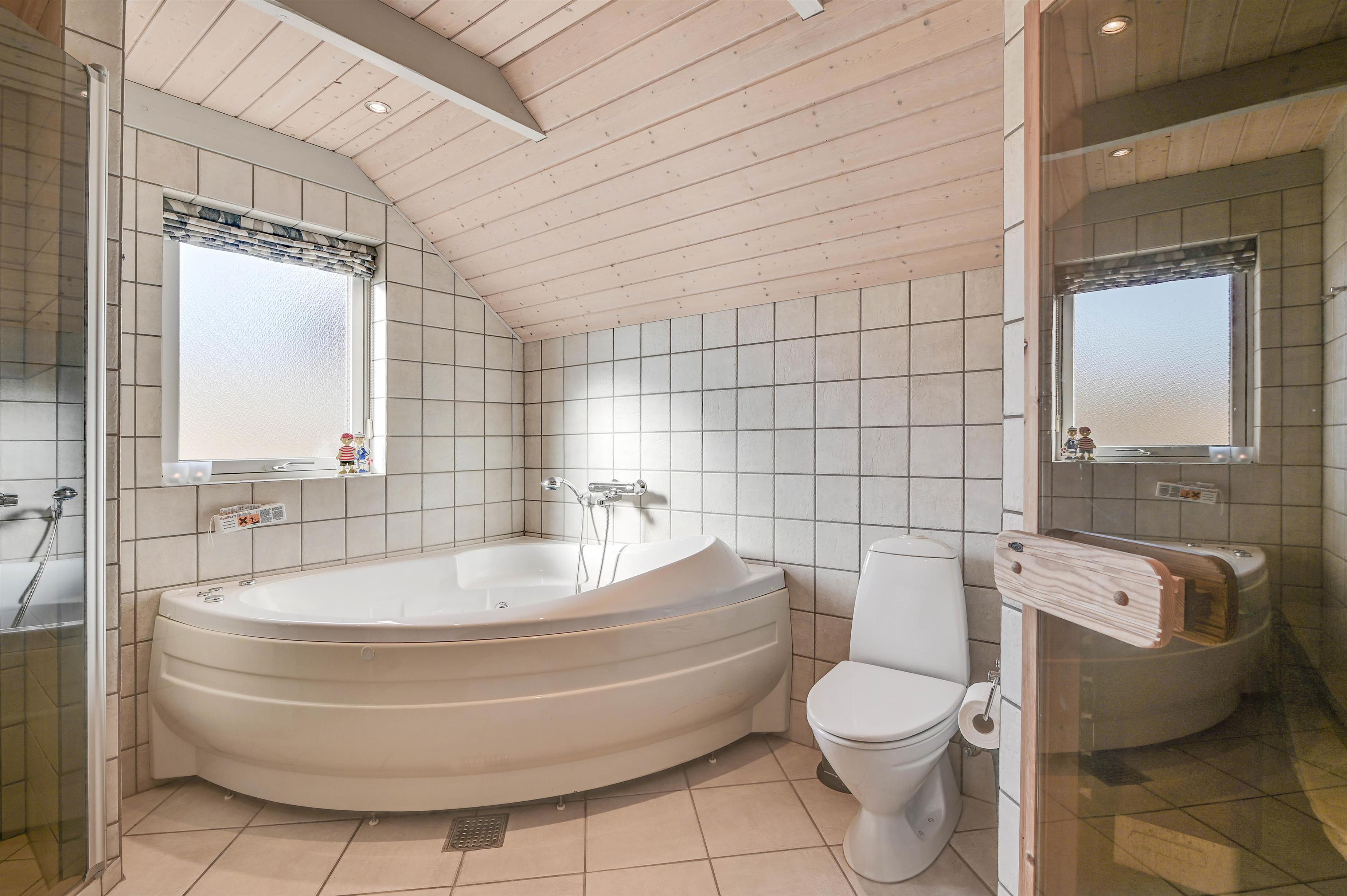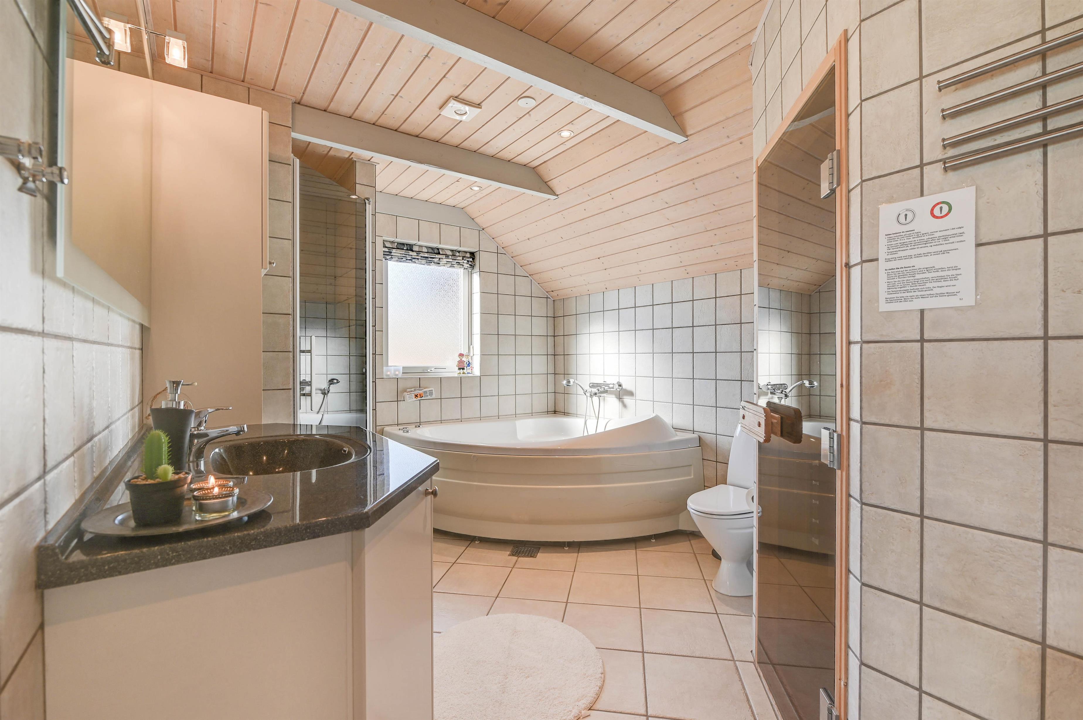 I sommerhuset er der ingen risiko for kødannelse til toilettet – her har I nemlig både et badeværelse og et gæstetoilet. På badeværelset kan I også holde en wellness-session i spaen og saunaen – der er garanti for masser af afslapning.