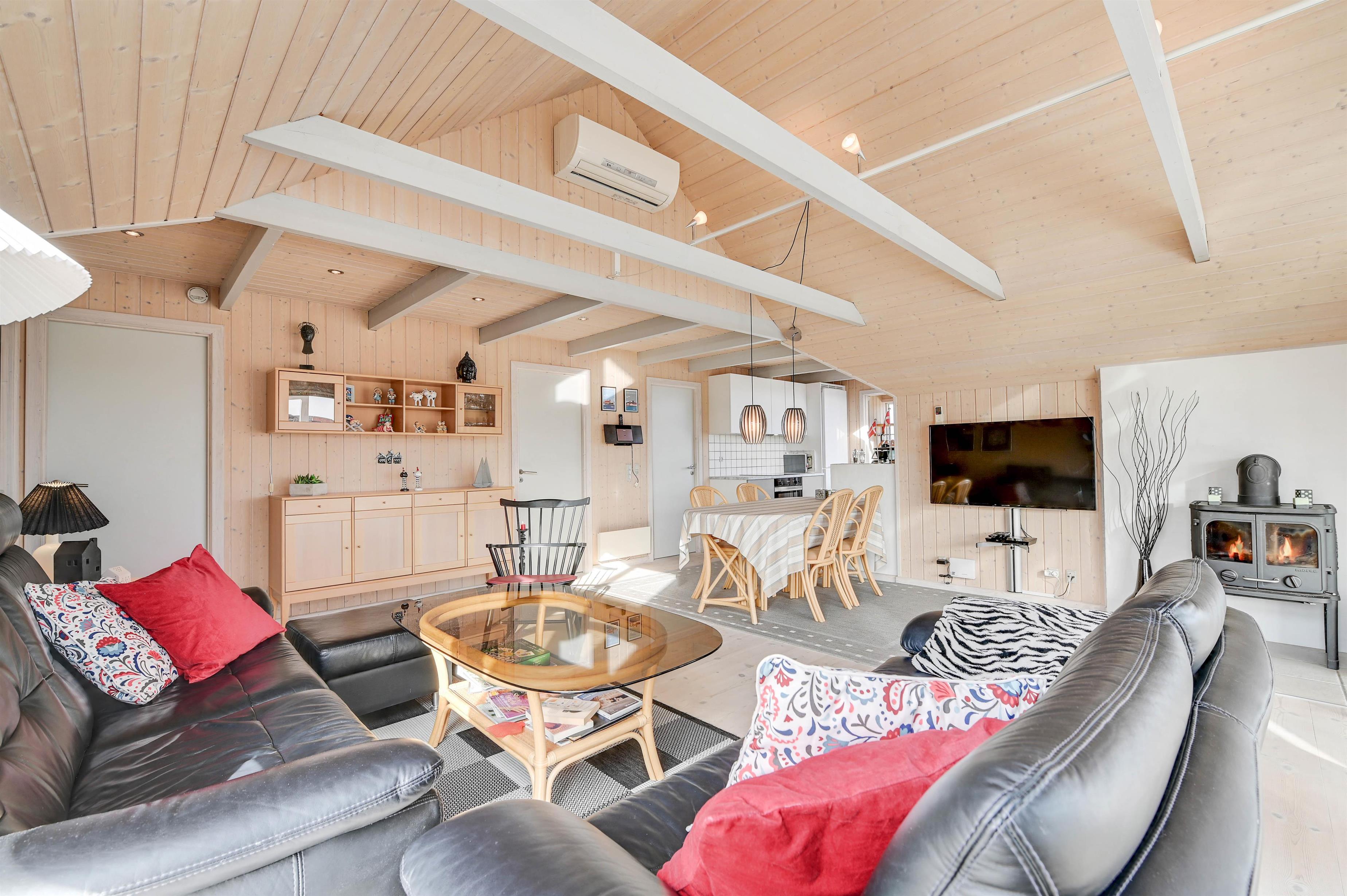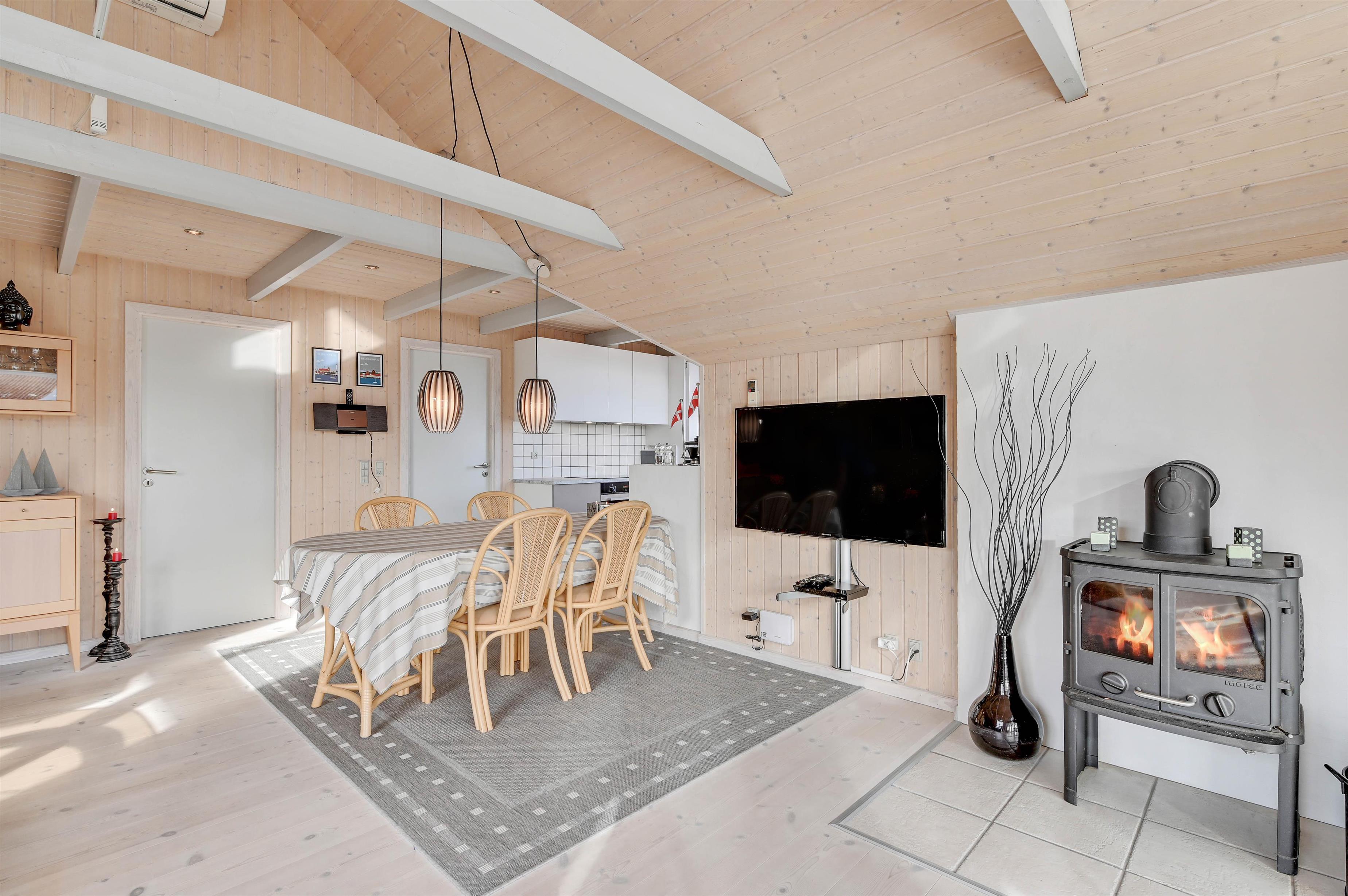 Fra køkkenet er der åbent til det store alrum, hvor I kommer til at tilbringe meget af jeres ferietid sammen. I det lyse rum er der lagt op til sjove stunder med spil omkring bordet eller gode film i sofaerne. Uanset, så sørger brændeovnen for at fuldende den hyggelige sommerhusstemning. Desuden opvarmes sommerhuset af en energivenlig varmepumpe.