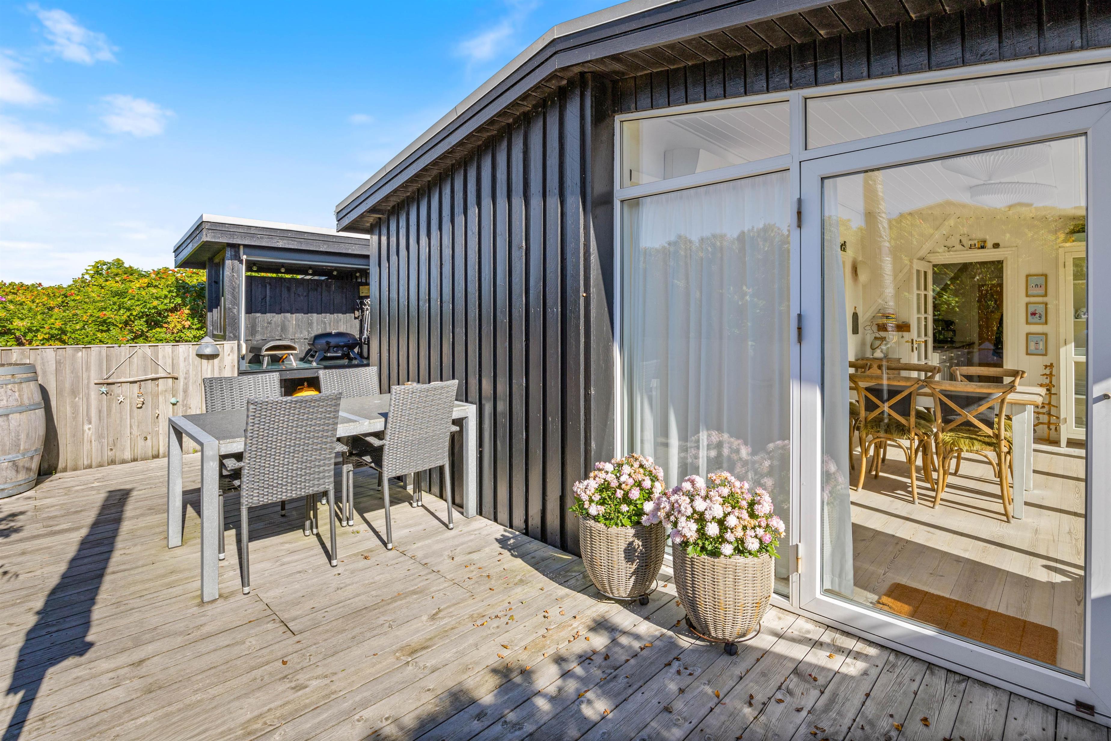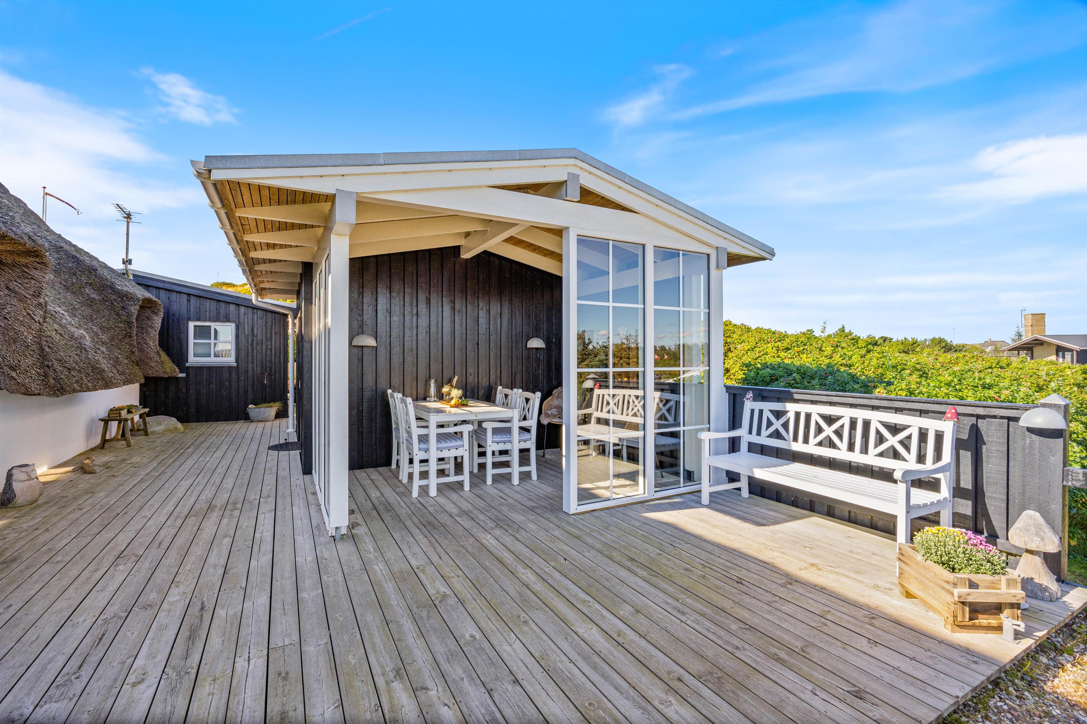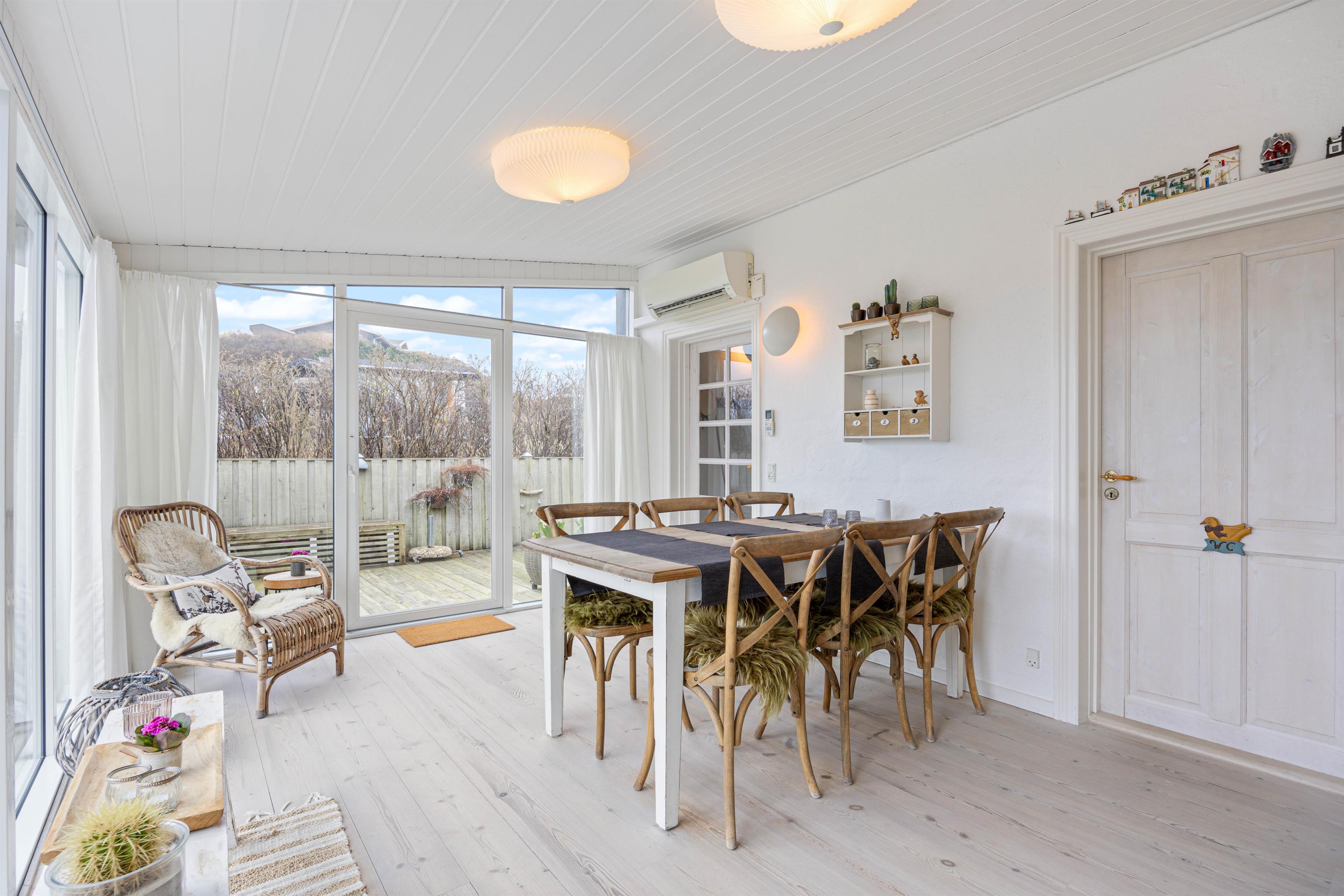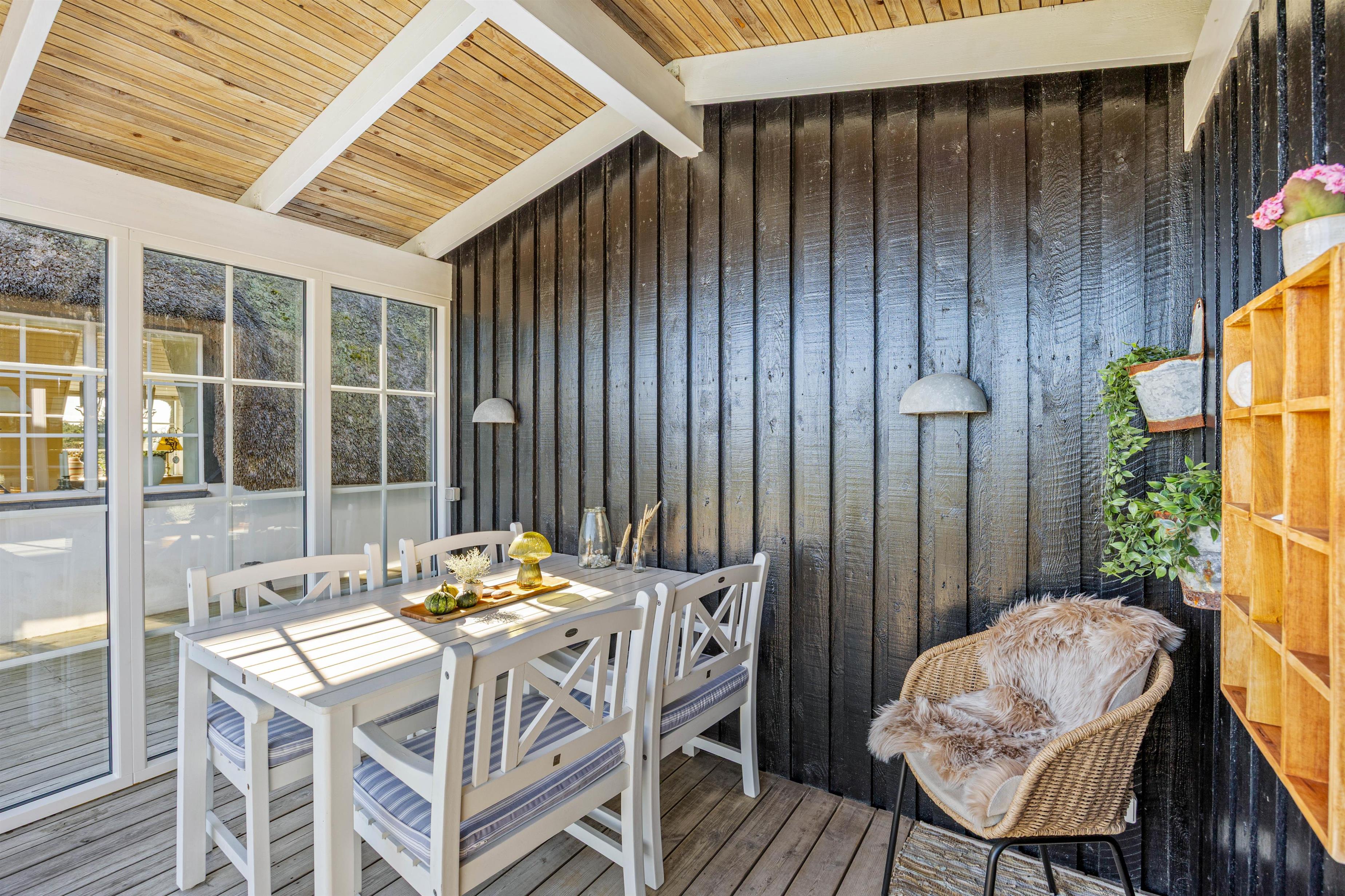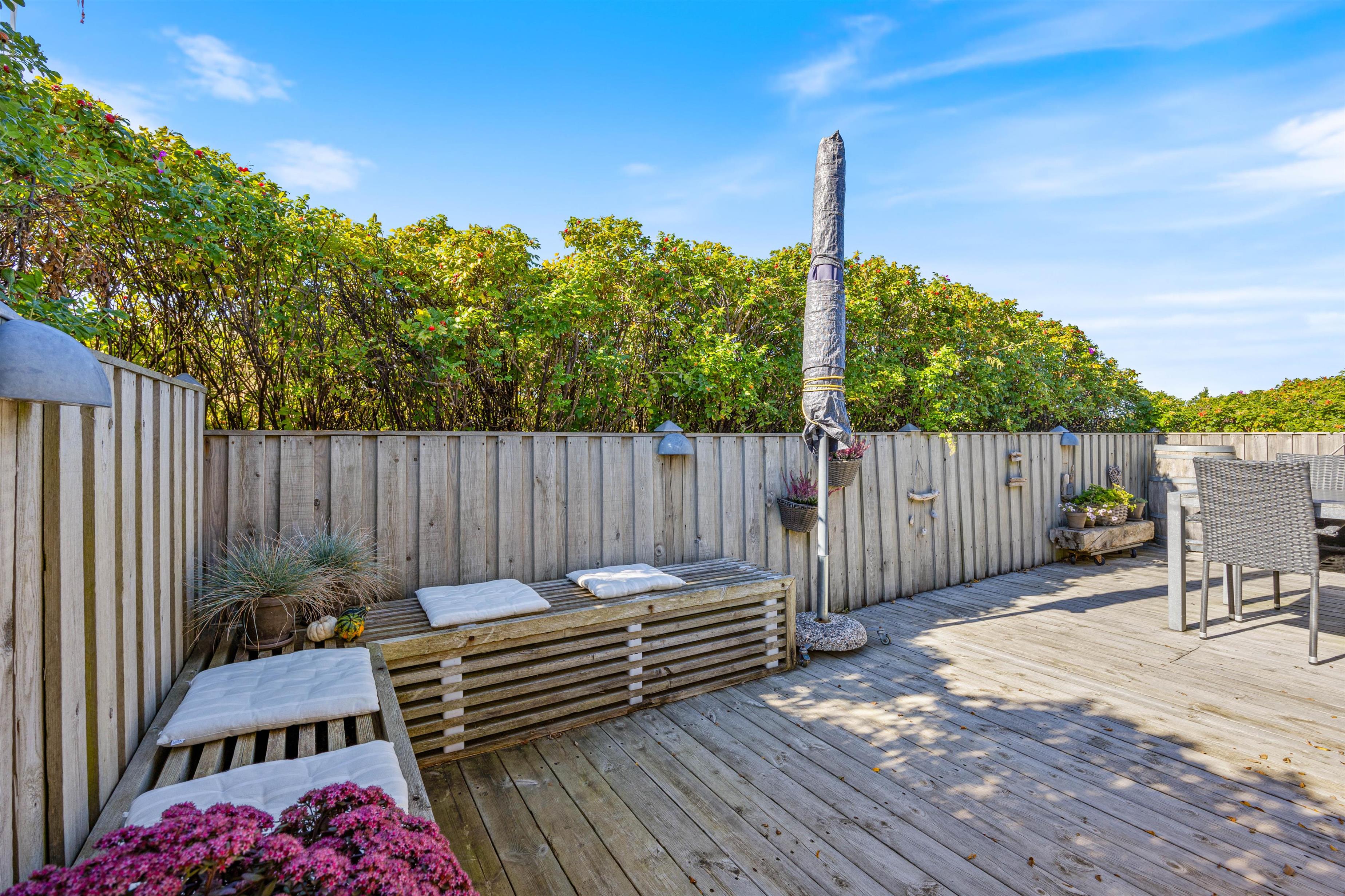 I sommerhuset på Nordsøvej 200 er der mange skønne lækroge og I vil altid kunne finde et hyggeligt sted at slappe af og nyde den smukke omgivende natur. Den overdækkede terrasse er perfekt til at nyde en varm kop kaffe om morgenen eller en drink om aftenen, selv hvis vejret ikke er helt perfekt.