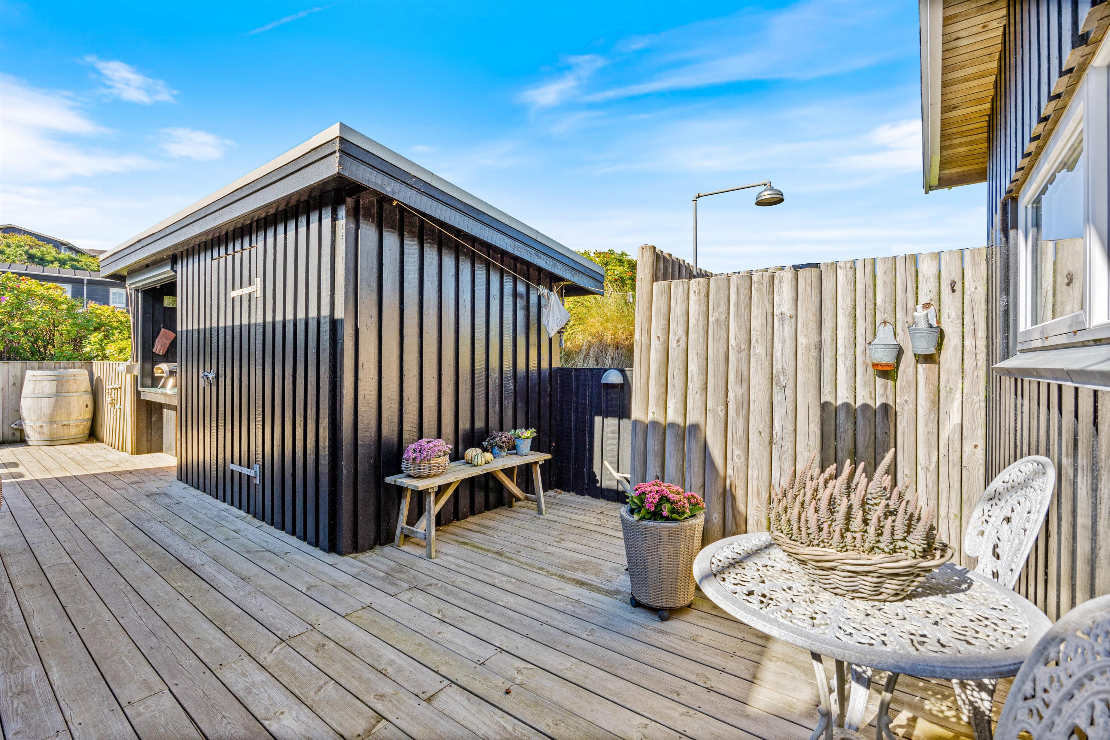 Bålstedet er det perfekte sted at samles om aftenen, hvor I kan tilbringe tid sammen ved ilden og nyde stemningen – måske endda riste snobrød? Der er også solvogne og parasoller, så I kan nyde solen og varmen i haven, når vejret er godt. Bliver det lidt for varmt, kan I tage en skyller under udebruseren, som er tilgængelig fra april til og med oktober.