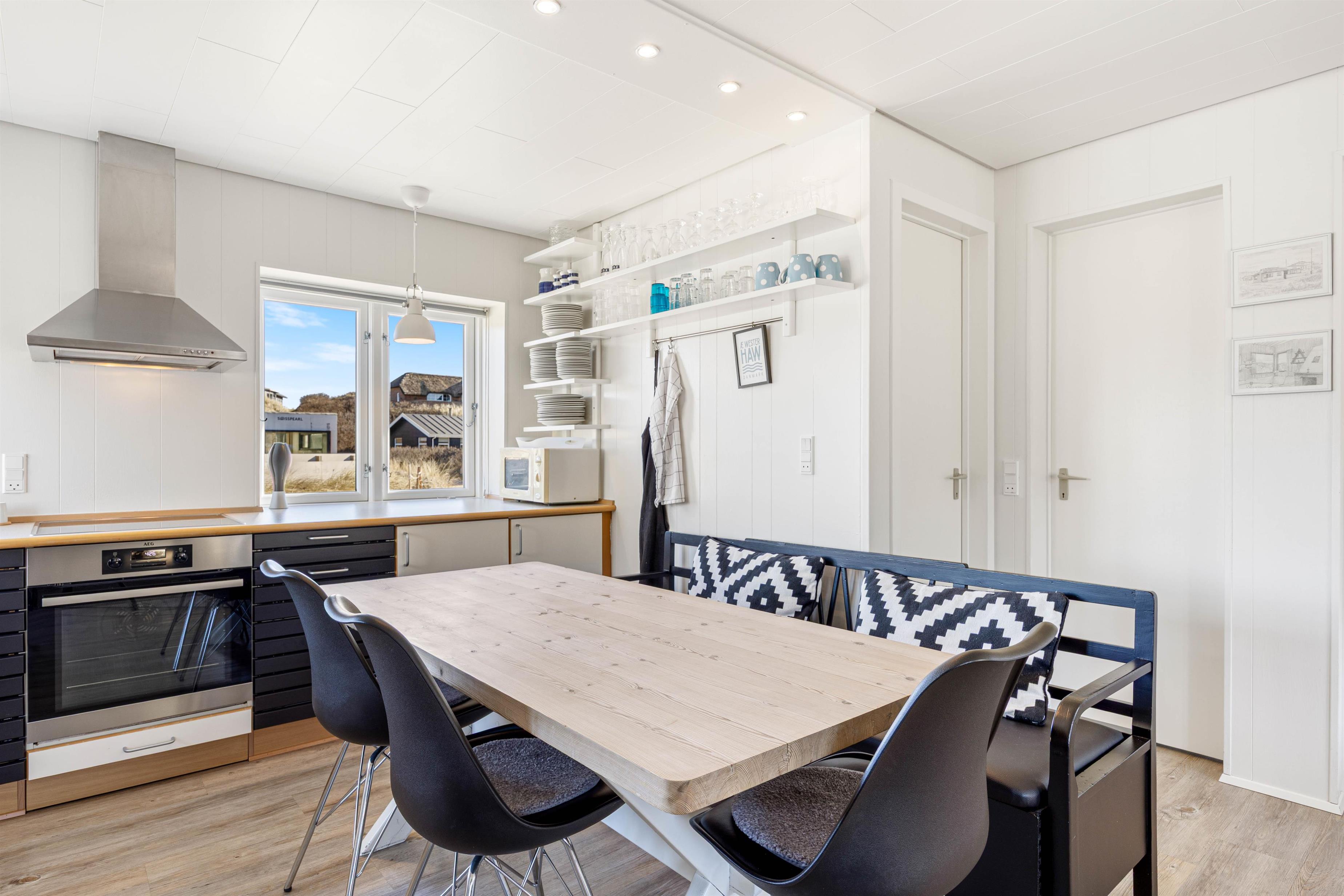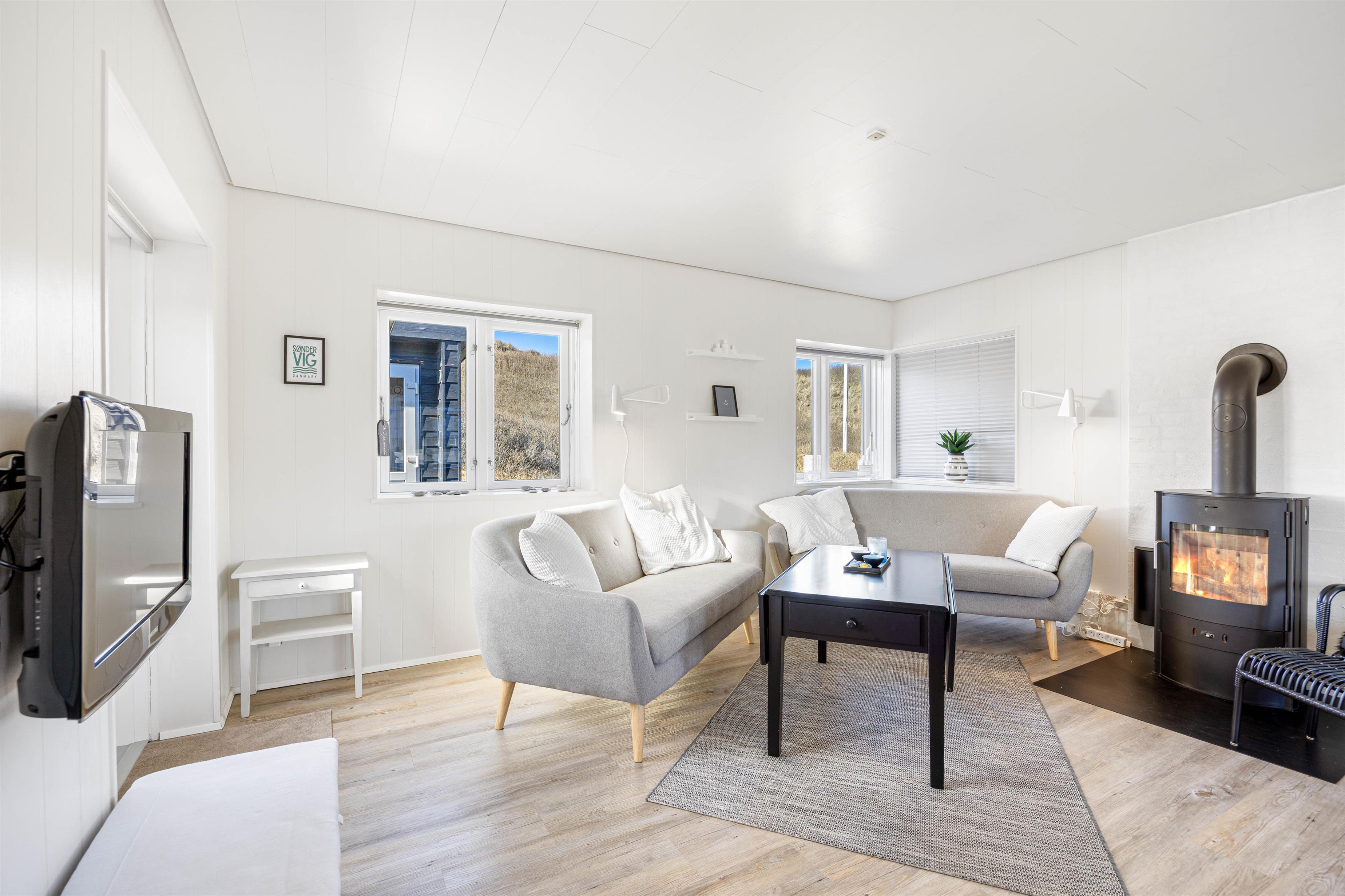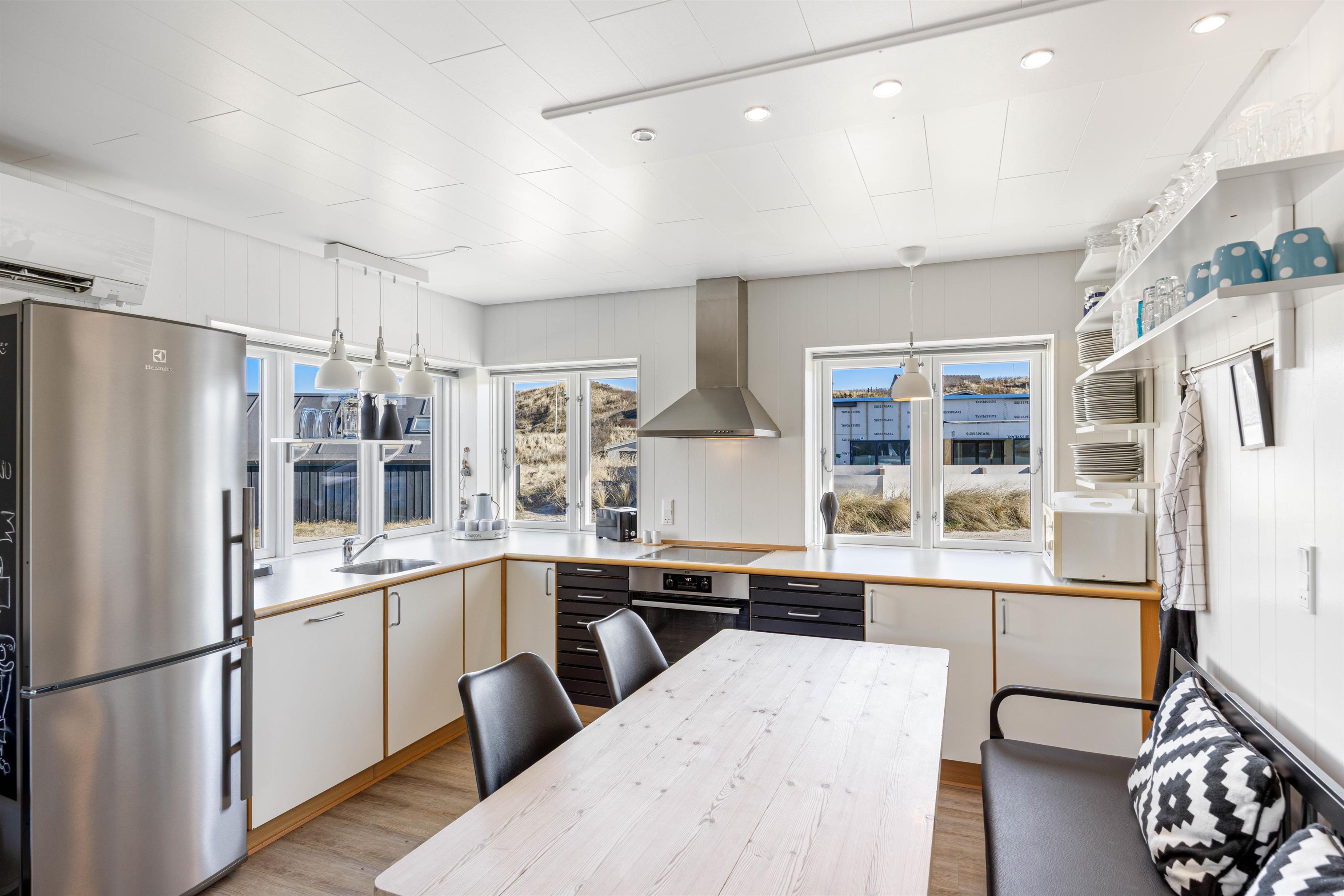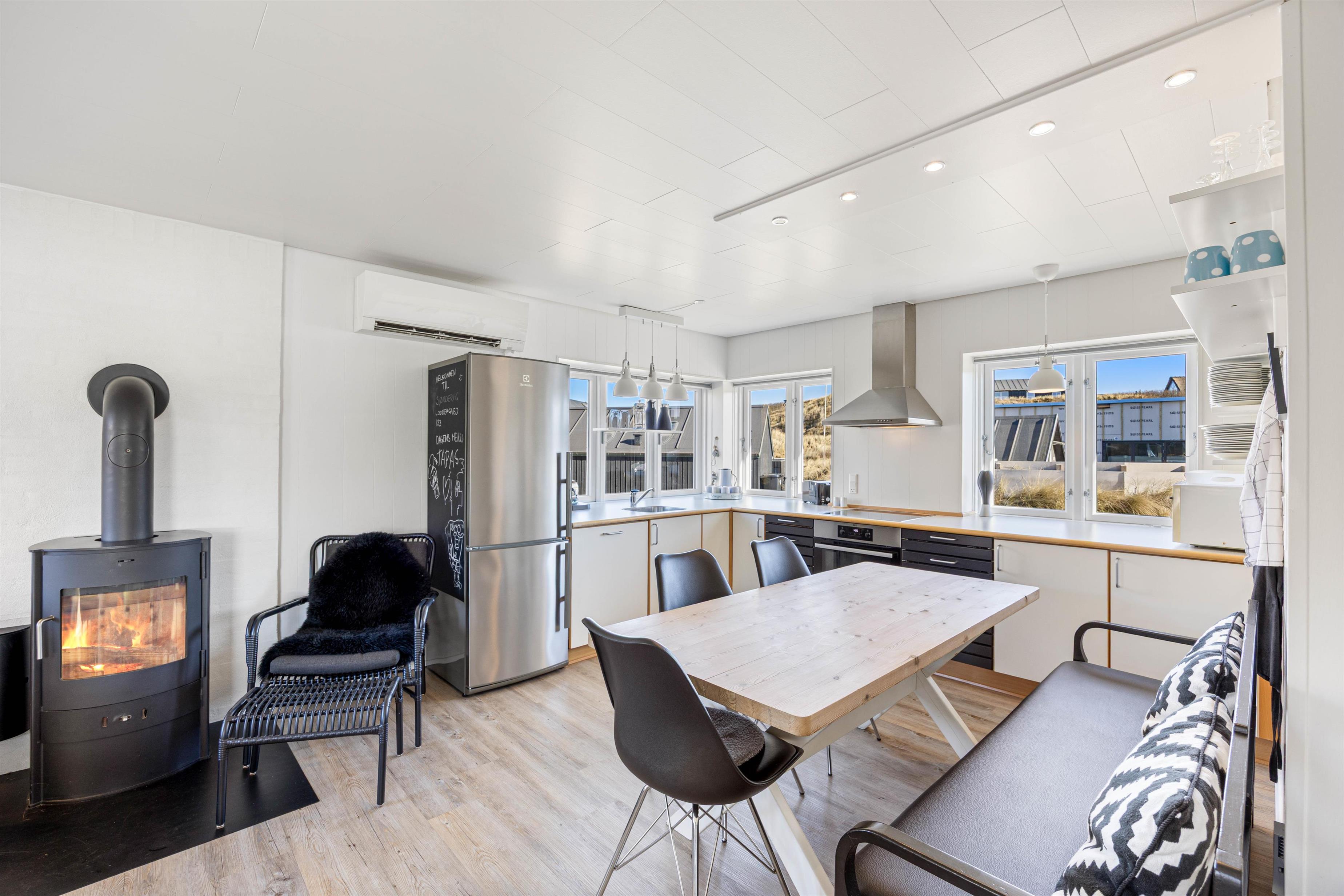 Sommerhusets indretning er omhyggeligt planlagt med tre gode rummelige soveværelser, der hver er udstyret med en dobbeltseng, hvilket giver mulighed for at 4 glade feriegæster kan holde en god ferie sammen her. Sommerhuset har to badeværelser med gulvvarme, som giver en ekstra følelse af luksus på de kølige morgener. Derudover er der en praktisk udebruser, som er perfekt til at skylle sandet af efter en dag på stranden. Brændeovnen i sommerhusets stue er med til at skabe hyggelige aftener, og en energibesparende luft til luft varmepumpe sikrer en behagelig indeklima hele året rundt.