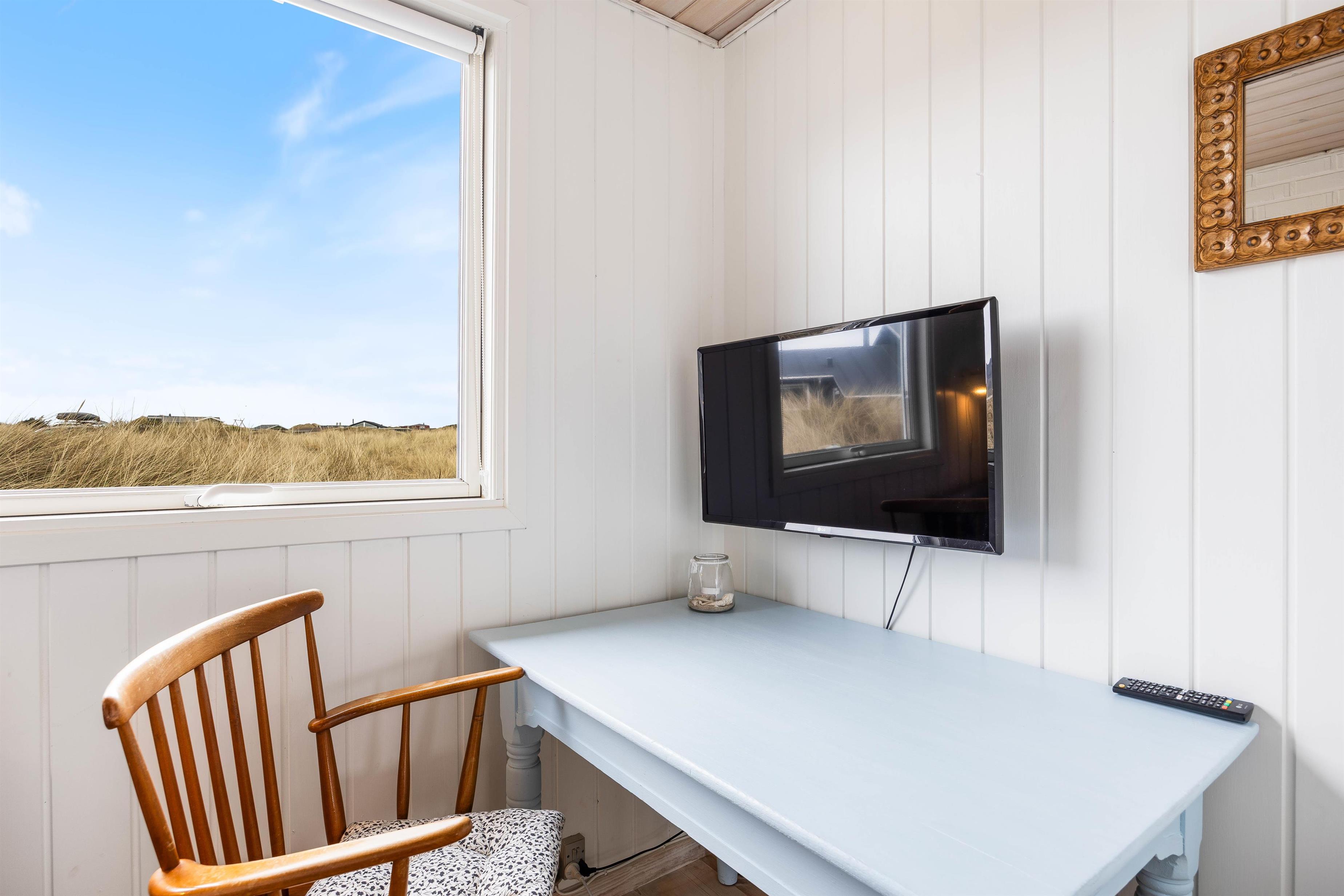 Hele sommerhuset har hvidmalede vægge og lofter, og de store vinduespartier skaber ikke mindst lyse og indbydende omgivelser. Fra den skønne opholdsstue er der direkte udsyn til naturområdet, der omgiver sommerhuset, og her føler I jer straks godt tilpas. Opholdsstuen er lys og venlig, og her kan familien samles foran brændeovnen til en god film på sommerhusets fladskærms-tv.