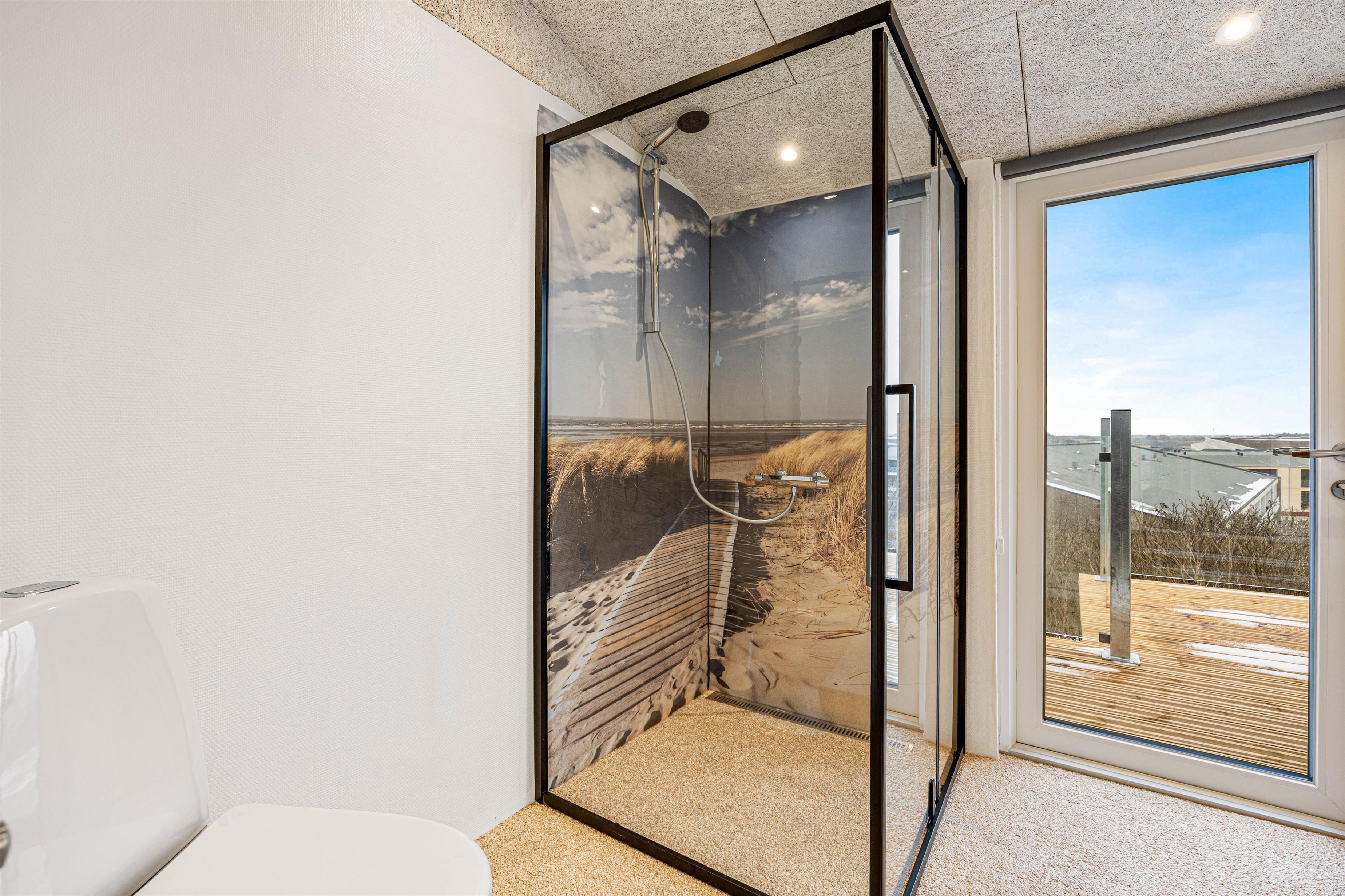 Efter en lang dag ved stranden kan sandet nemt skylles af fødderne under udebruseren, som kan benyttes fra april til og med oktober.