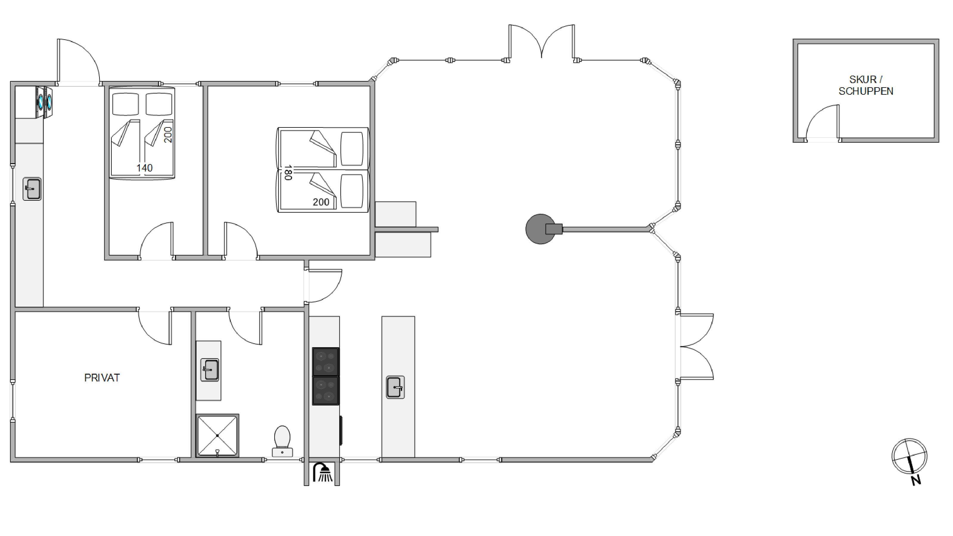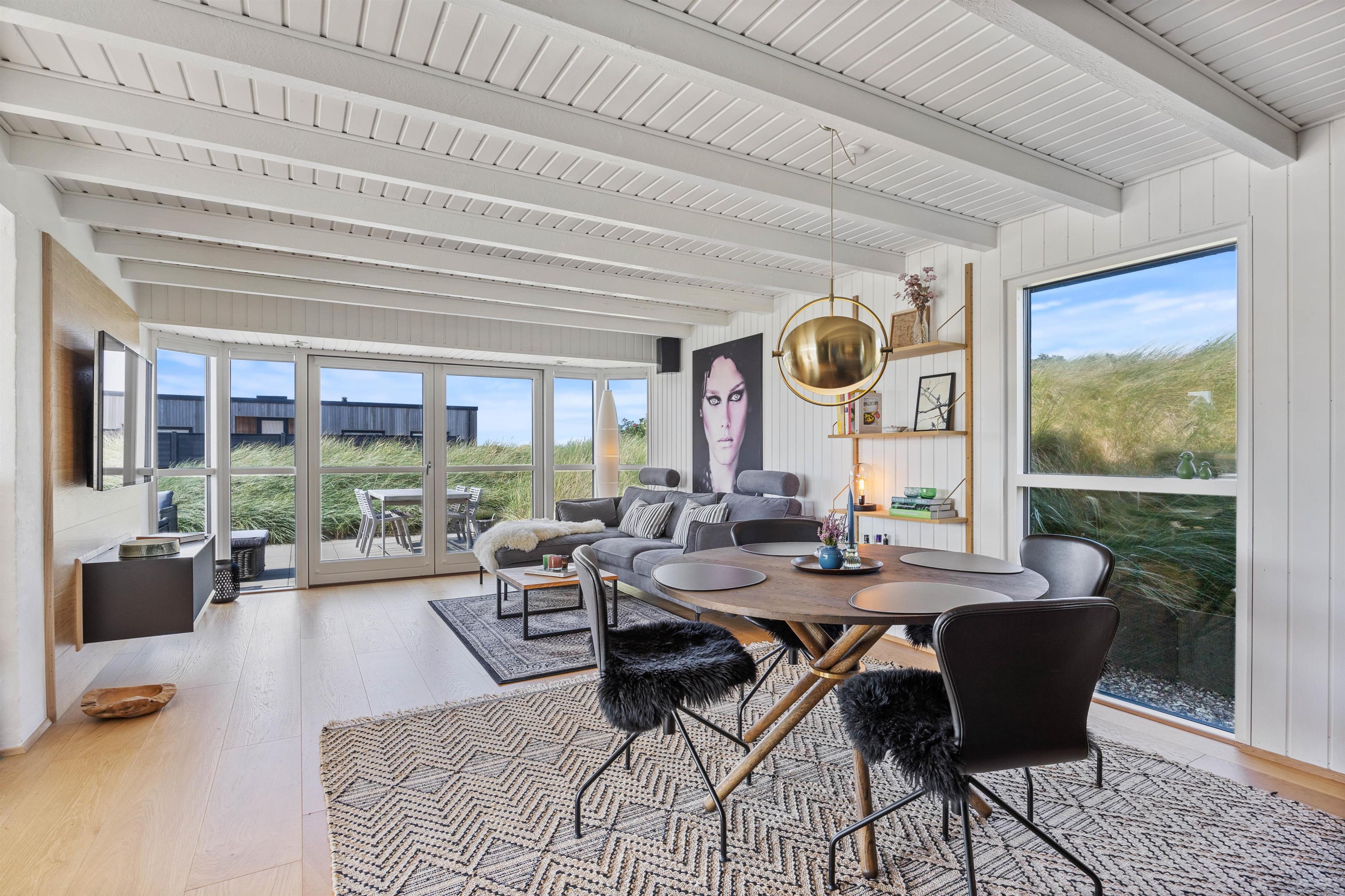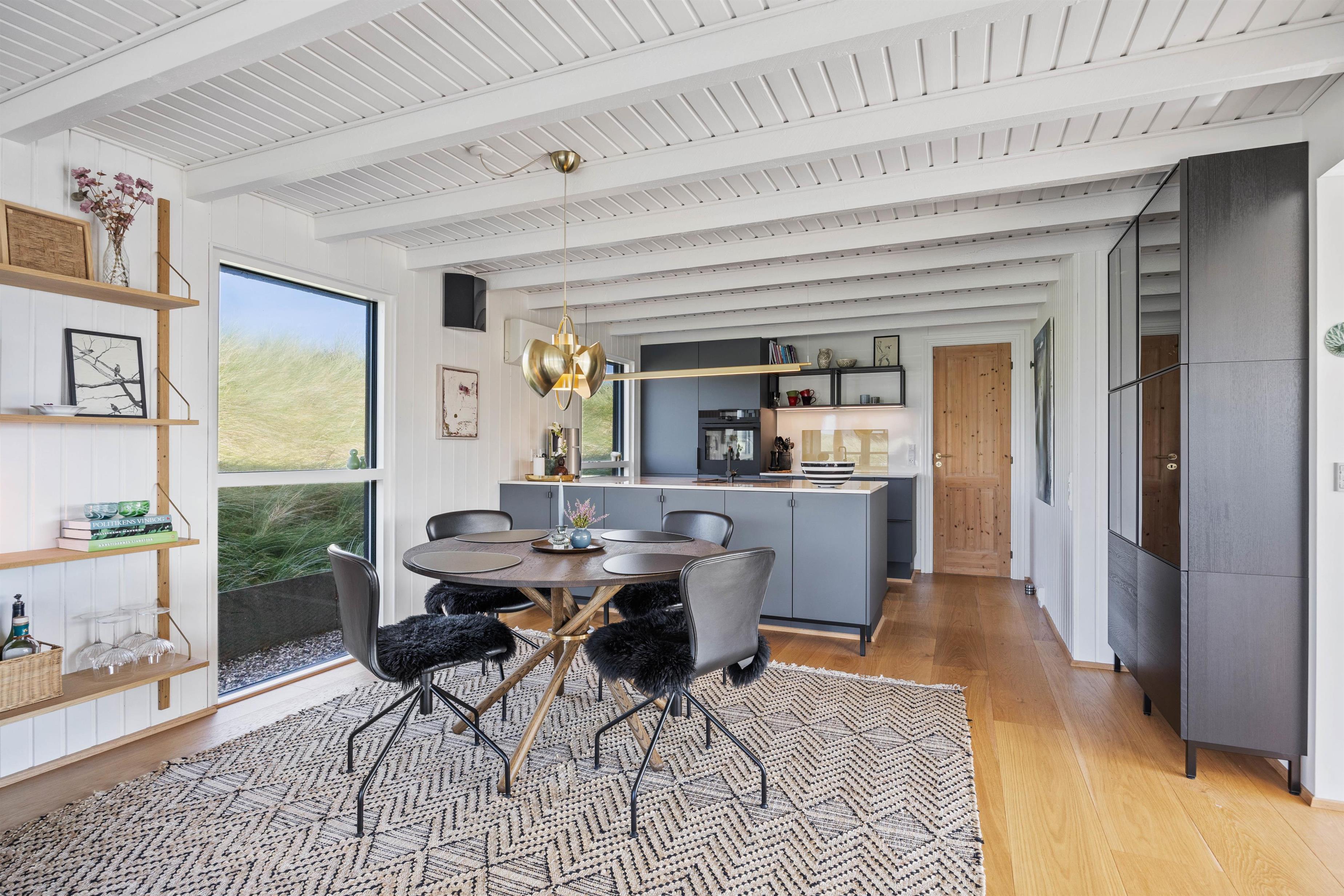 Fra det øjeblik I træder ind ad døren, vil I straks føle jer hjemme i sommerhuset. Det er flot og lyst indrettet med hvide vægge og lofter, som gør det rigtig indbydende og sørger for en behagelig atmosfære. Det lækre moderne køkken og stuen er slået sammen, så der er mulighed for samvær og hygge, selv når aftensmaden skal tilberedes eller feriens kommende aktiviteter planlægges. Her er lagt op til mange skønne ferieminder i den virkelig dejlige indretning. I kan synke ned i sofaen og slappe af og få ladet op mentalt, mens maden tilberedes.