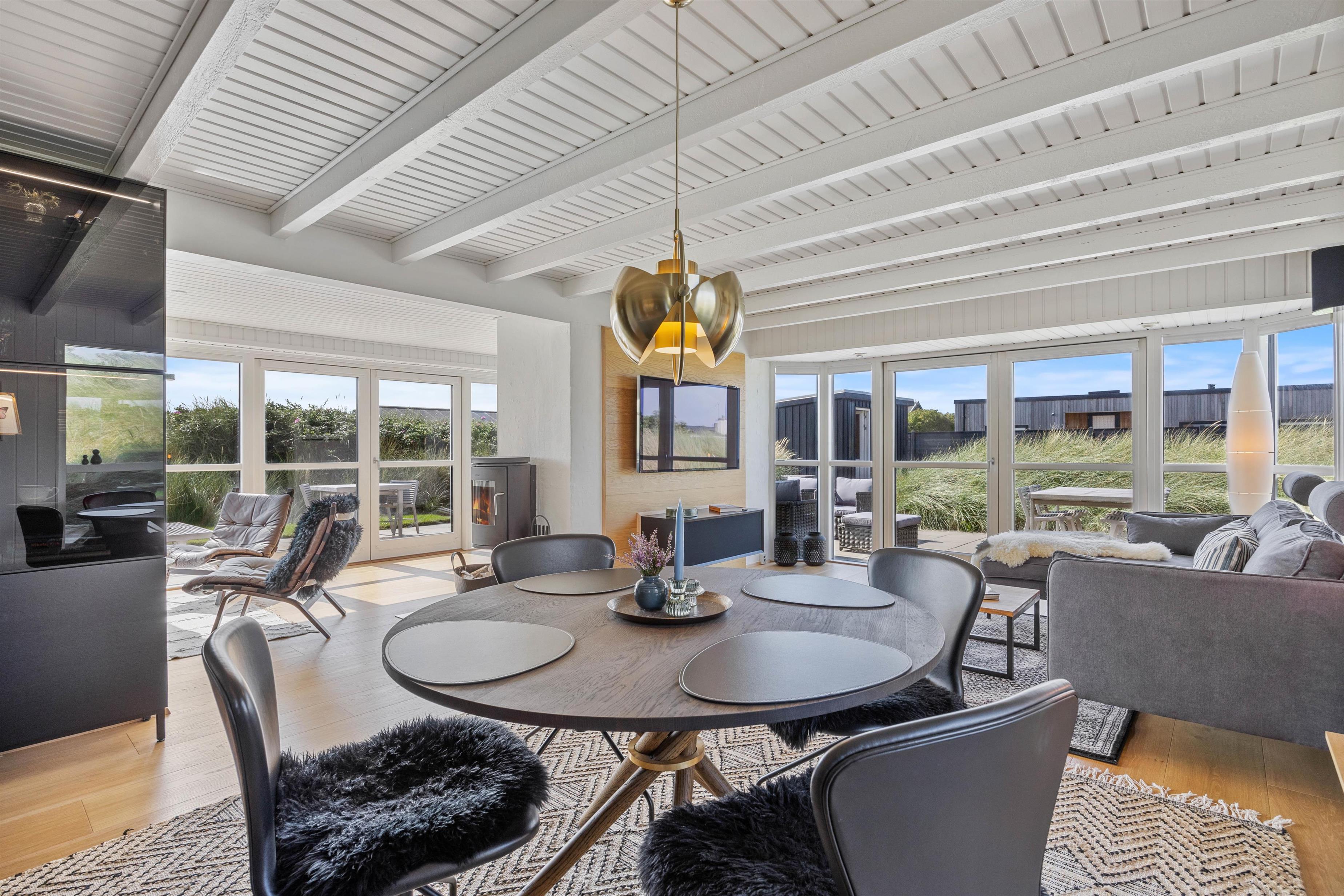 I stuen sørger de store vinduespartier for masser af lys, især på de solrige dage. Her finder I også brændeovnen, som er god på de kolde dage – her sørger de knitrende flammer for både varme og ægte somerhushygge, når regnen slår på ruden udenfor.