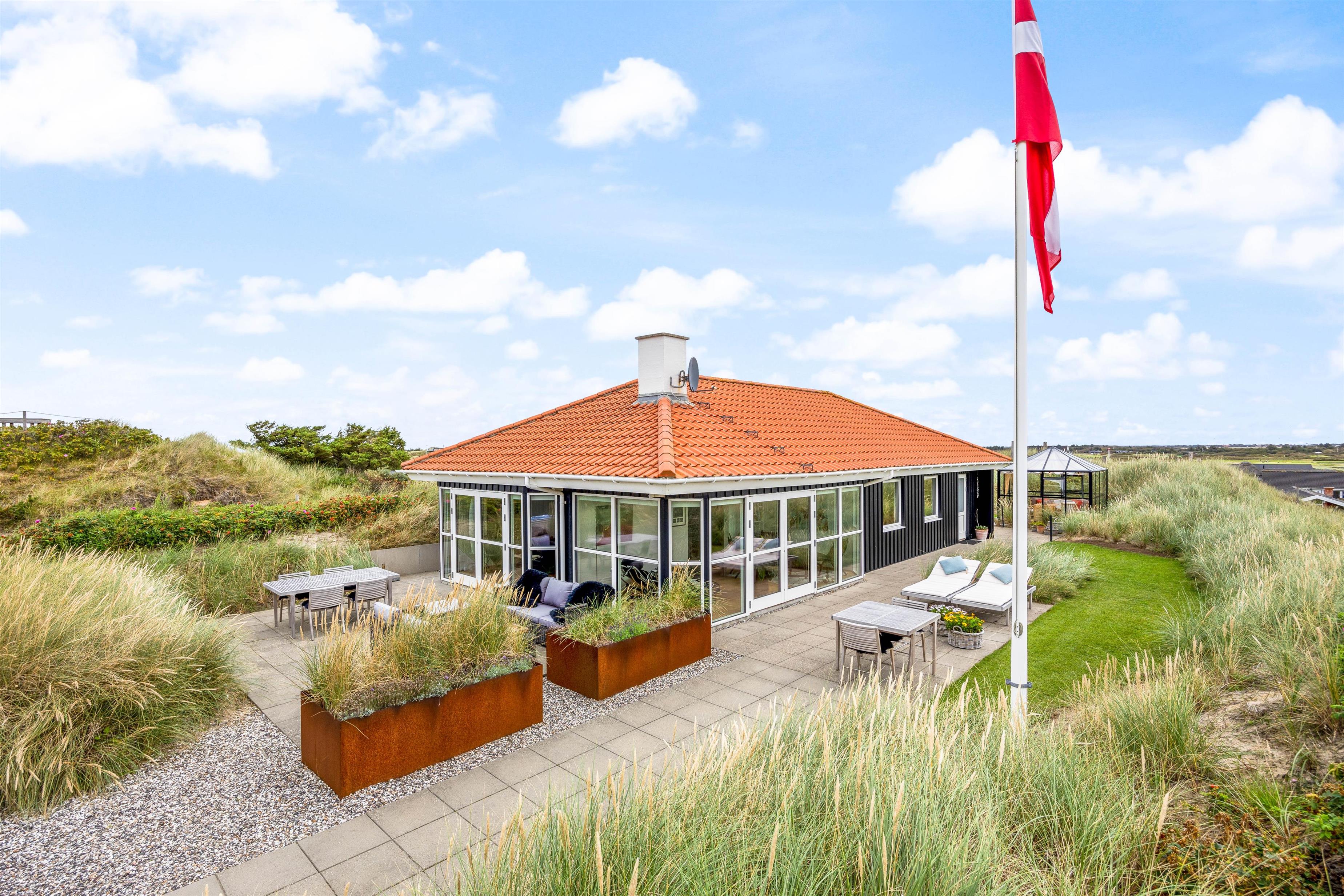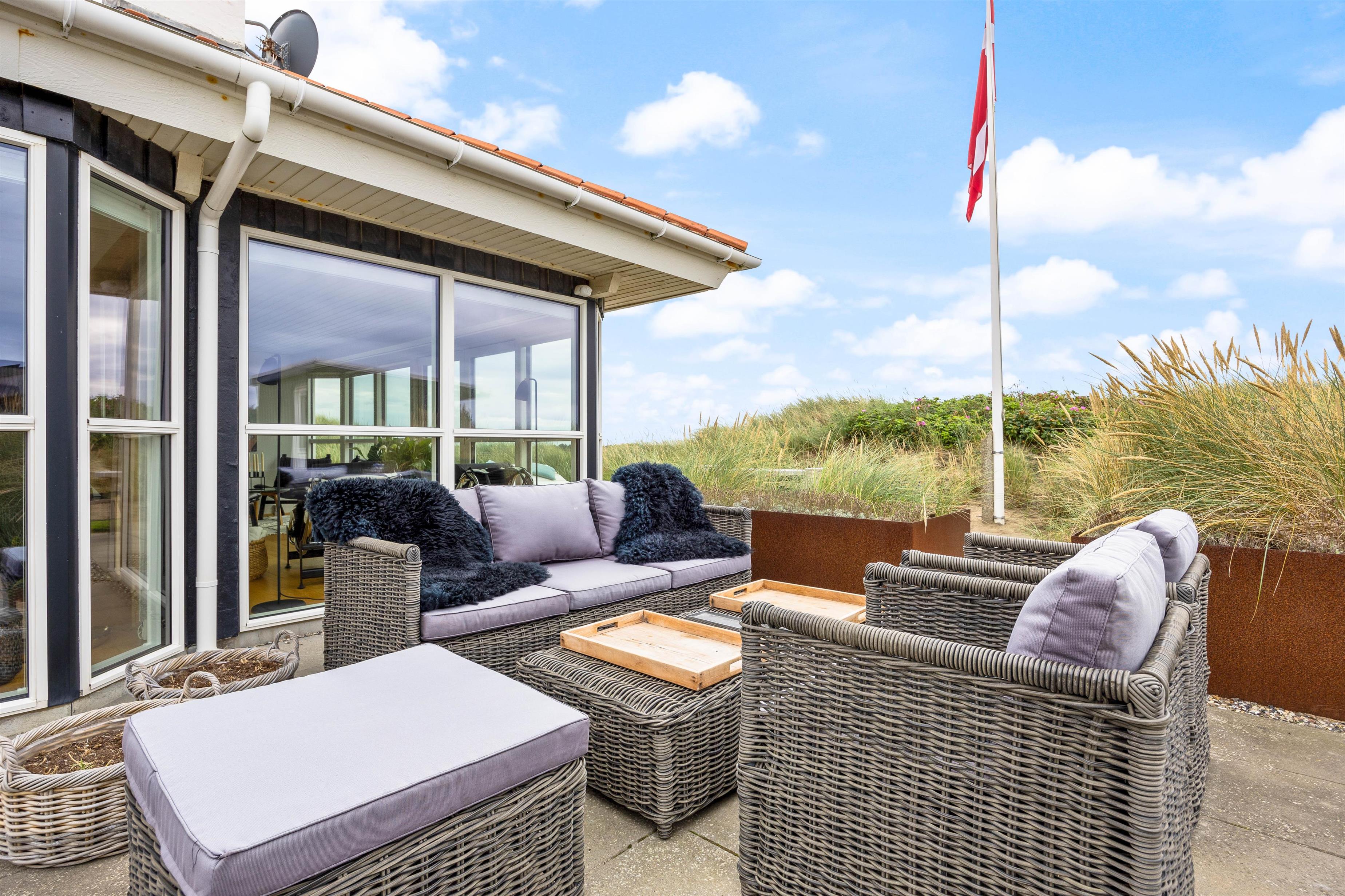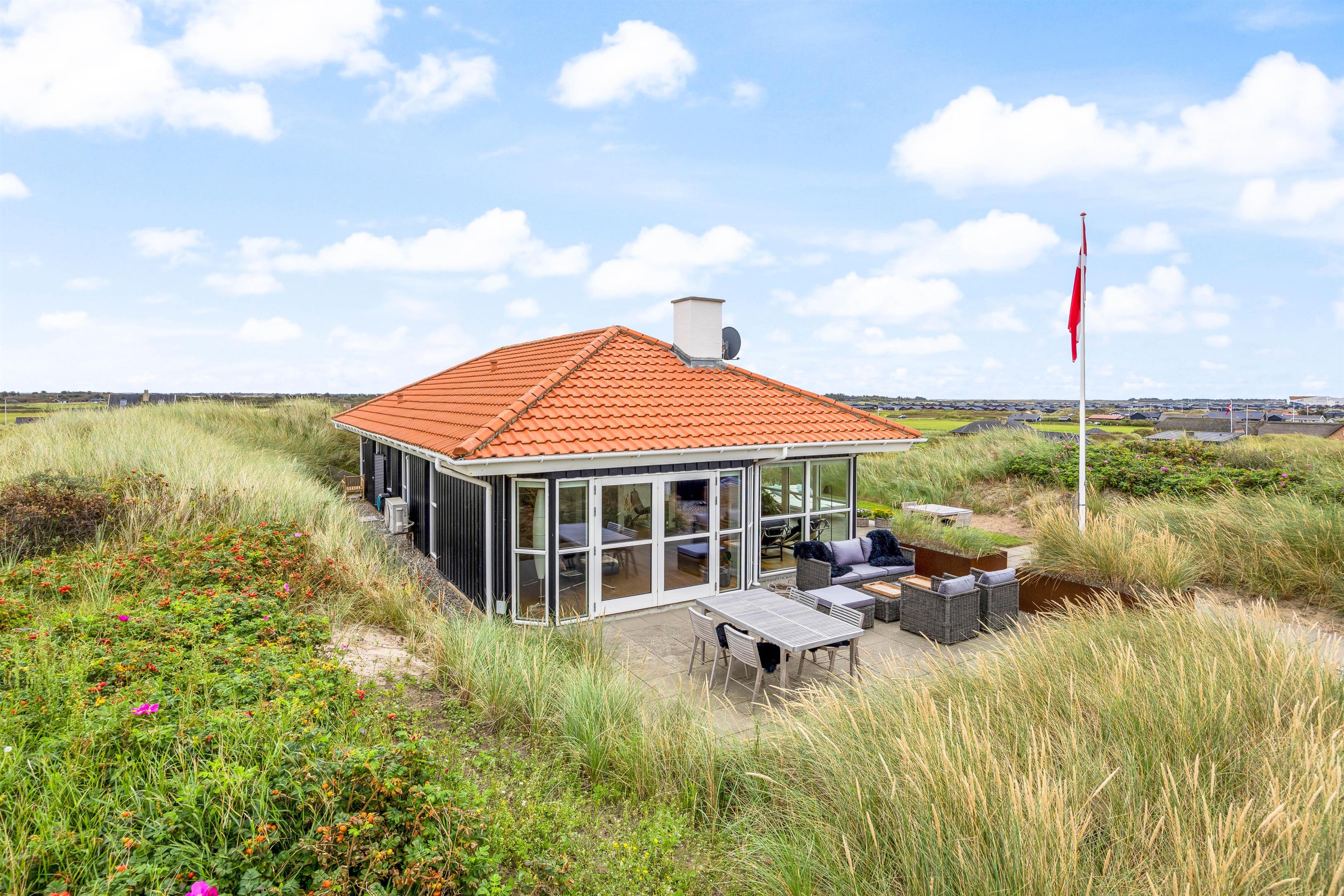 Ferieboligen på Holdvej 30 har en fantastisk udsigt fra de store vinduespartier. Her er en dejlig udsigt ud over klitterne mod havet og fjorden.